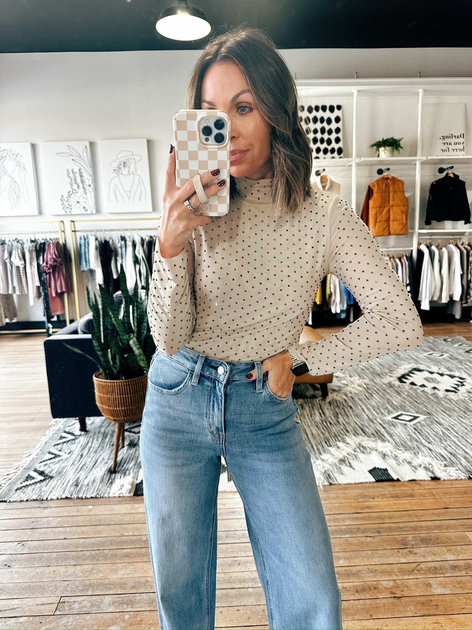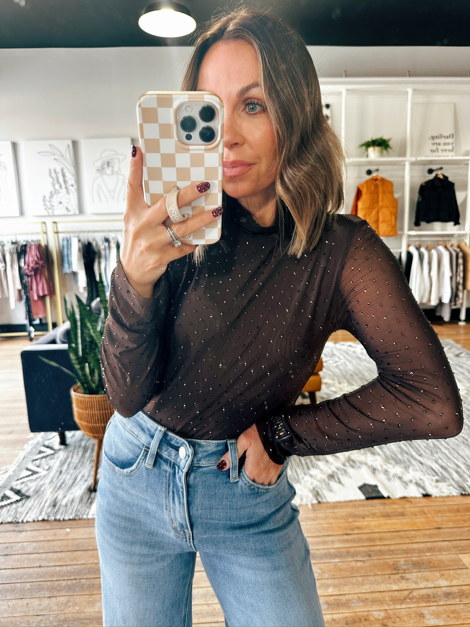 Add a little sparkle to your look with the Aldora Sparkle top! This mesh style long sleeve top fits true to size and is a fitted style that works great tucked with denim, dress pants or skirts. This has semi-sheer sleeves but a lined body, so no worry about coverage.