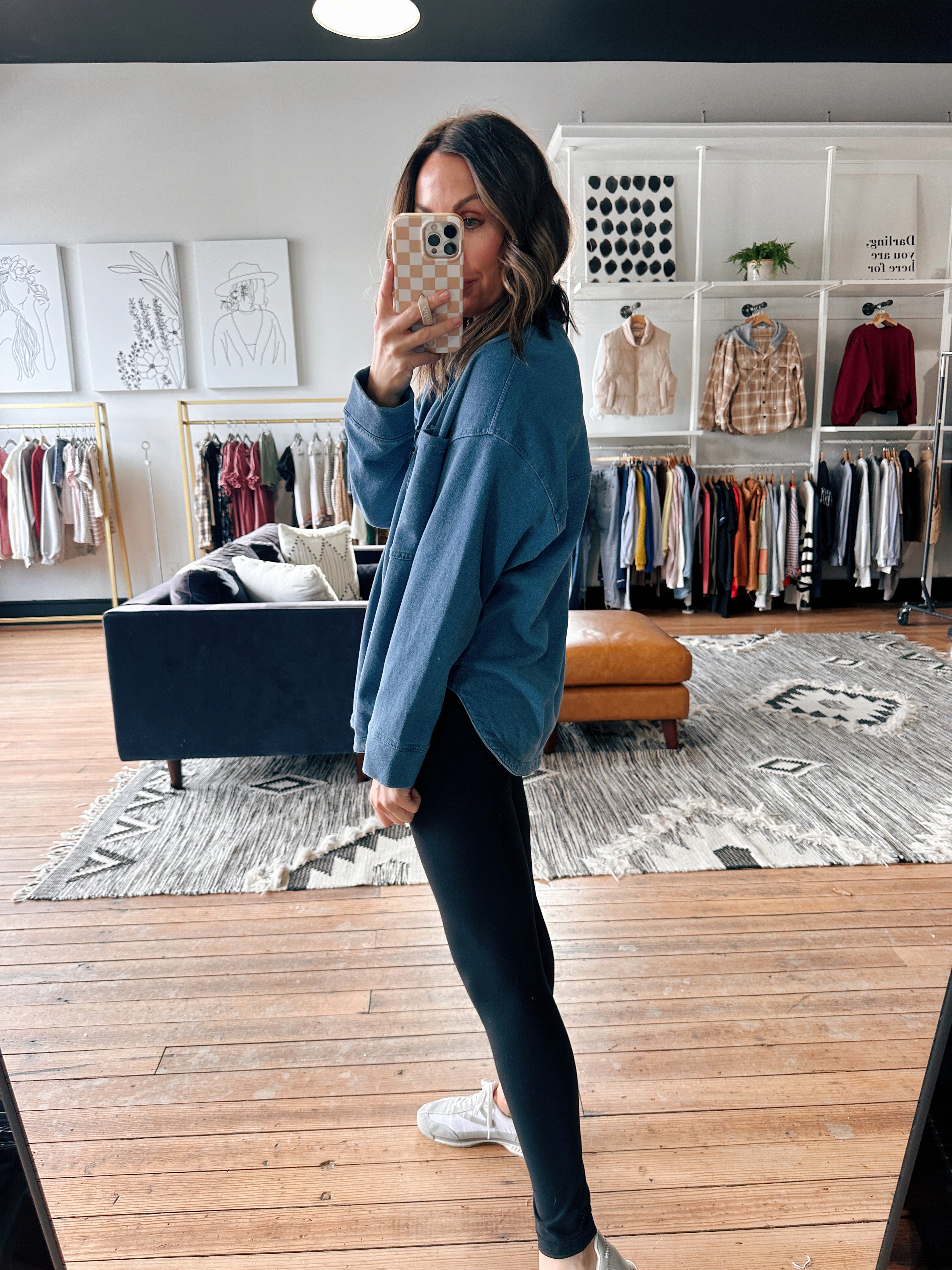 This fresh calypso blue indigo wash adds a lighter, laid-back feel that pairs beautifully with neutrals, whites, florals, and graphic tees. Whether you’re heading to school drop-off, running errands, or meeting friends for a casual lunch, this jacket moves with you and layers easily without feeling stiff or bulky.