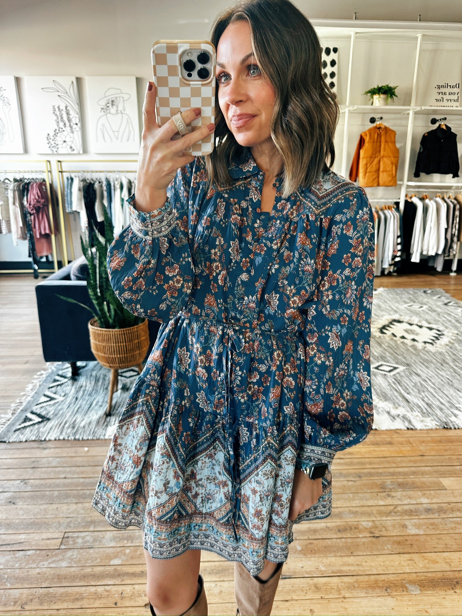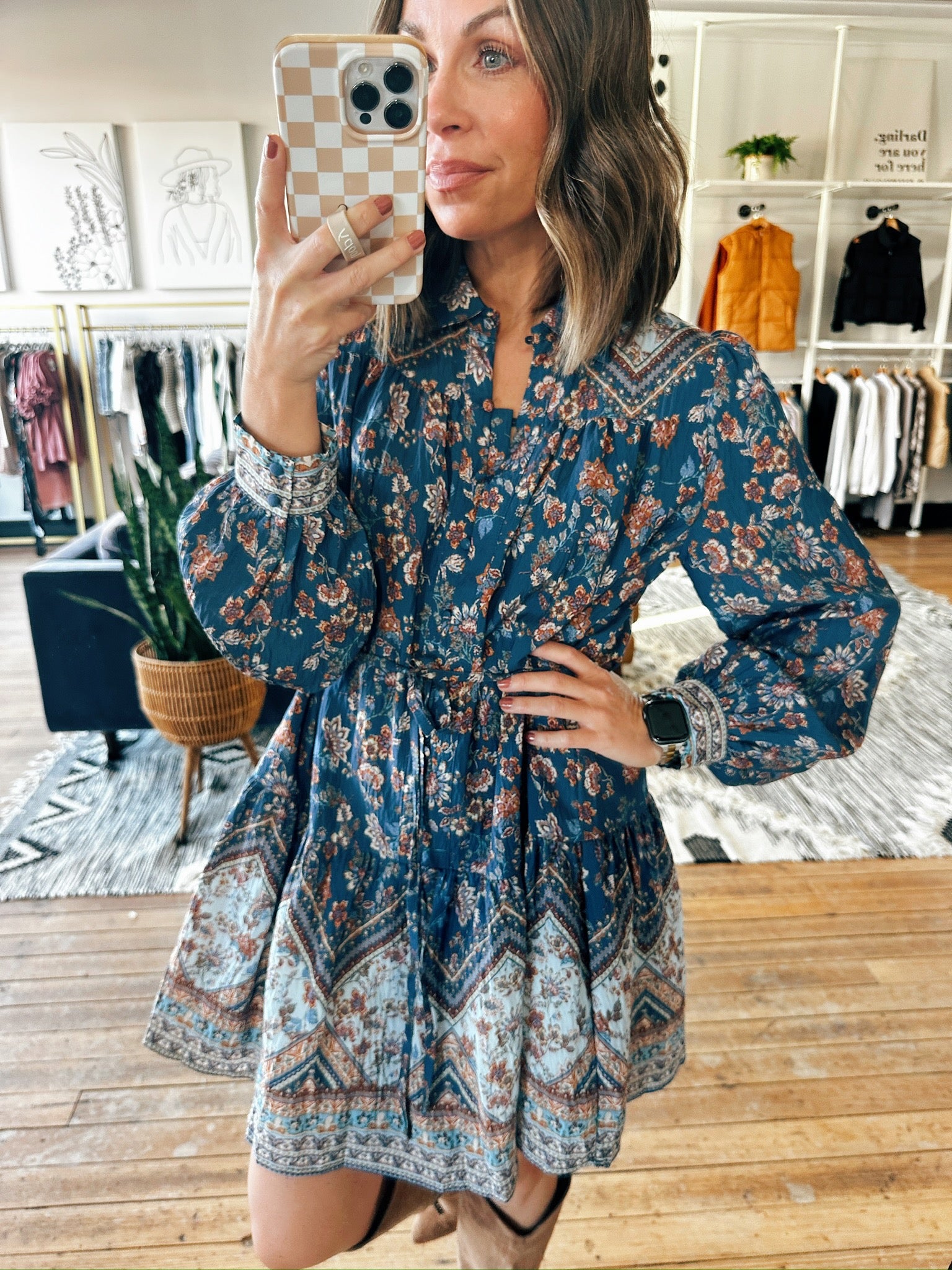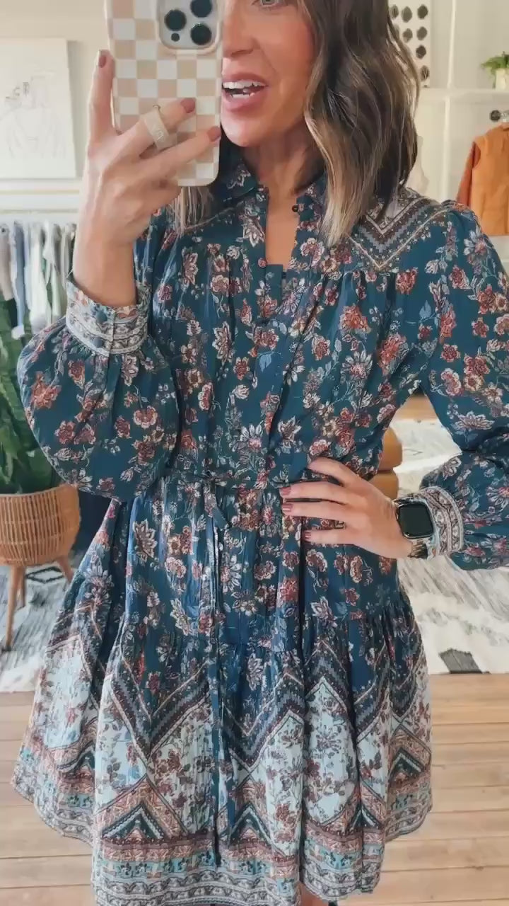 Elevate your wardrobe with the Aureli Border Print Waist Dress, a perfect blend of boho charm and chic elegance. Designed for women's fall fashion, its delicate details and flowy style make it ideal for fall events or work. This versatile dress offers timeless style and comfort, enhancing your seasonal wardrobe with effortless sophistication.