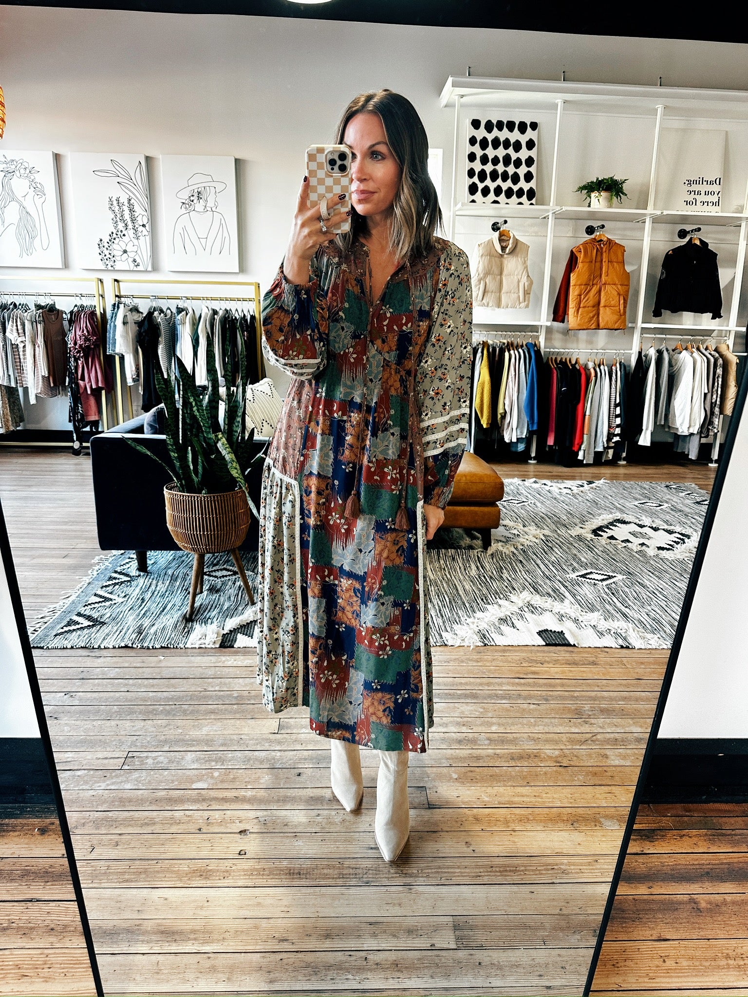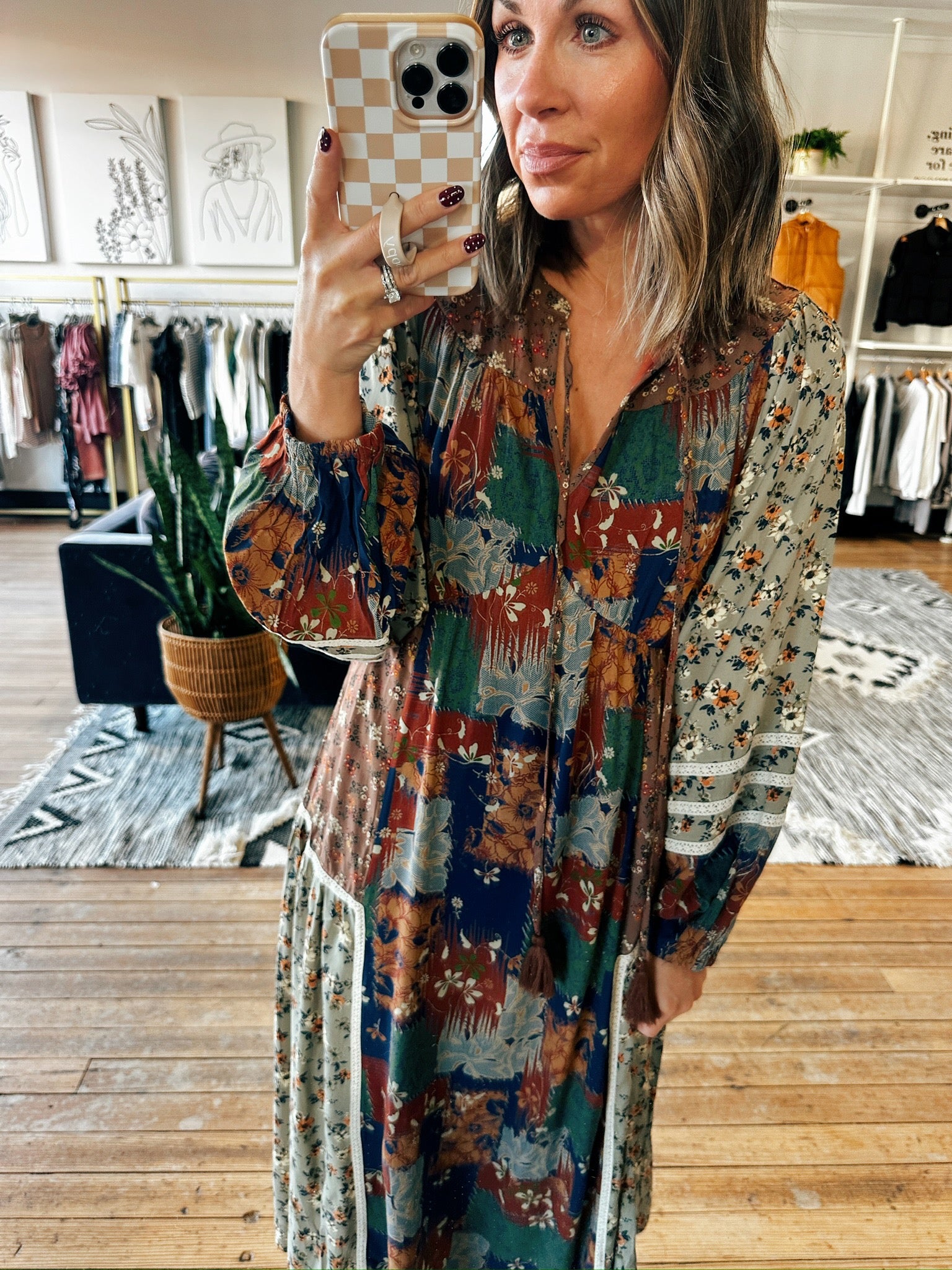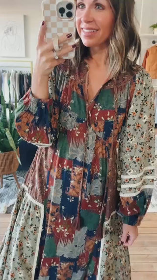 This is the most beautiful boho dress for the fall season! It fits true to size with a flowy style and midi length. It has a v-neckline with fun balloon sleeve detailing. We love the patchwork print with the perfect fall palette of colors that will be great for family photos this fall!