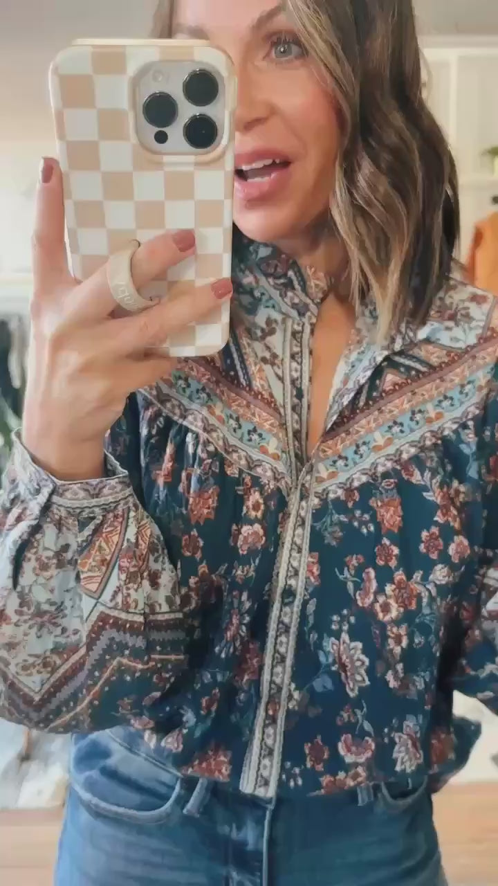 Looking for a great fall print and color palette? This is the blouse for you! This fits true to size and is a lightweight flowy material. It has buttons down the front and pretty balloon sleeves. This is a perfect option to throw on with dress pants or denim with a tuck and boots!