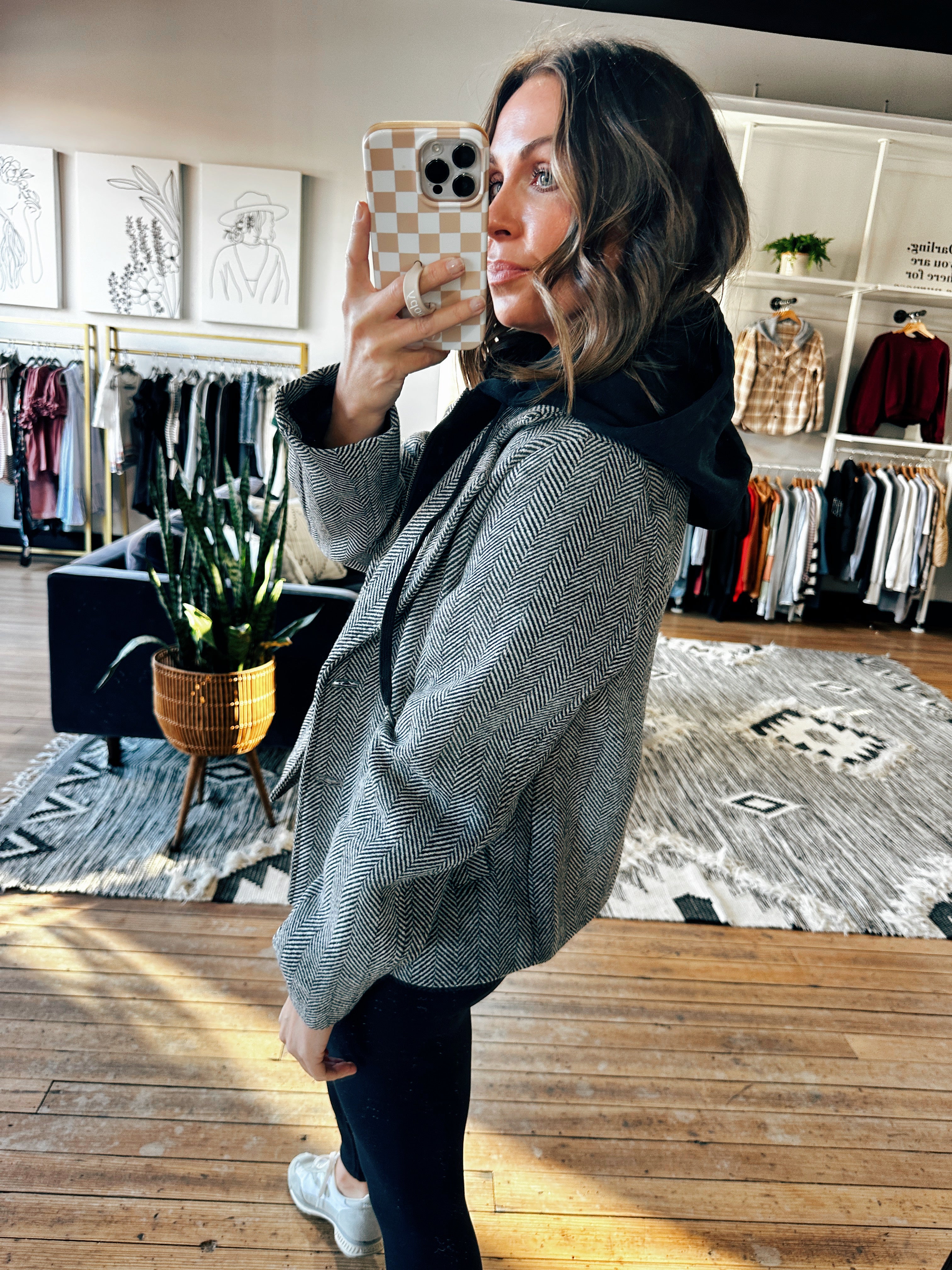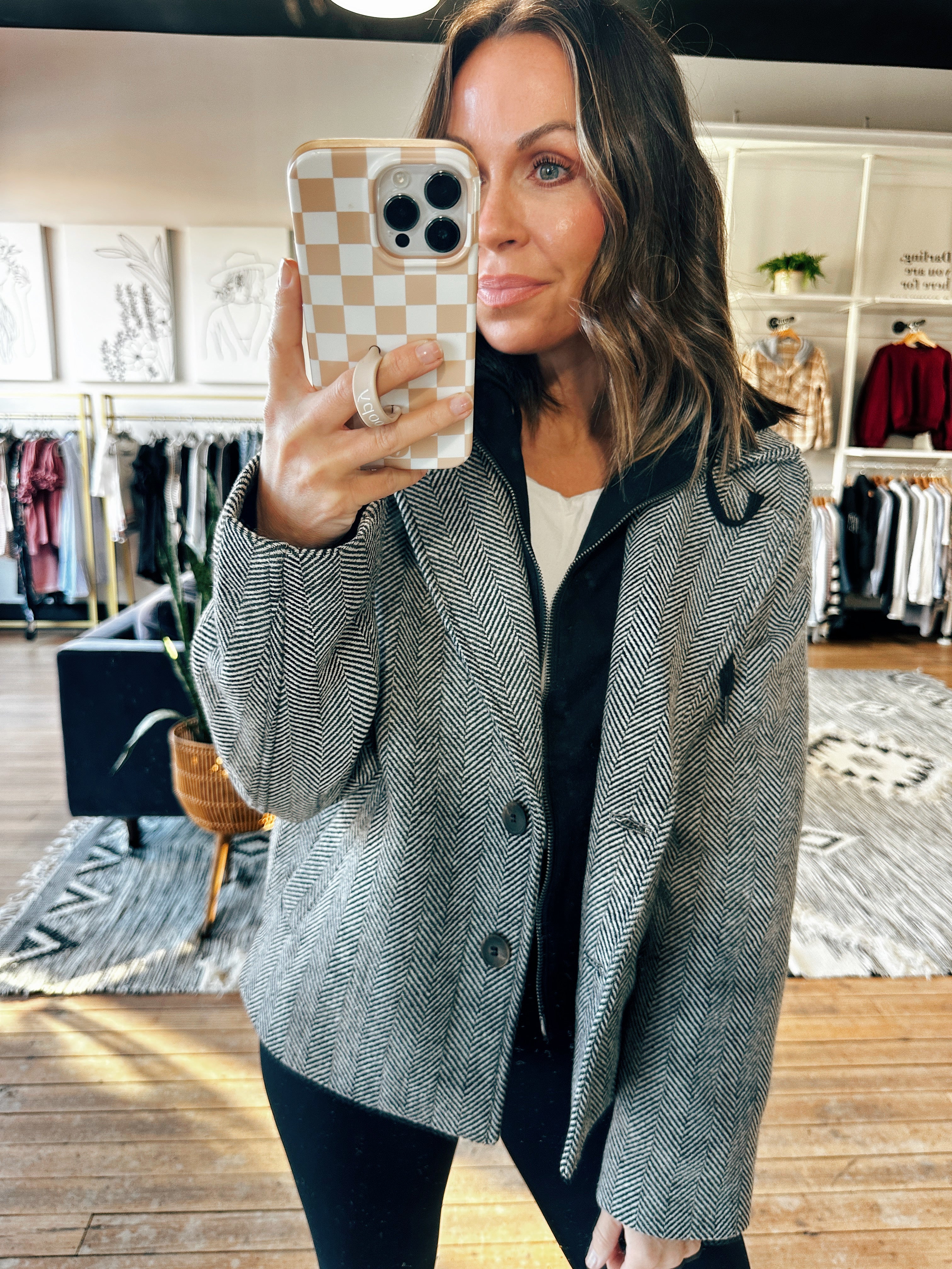 The jackets we have been bringing to VCB this year have been top tier, this one included! This is a chic herringbone patterned jacket with zip closure and hood. This fits true to size and is a fun option to throw on this fall season!