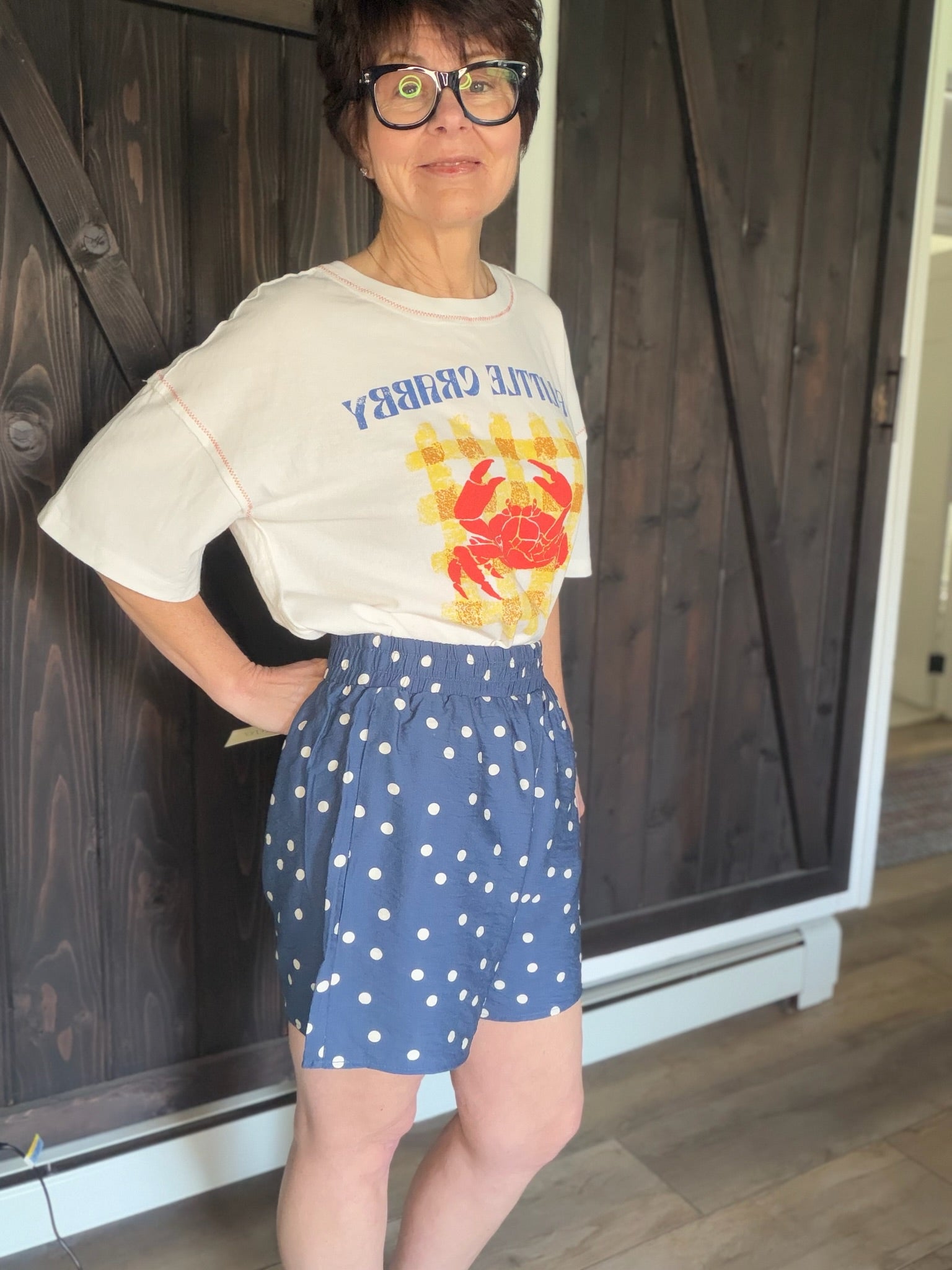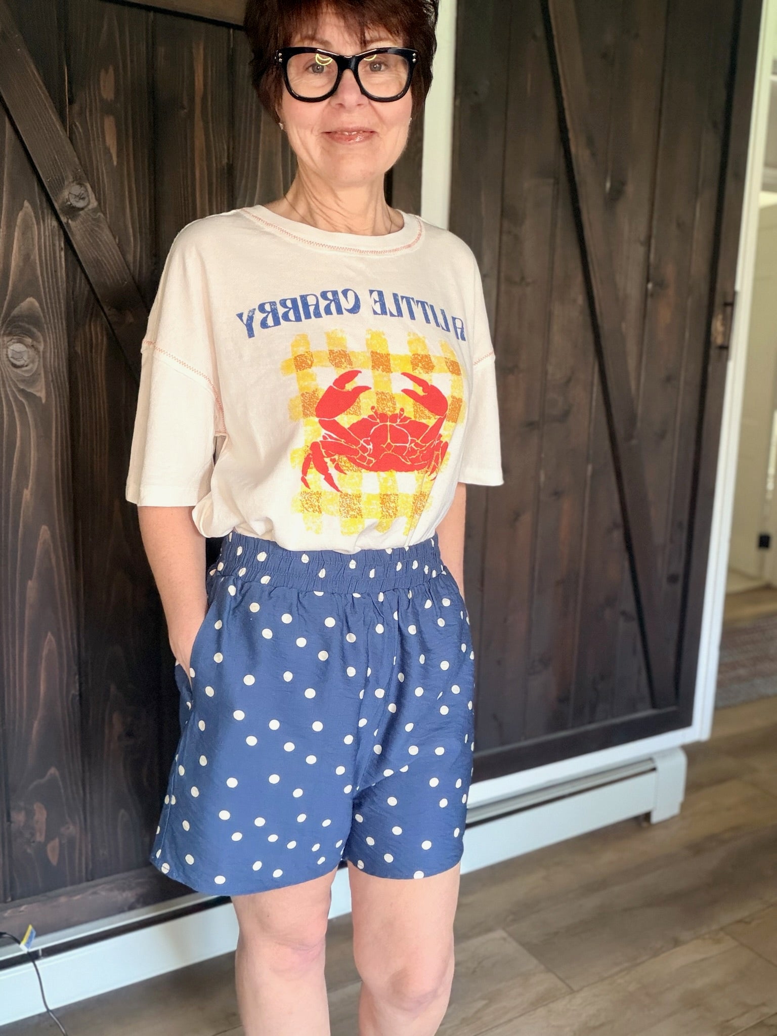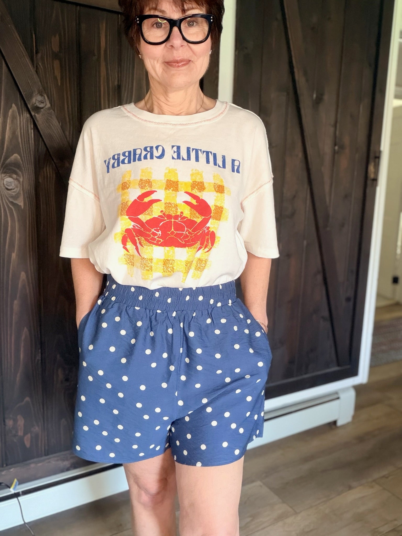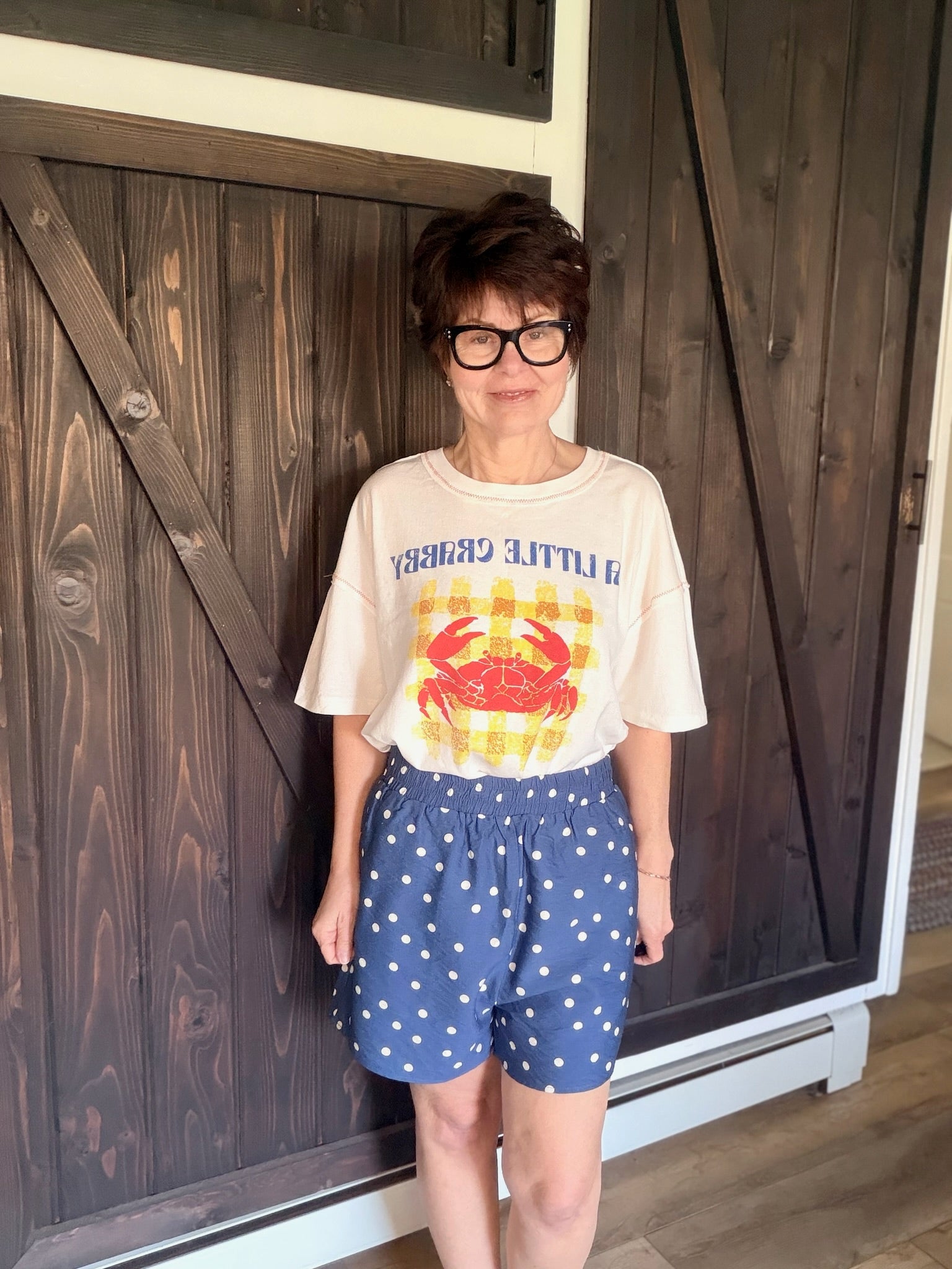 The She & Sky Woven Polka dot Print Shorts are a beautiful lightweight woven polka-dot short featuring an elastic waist and side pockets, a relaxed summer silhouette, and easy everyday comfort. They fit slightly large with a flattering, breezy shape — perfect for vacations, brunch, or everyday wear. Made from a rayon and nylon blend, this piece feels lightweight for warm-weather styling.