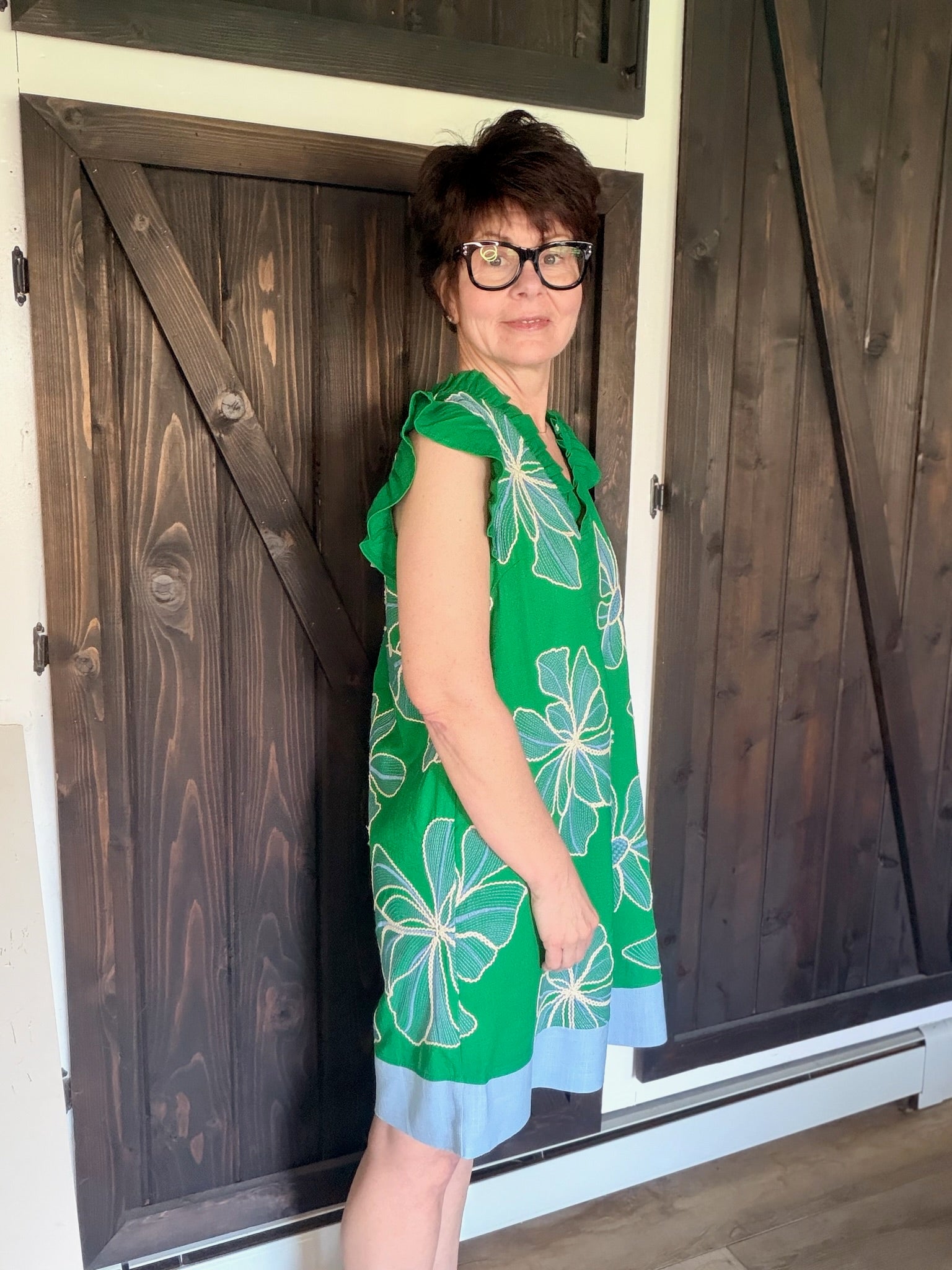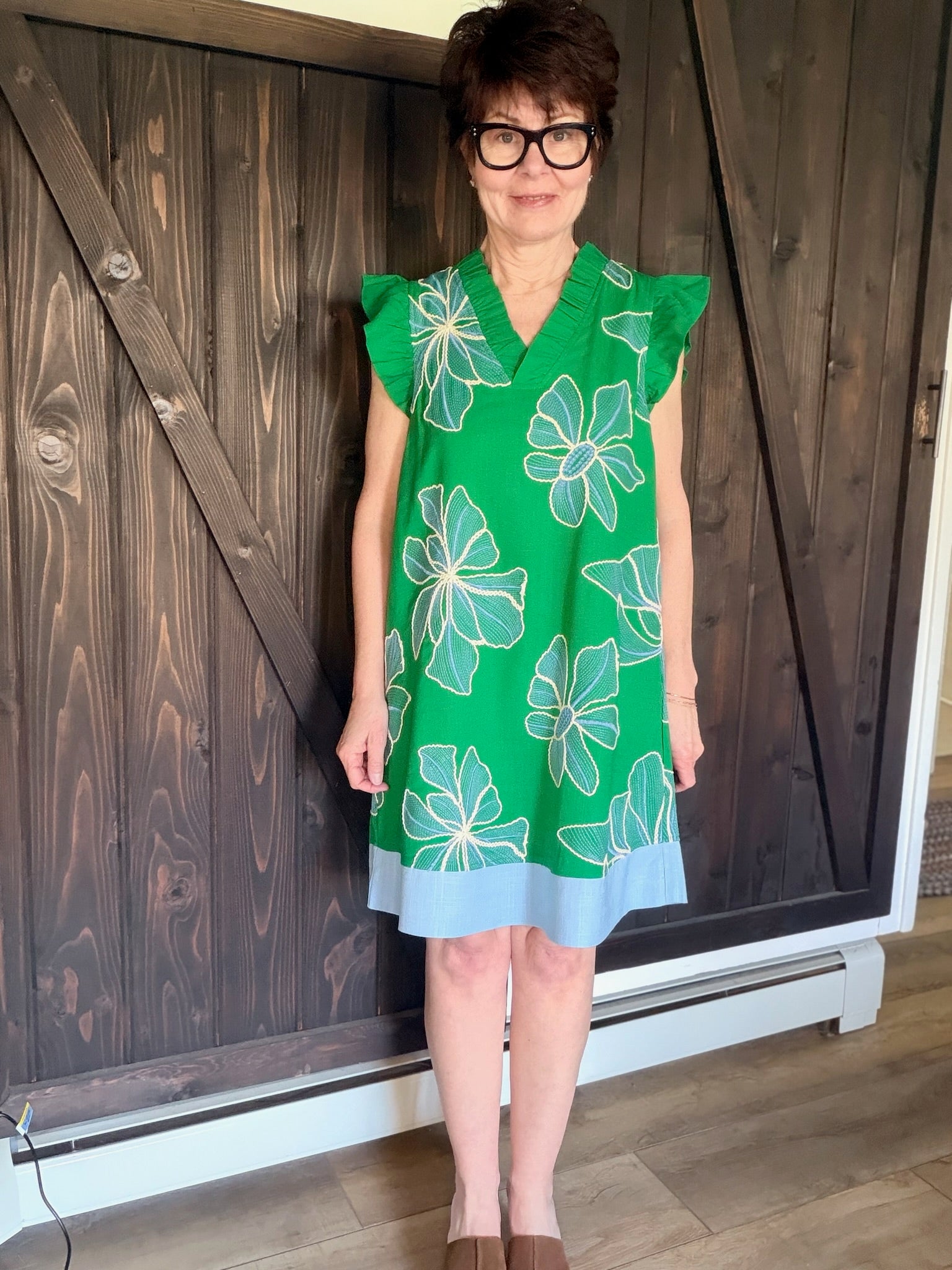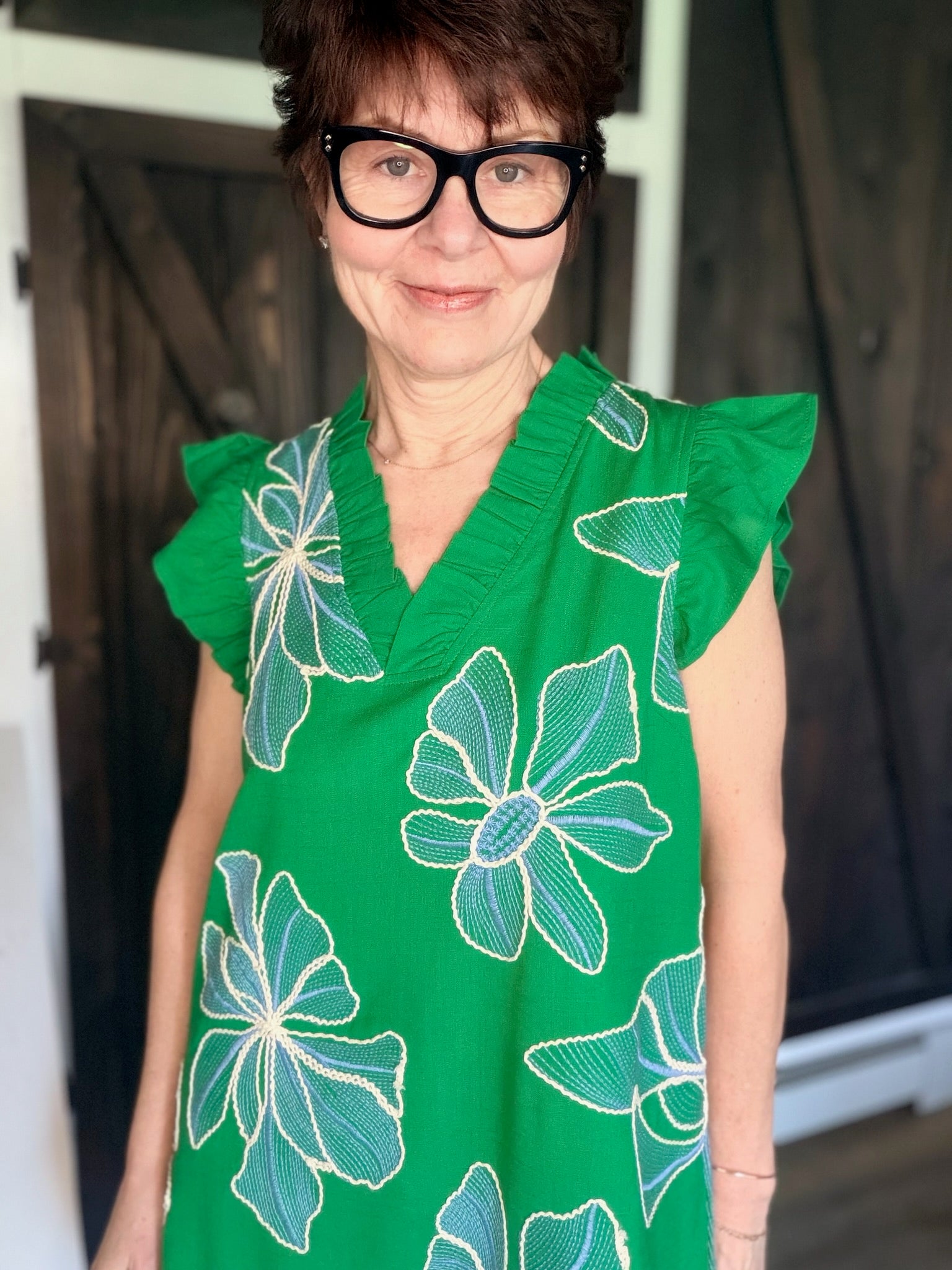 The Voy Luisa Dress is a beautiful embroidered floral print featuring a ruffled v-neck, flutter sleeves, large embroidered flowers and a solid contrast banded hem.  It is designed with a straight, relaxed silhouette.  Fits true to size.  It is lightweight easy to style for everyday wear or that special occasion.