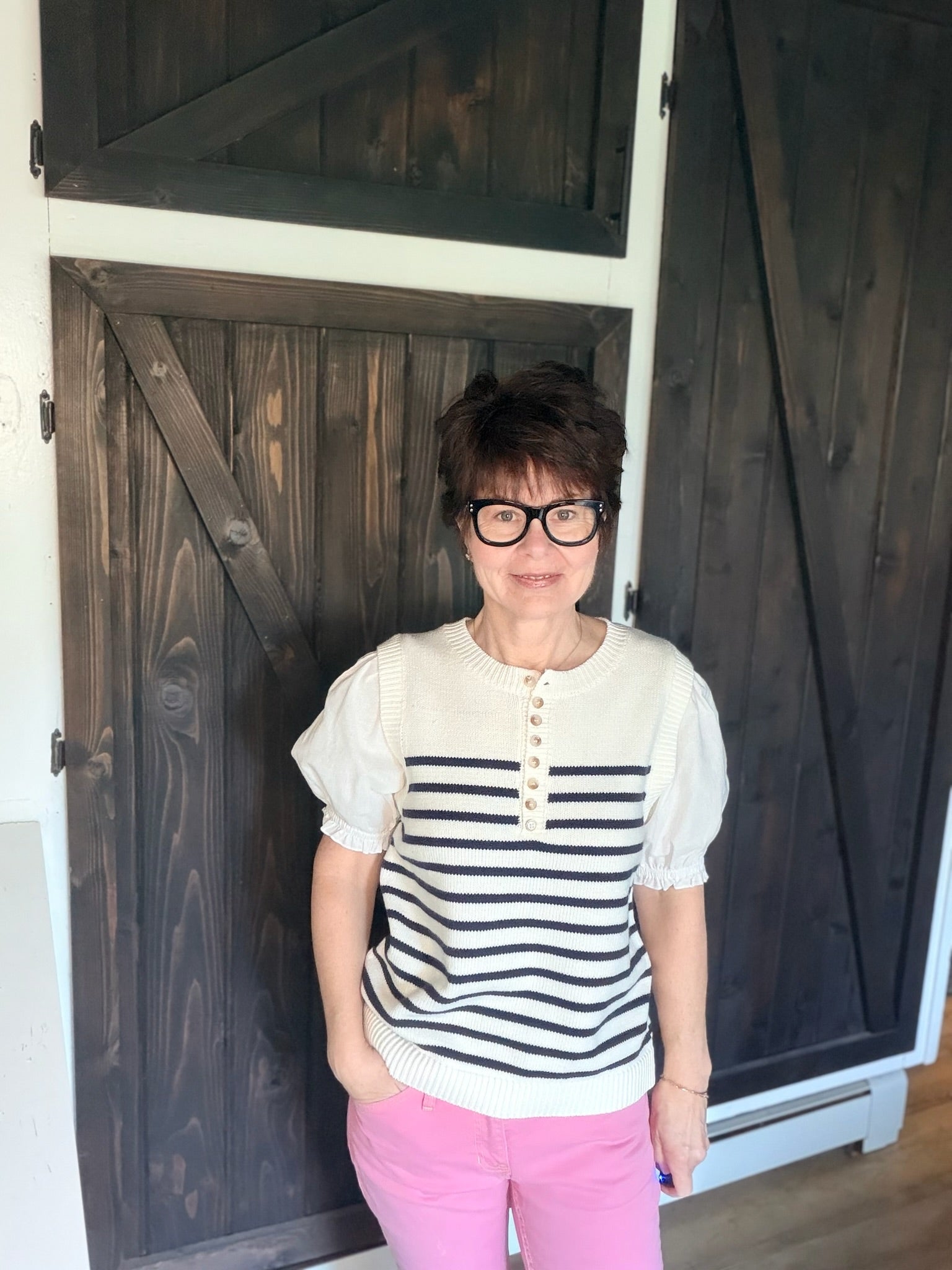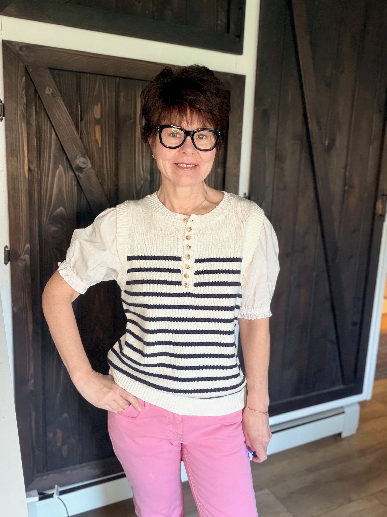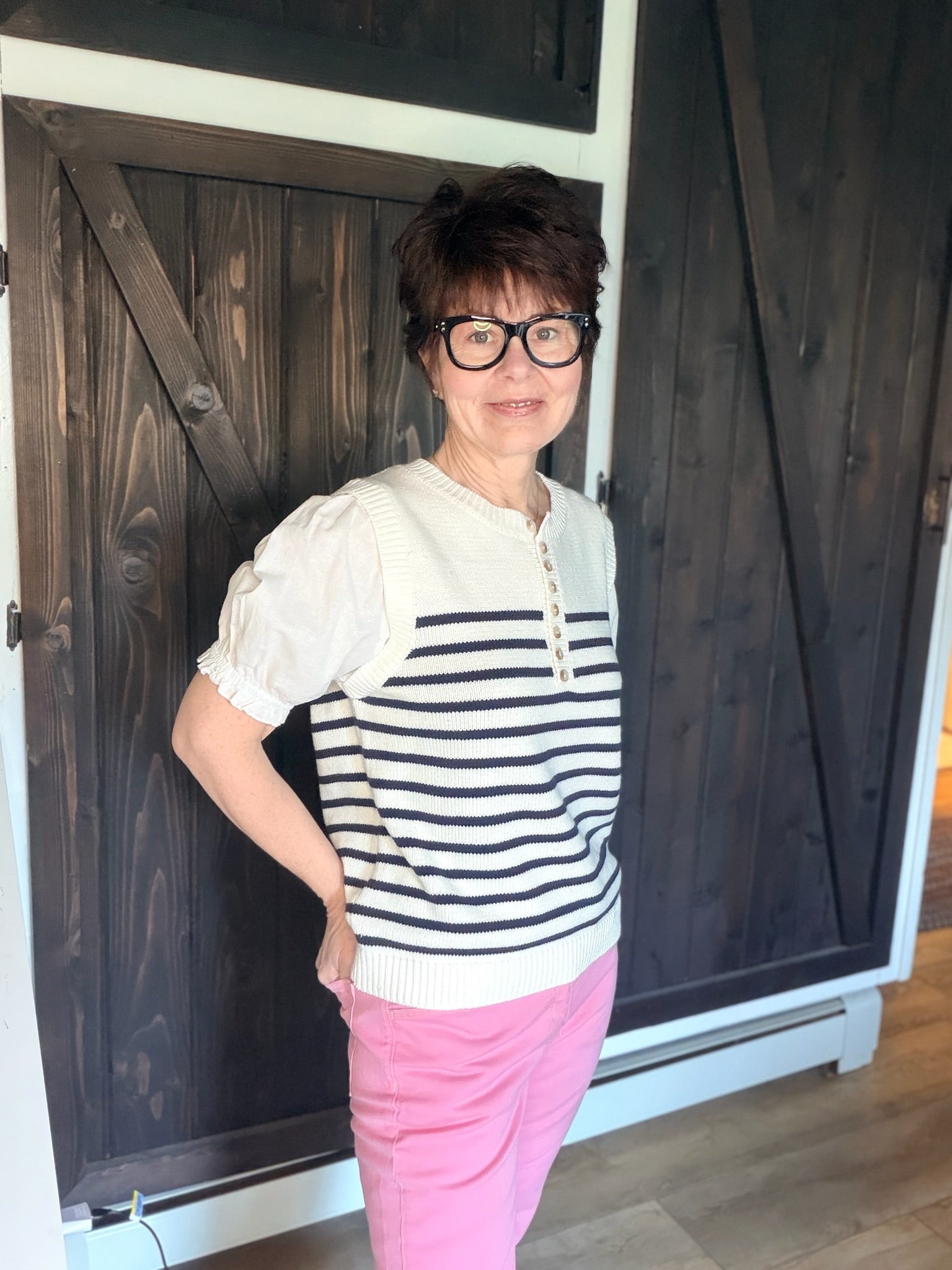 The Sadie Sweater Top is a beautiful mixed media piece featuring a cotton/acrylic blend top in white with navy stripes. Round crew collar with buttons. The three-quarter elastic sleeves are light weight, like a cotton/linen material — perfect for everyday wear, travel, or casual outings. The fit is slightly oversized.