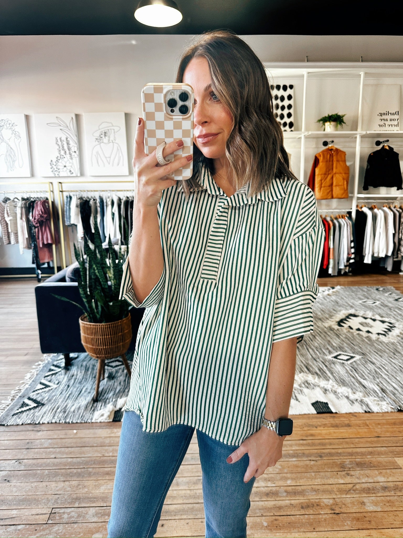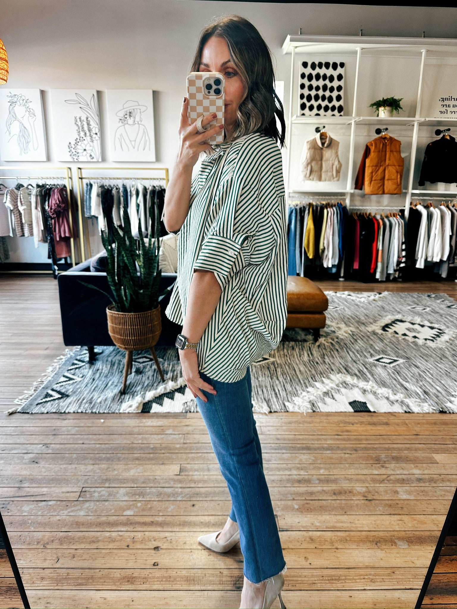 This is a green and white striped blouse that will be perfect for transitioning into the fall! This is a relaxed style blouse with a v-neck and collar, plus 1/2 length sleeves. It fits true to size and is a slightly more structured material for pairing with denim and mules or boots!