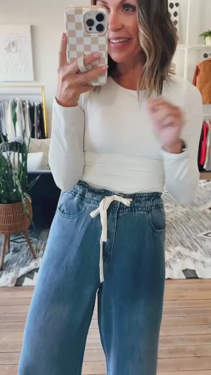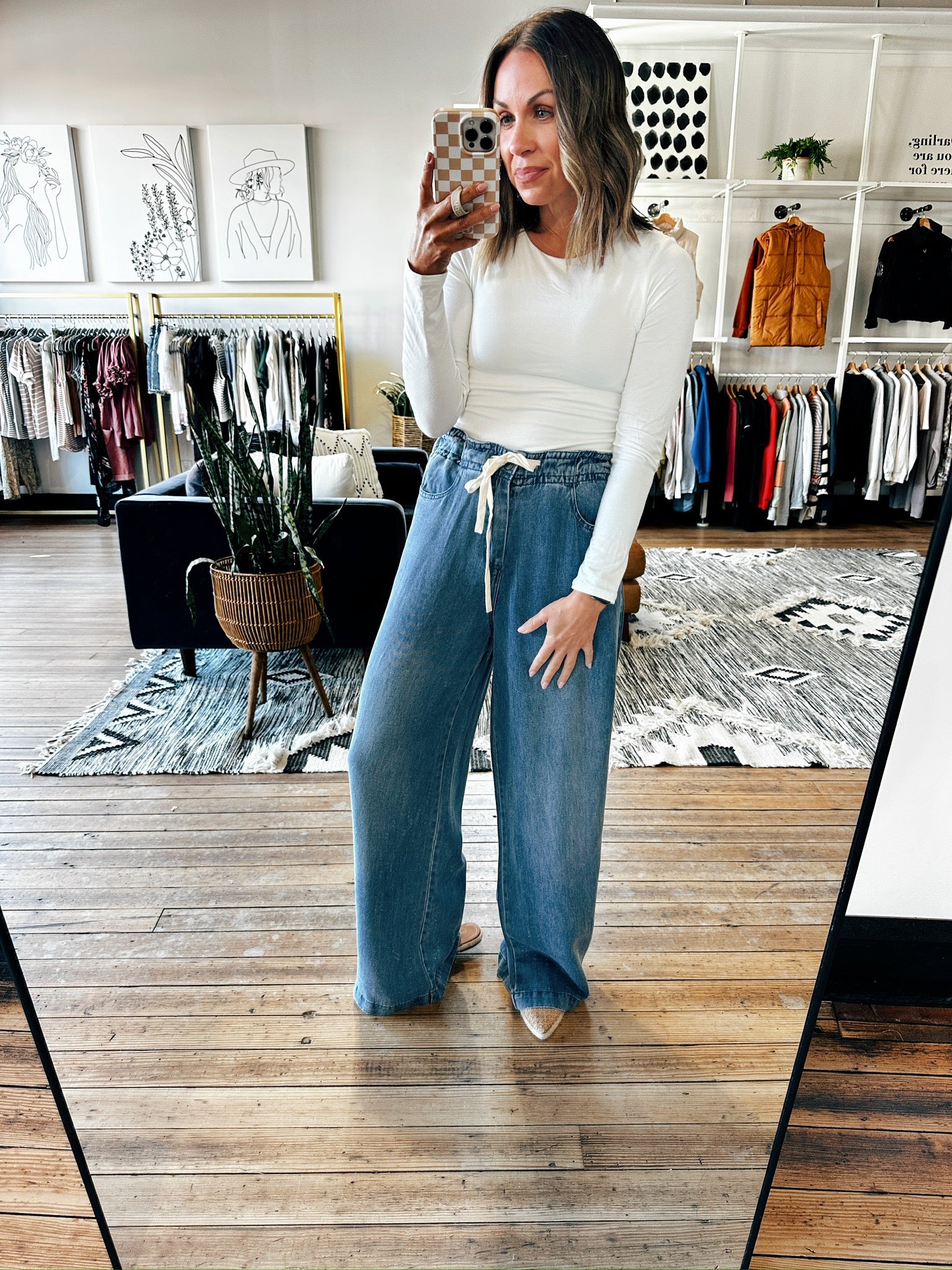 Relaxed, effortless, and endlessly versatile — the Austin Pants are the ultimate laid-back staple for women who love comfort without sacrificing style. Made in a soft light wash denim, these wide-leg pants feature a drawstring waist for an adjustable fit and a flowy silhouette that moves with you.