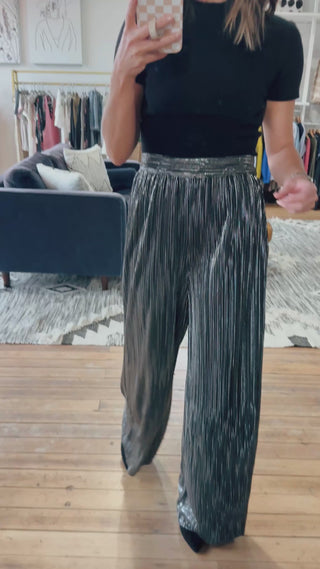 Perfect for the holidays or events, these metallic pleated relaxed fit pants bring shimmer and ease to your wardrobe. Lightweight, soft, and just a fun dress pant option.. They fit true to size, if not a touch relaxed, with an elastic waistband and wide leg design.