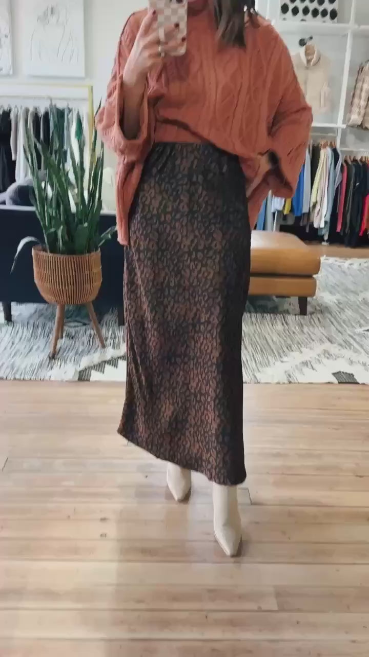 The Leopard Satin Skirt is a bold and chic wardrobe essential for any time of year! Crafted from smooth, silky satin, this skirt features a timeless leopard print and a flowy silhouette for effortless movement. Perfect for day-to-night styling, it pairs beautifully with sweaters, blouses, or bodysuits, and it fits true to size.
