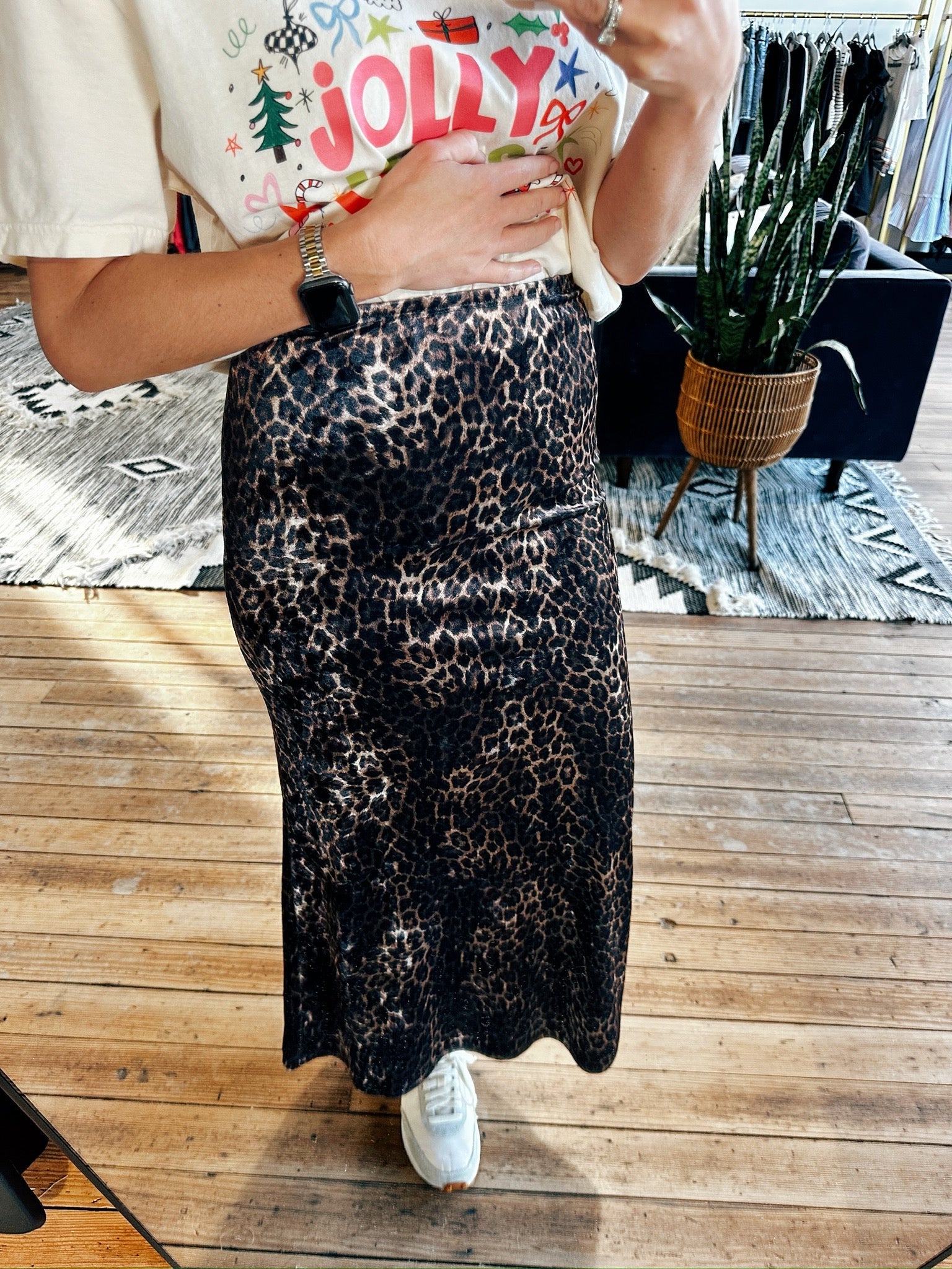 Leopard print is truly a staple in our book these days, so when we saw this velvet leopard skirt, we knew it was perfect for your fall wardrobe! This skirt is a midi length, with a true to size and lightly fitted and flared style. Pair with a graphic tee, sweater or bodysuit!