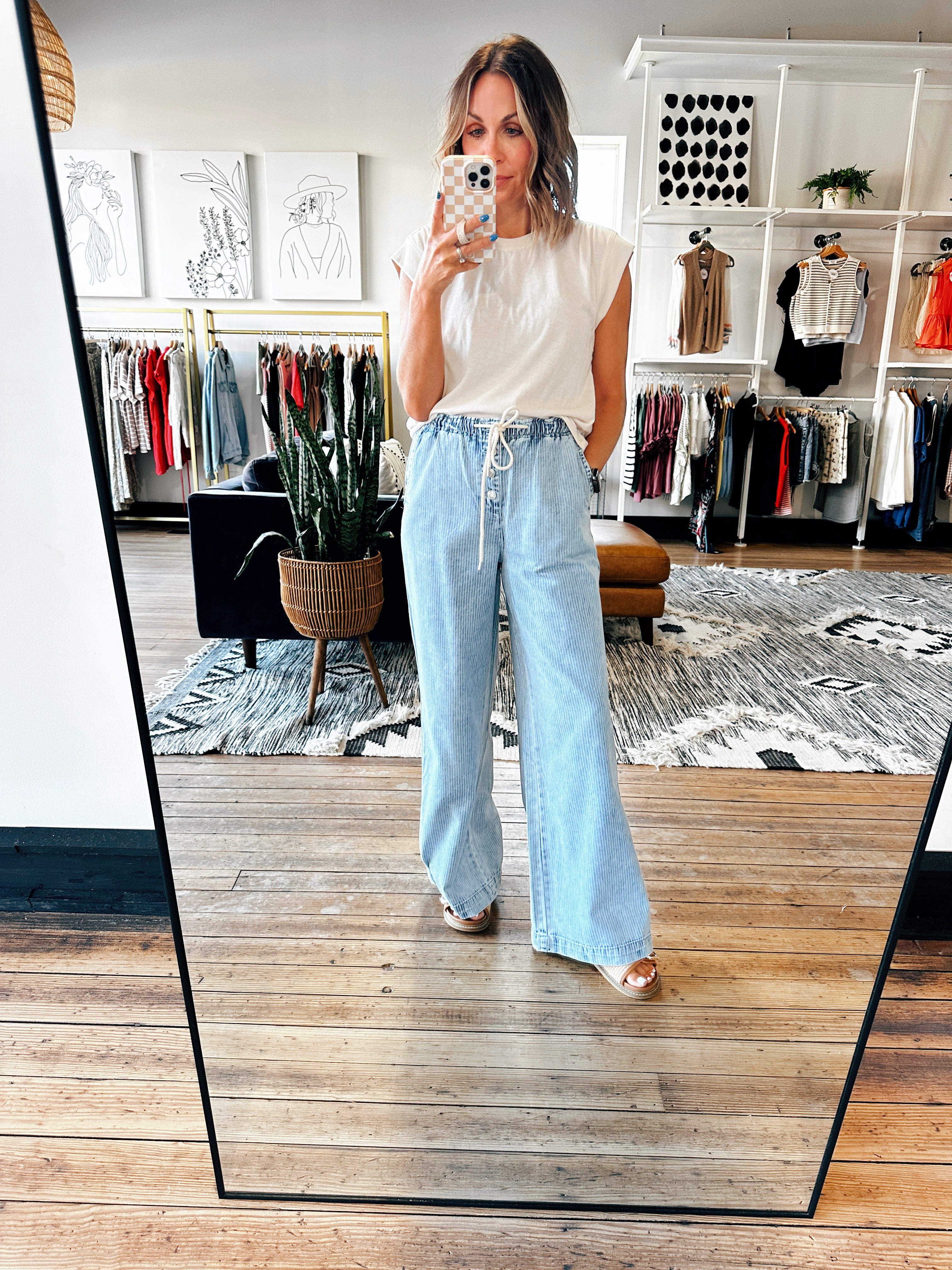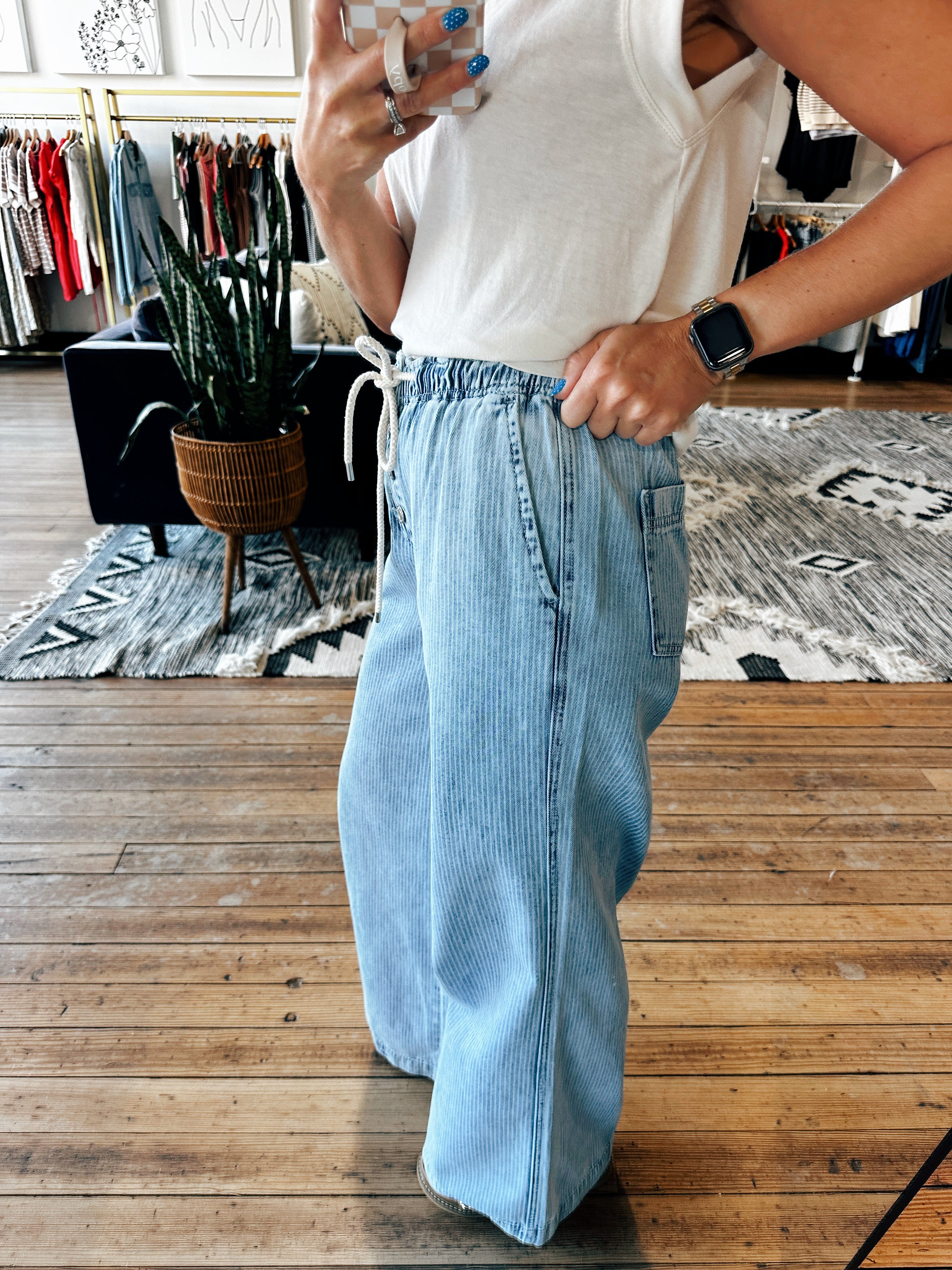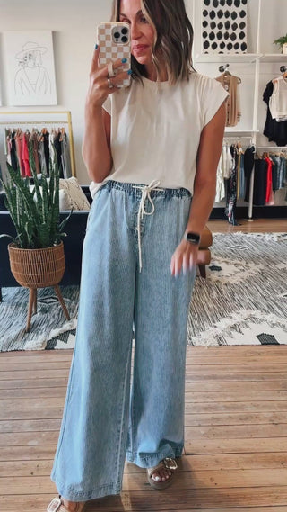 These casual jeans are the trend of the season! They are a light wash denim with a wide leg style and drawstring waist. They fit true to size and are cute and casual option for tons of outfits!