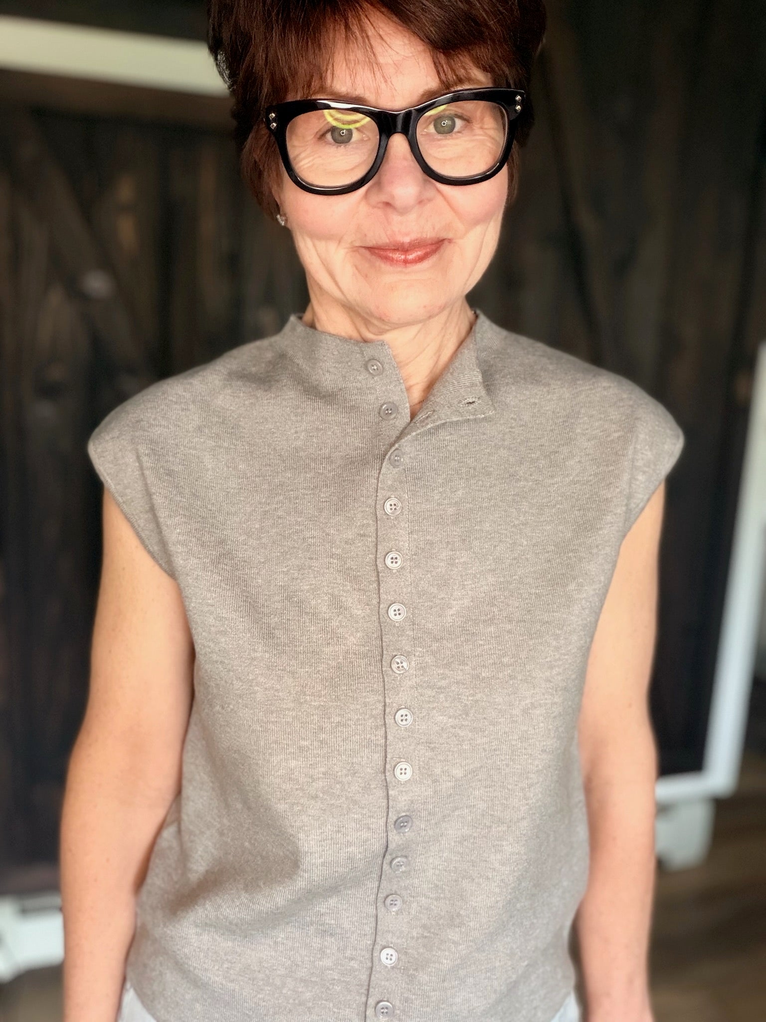 The Things Between Emilie Top is a beautiful soft lightweight knit cap sleeve mock neck featuring a classic minimalist silhouette, a comfortable everyday fit, and an easy layering design. It fits true to size with a button-down front — perfect for casual workdays, layering, errands, or everyday wear. Made from a viscose, polyester and nylon blend.