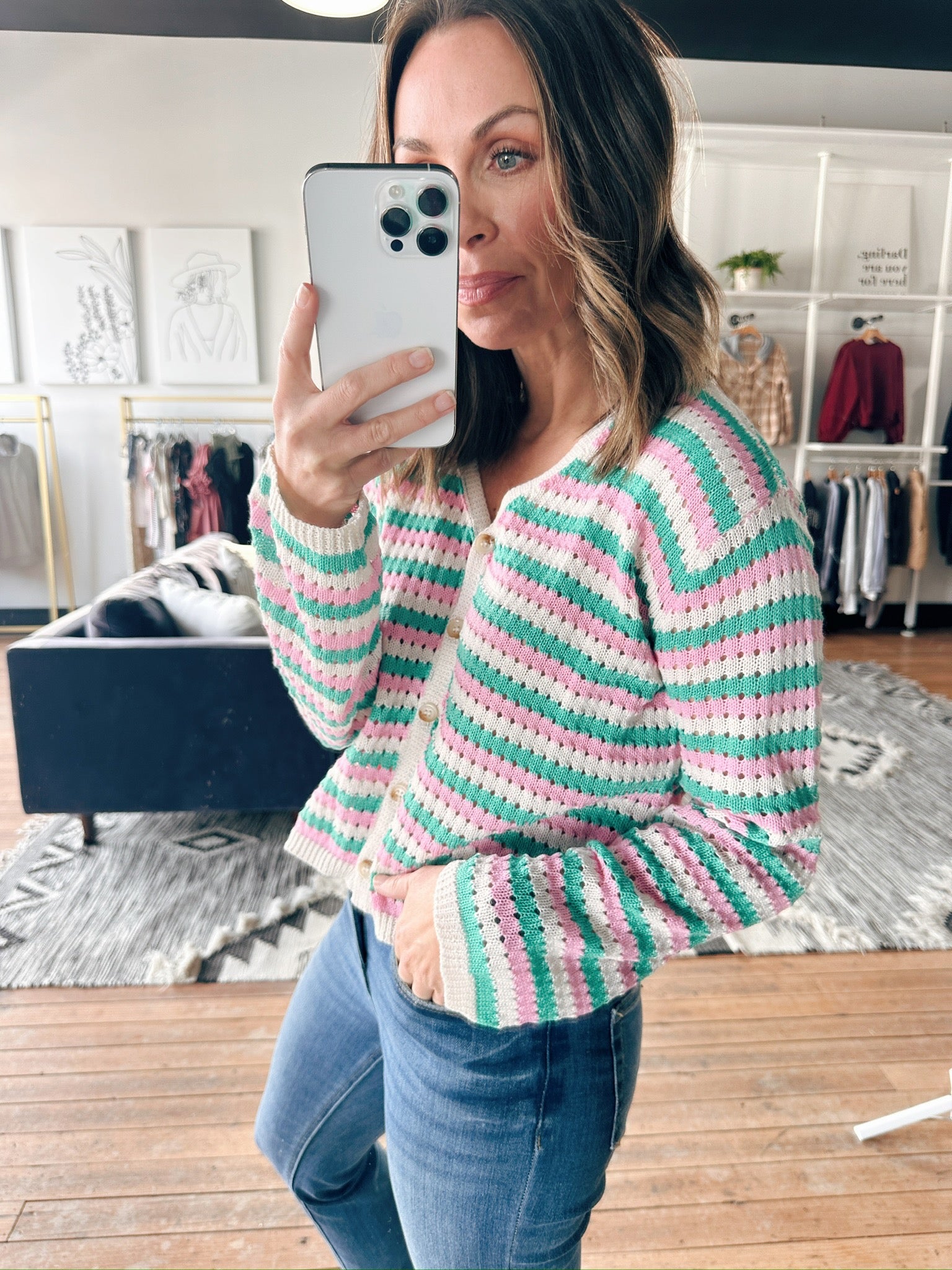 Meet your new favorite transitional sweater! This pretty striped crochet sweater fits true to size with a v-neck, buttons down the front and lightly crop length. Perfect to pair with your favorite denim now and as we head into the spring!