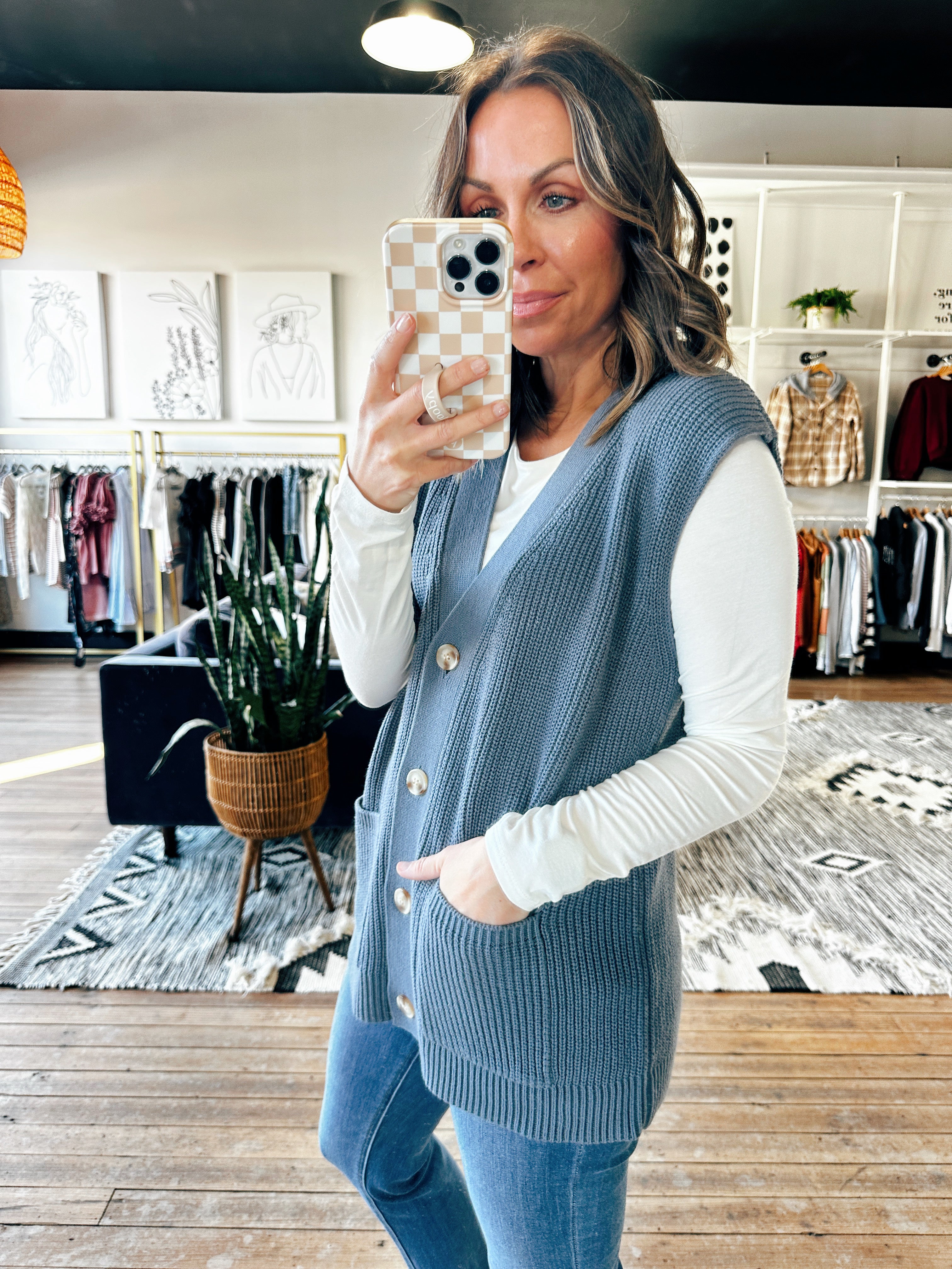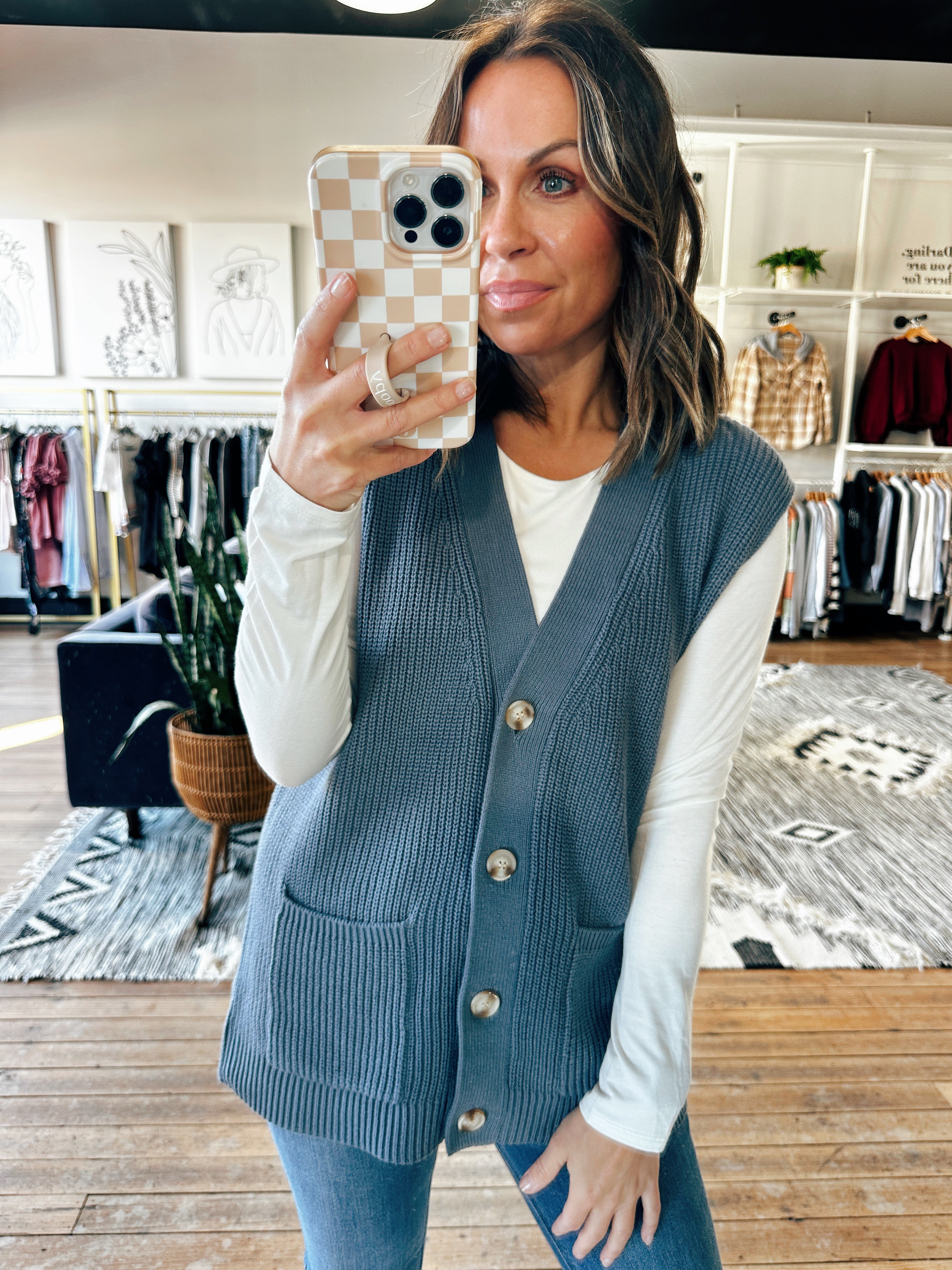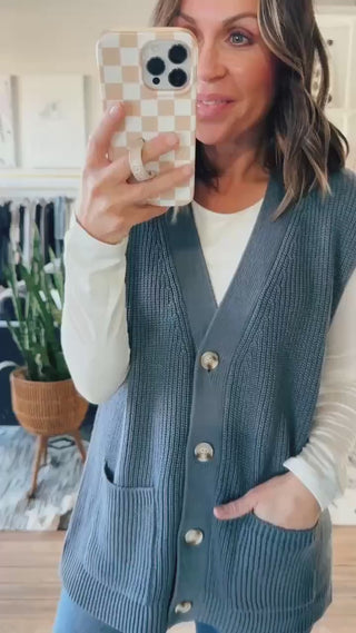 This denim blue vest is a pretty style for layering this fall! This fits true to size with a longer length and buttons down the front. This vest features pockets and a quality knit material. Pair this with a long sleeve tee and jeans for a classic fall look!