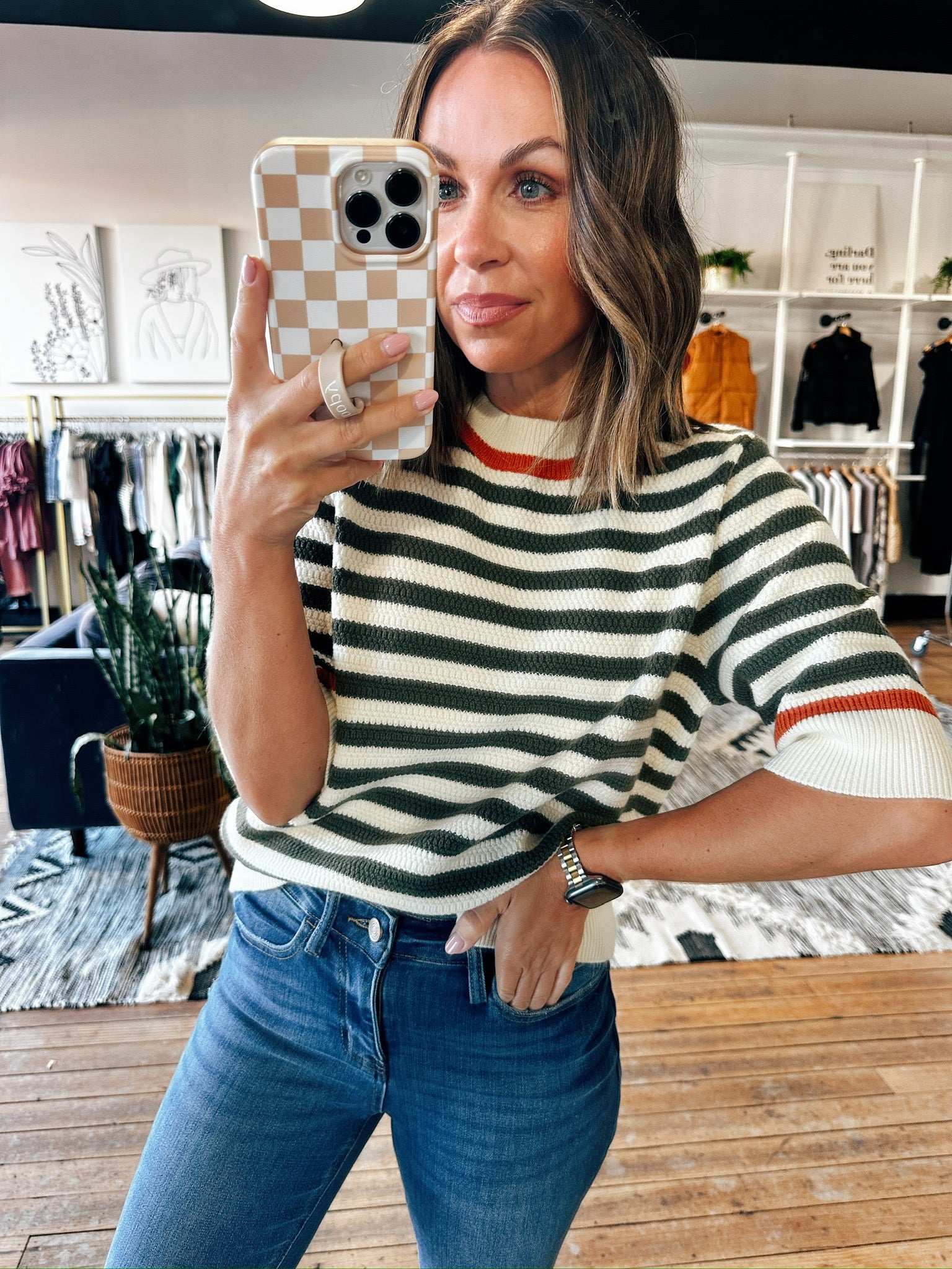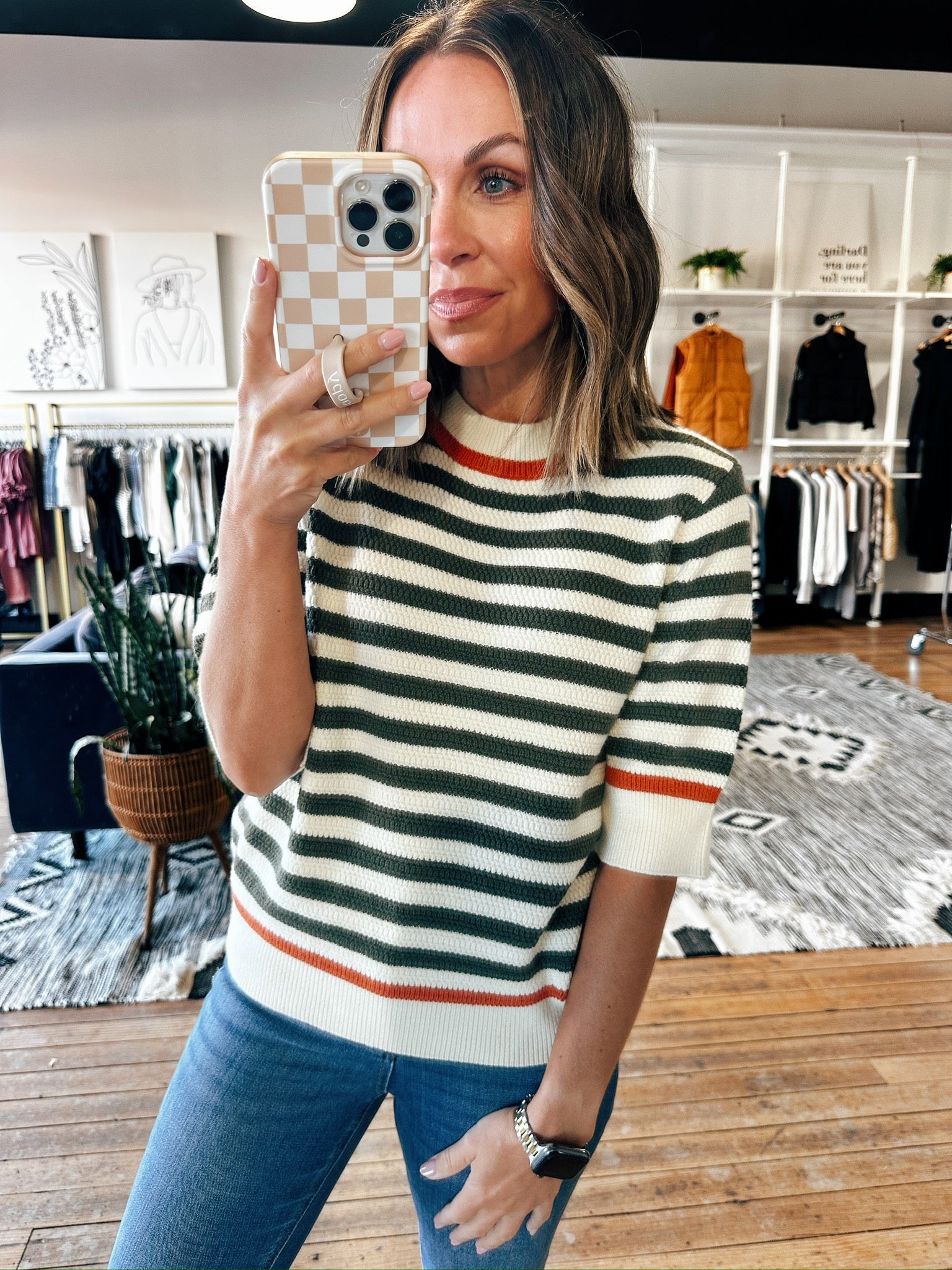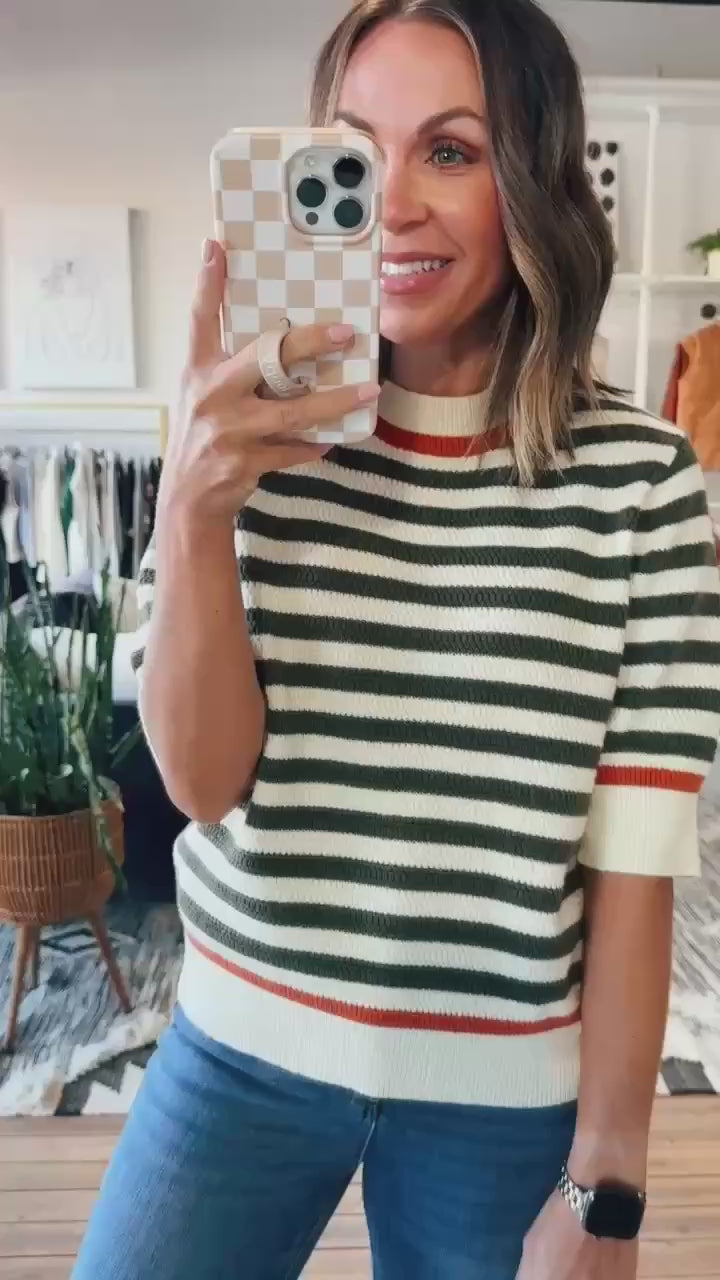 Fresh, playful, and oh-so-versatile—the Tatum Stripe Sweater is the striped knit your wardrobe’s been waiting for. This women’s sweater features a soft cream base with bold olive green stripes and a pop of rust at the neckline and sleeves for just the right touch of color. The short sleeves and lightweight knit make it perfect for transitional weather or layering under jackets.