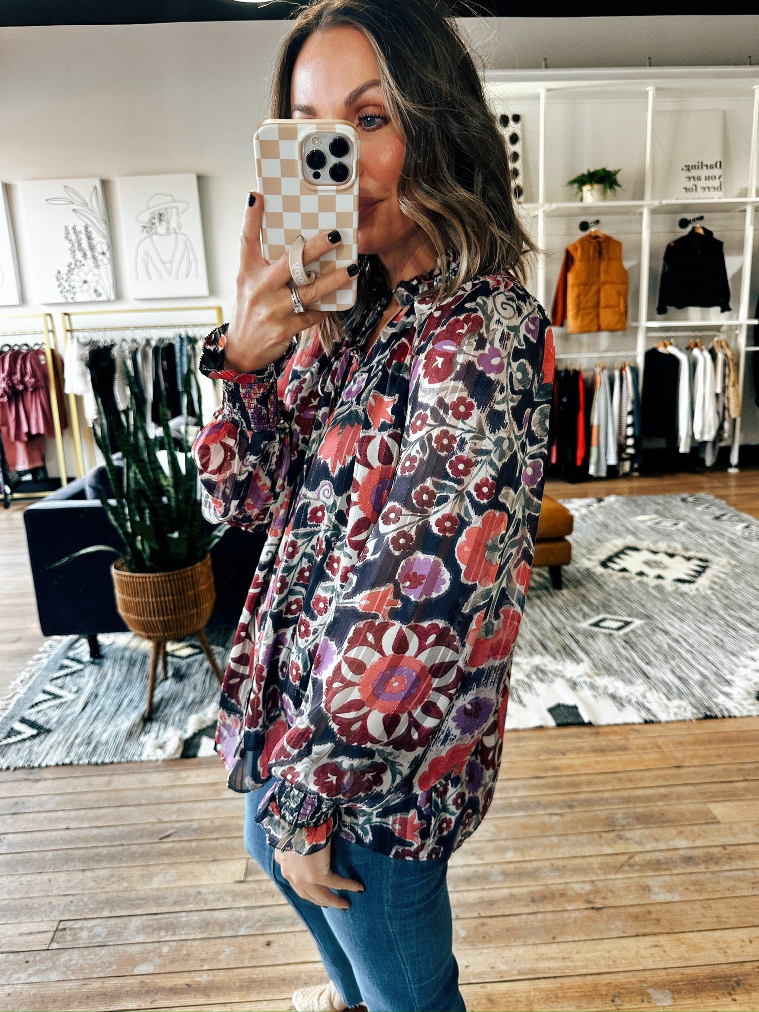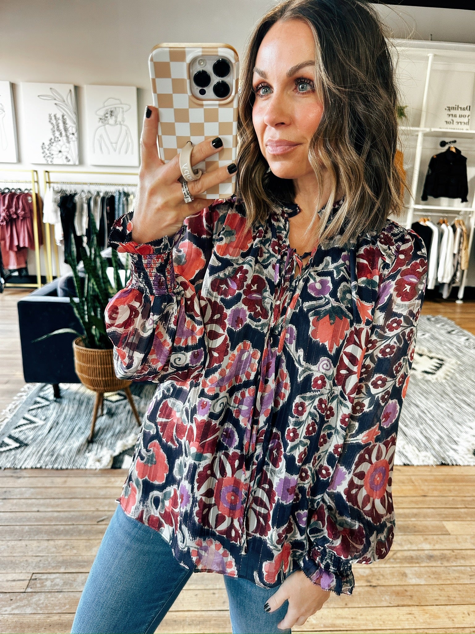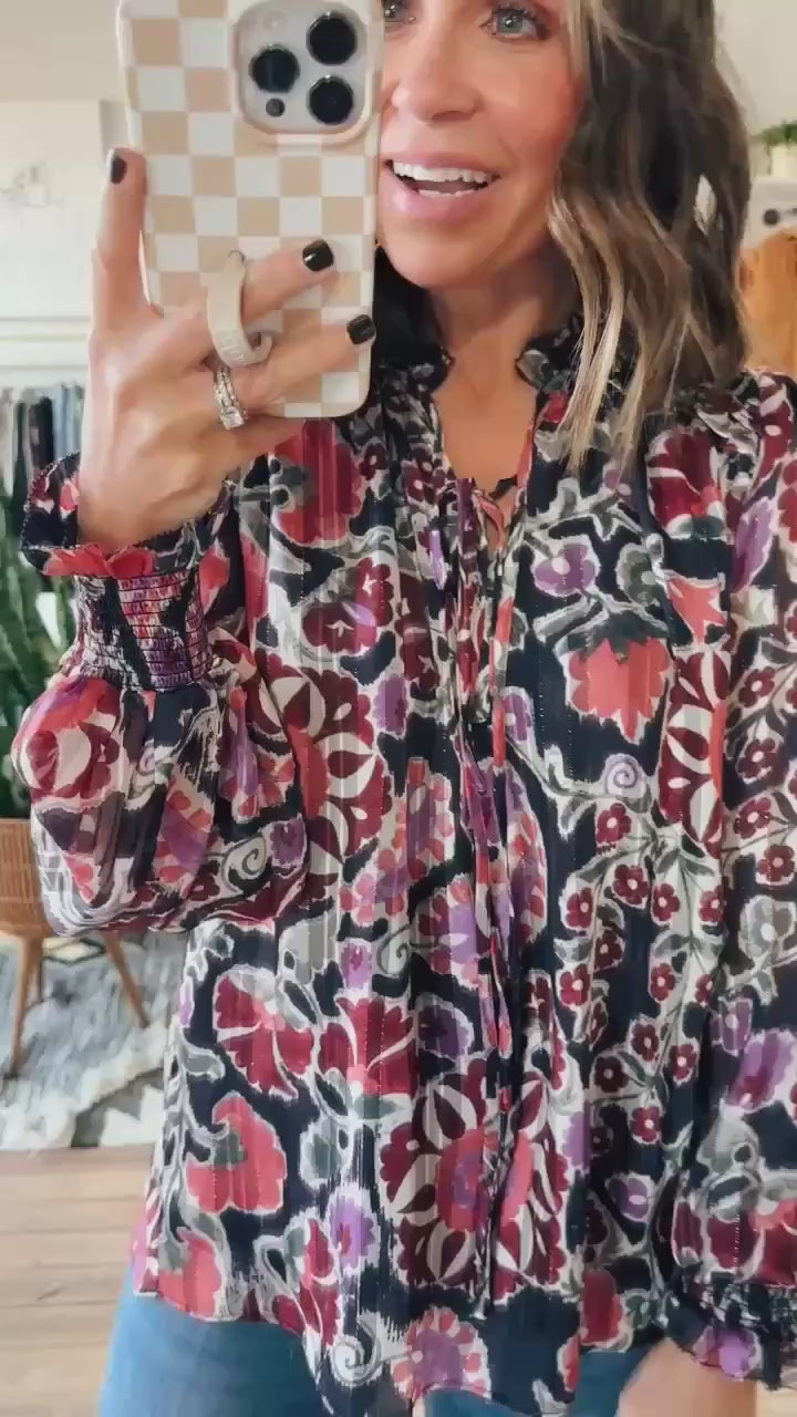 This front tie ruffled V-neck top features long sleeves and a flowy, feminine fit. This blouse has balloon sleeves and an optional tie at the neckline. Perfect for pairing with denim or dress pants!