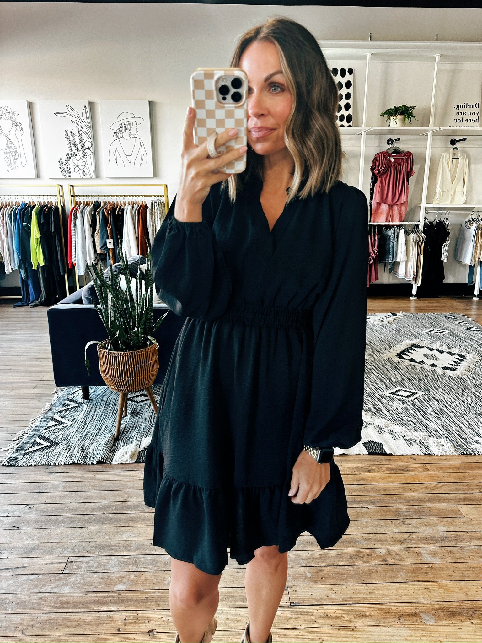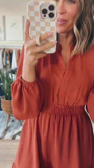 Classic, feminine, and endlessly versatile—this long sleeve flowy dress is a wardrobe essential you’ll wear on repeat. Available in two timeless colors, rich cinnamon and sleek black, it features a flattering V-neckline, elastic waistband for shape, and a tiered hemline that moves with ease. The relaxed fit and lightweight fabric make it comfortable for all-day wear, while the billowy sleeves add the perfect touch of elegance.