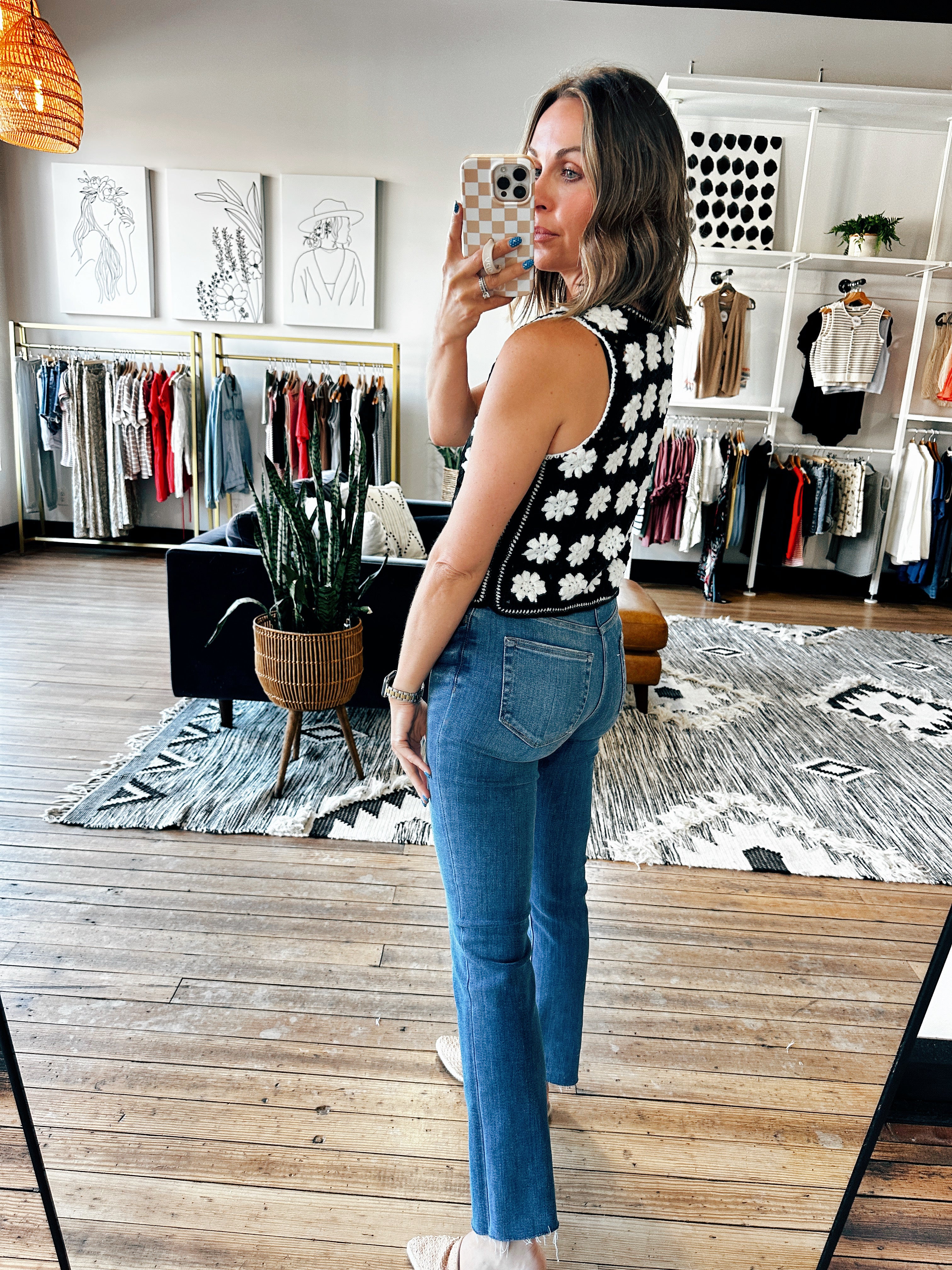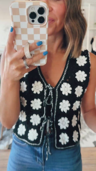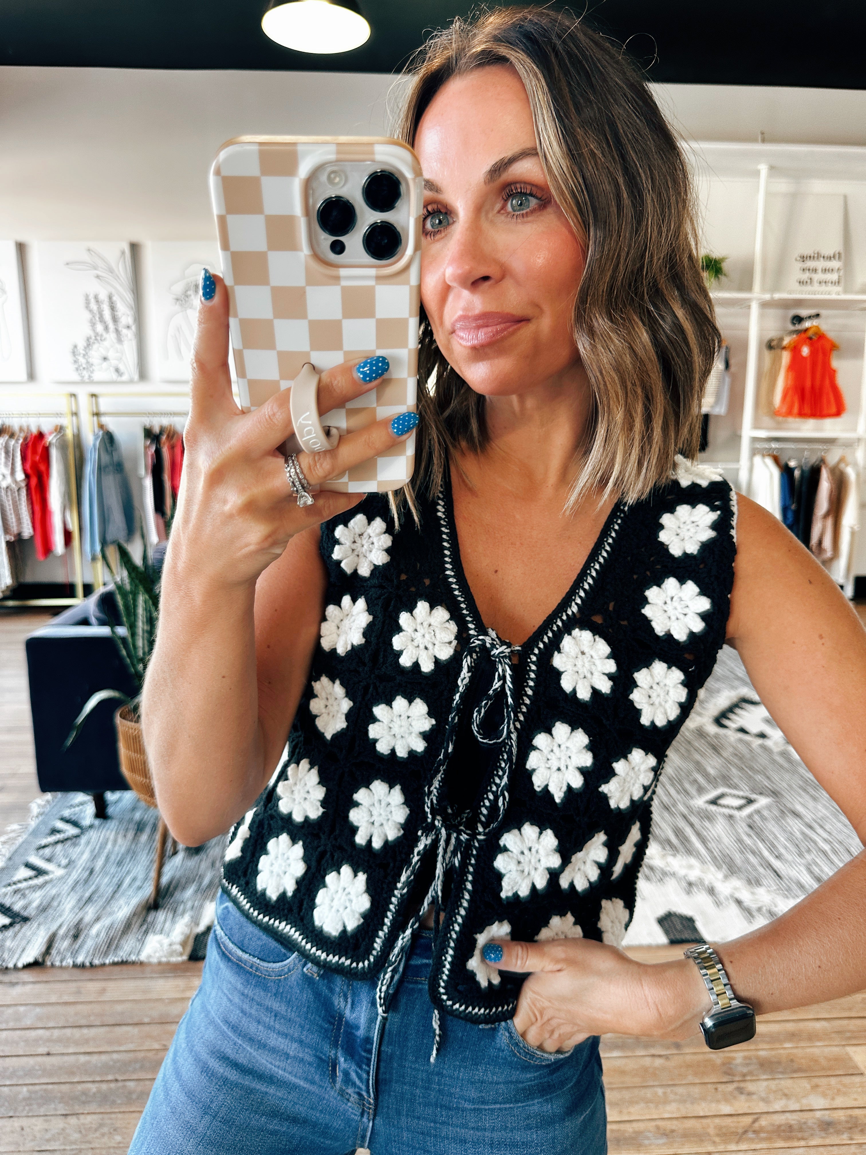 We are still obsessing over the crochet vest trend! This one is a darling black and ivory floral crochet vest with ties down the front for closure. This fits true to size and is a lightly crop length, perfect for pairing with your favorite high rise denim and sandals!