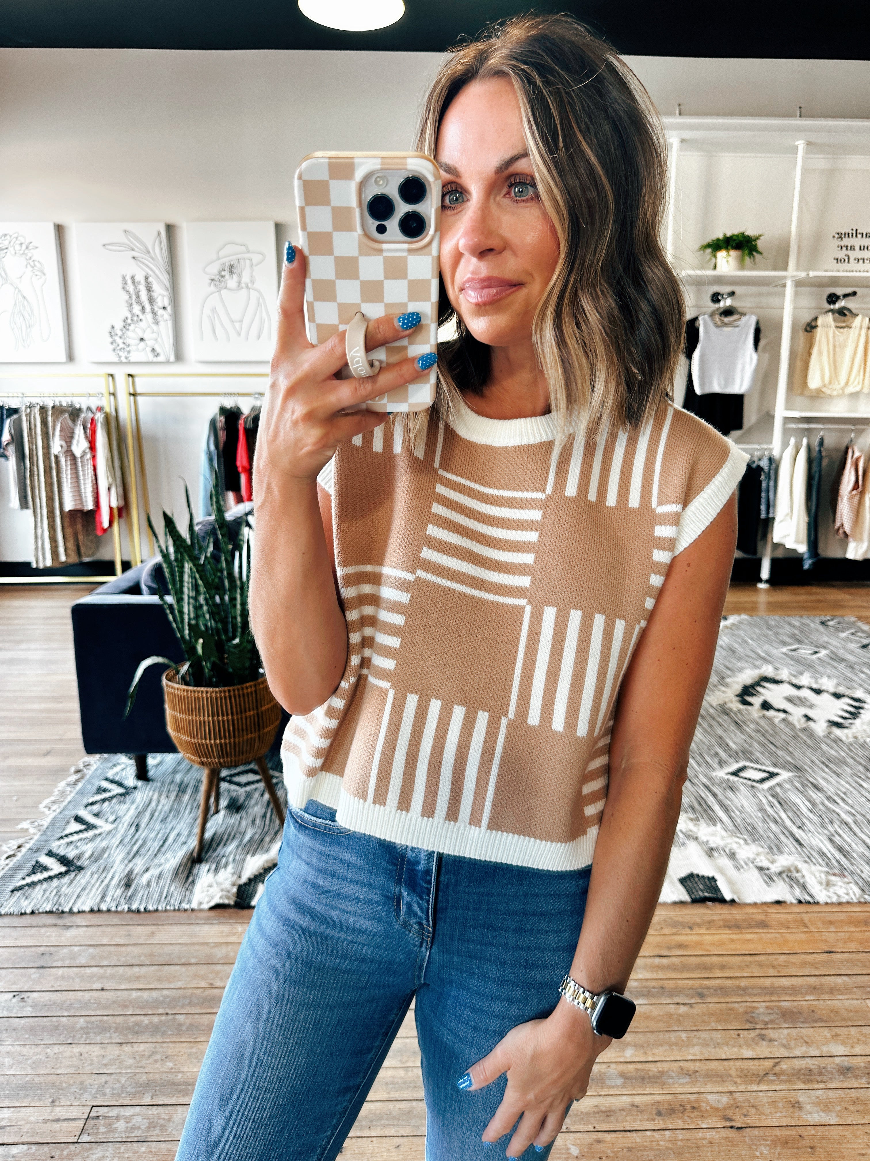 A fun neutral colored checkered print perfect for fall! This is a knit sweater top with a striped checkered print and true to size fit. Wear this as is or with a tee or long sleeve underneath as. the weather cools down!
