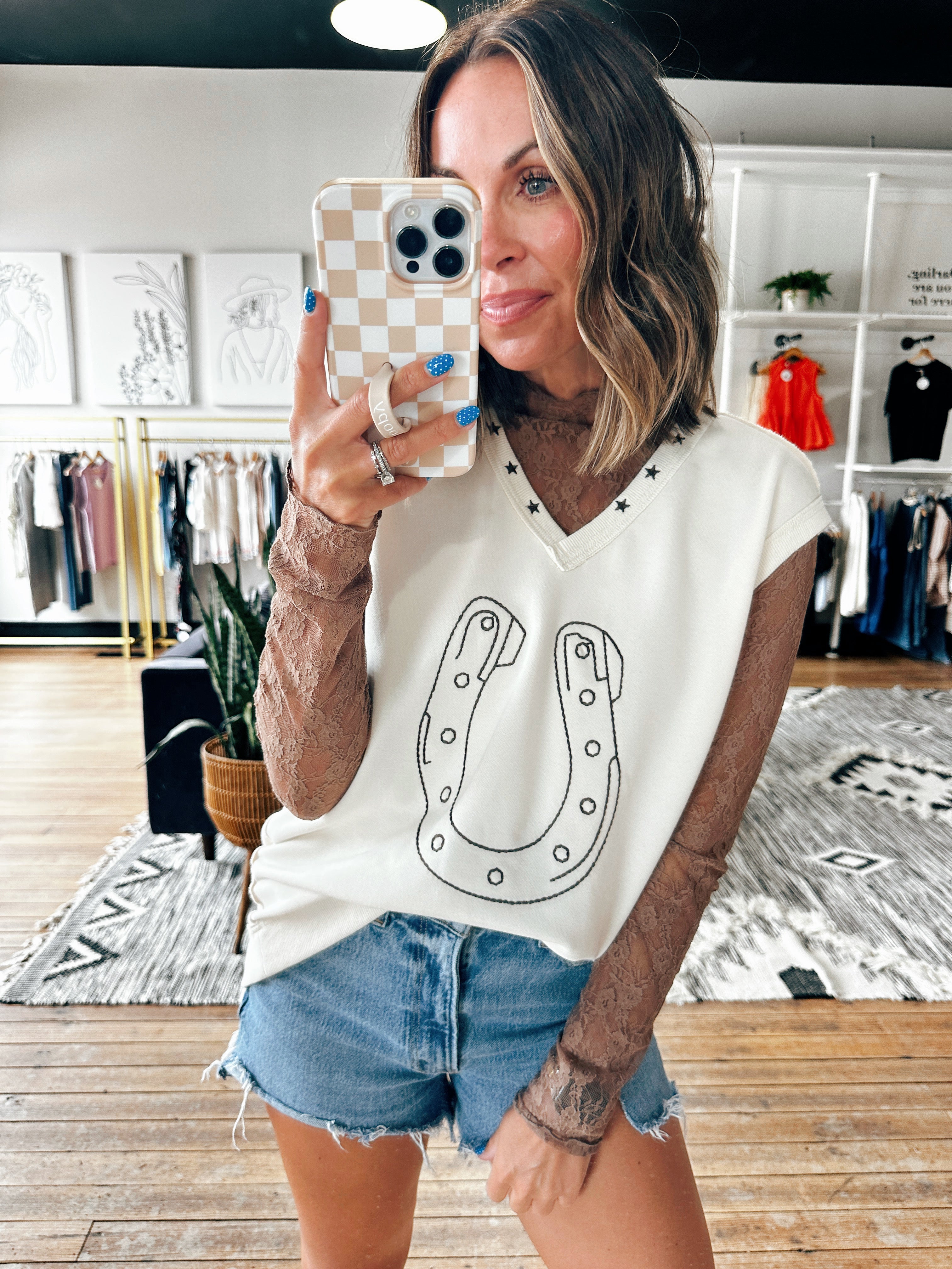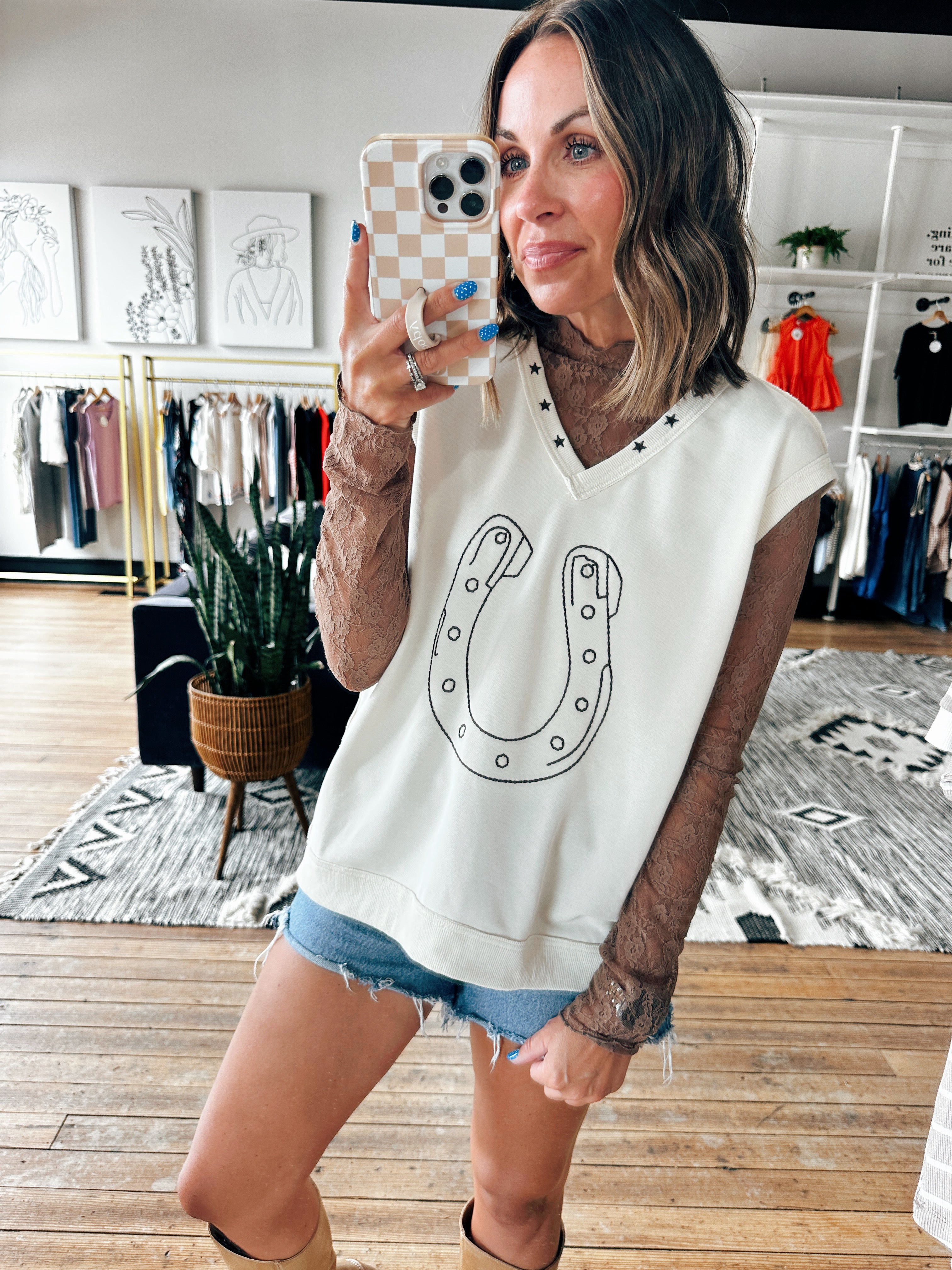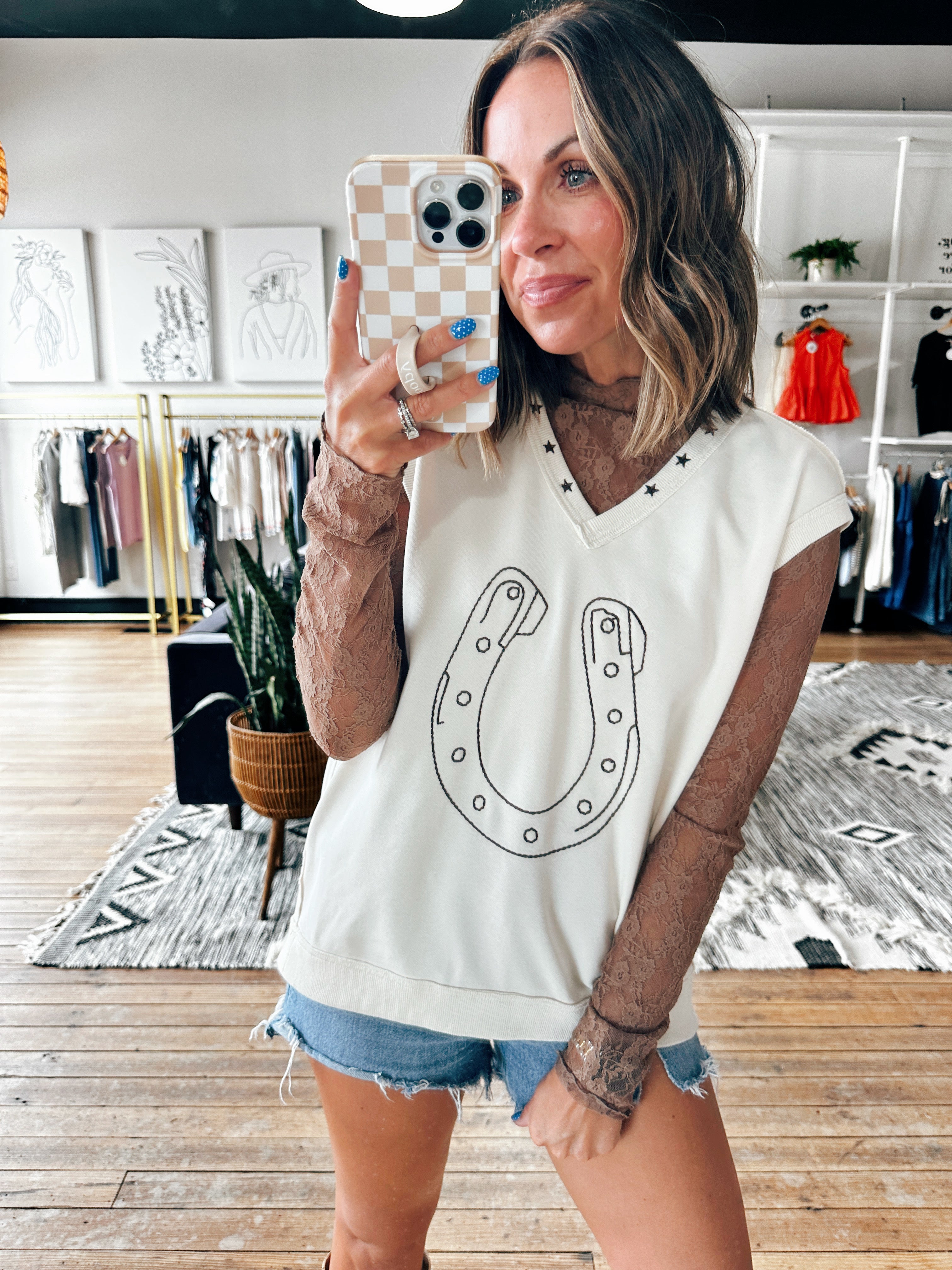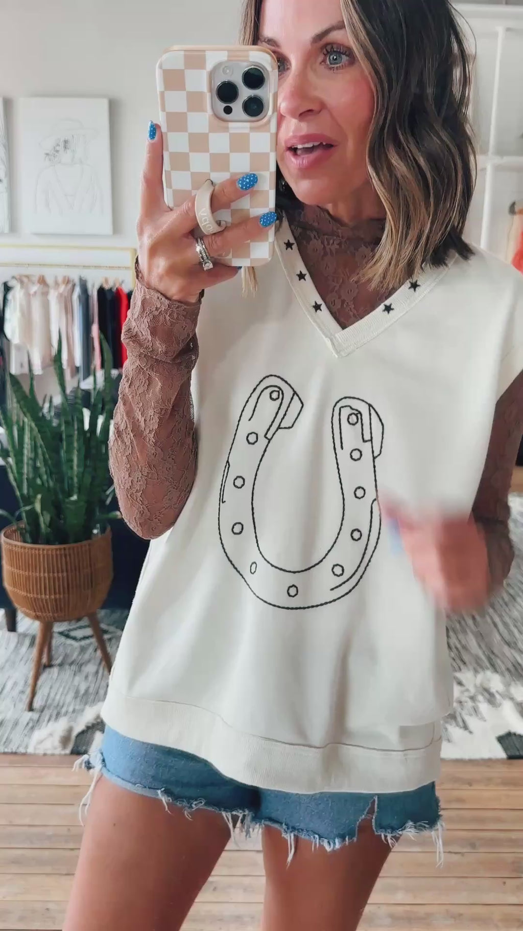 Western styles are trending for fall! This cute vest has a v-neck with star detailing and a horseshoe on the front. It fits true to size and we love how Cristina paired it with a mesh lace long sleeve underneath for a fun texture!