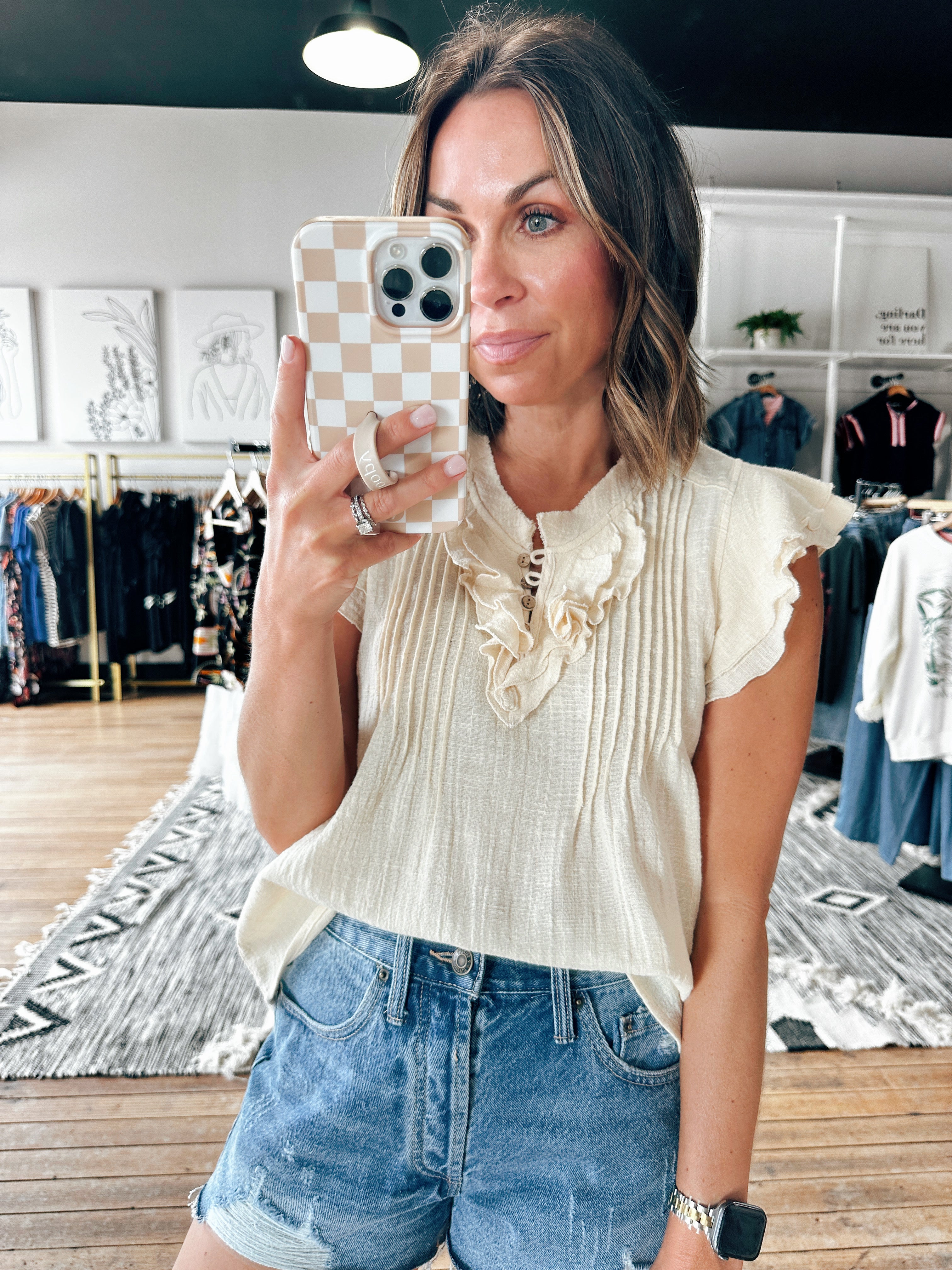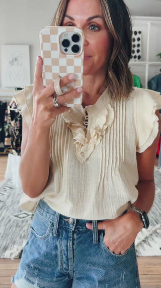This is a beautiful feminine blouse in a soft cream color. This features ruffle detailing, pleating and button detailing at the neckline. This is a nice option to pair with denim, dress pants or with skirts!