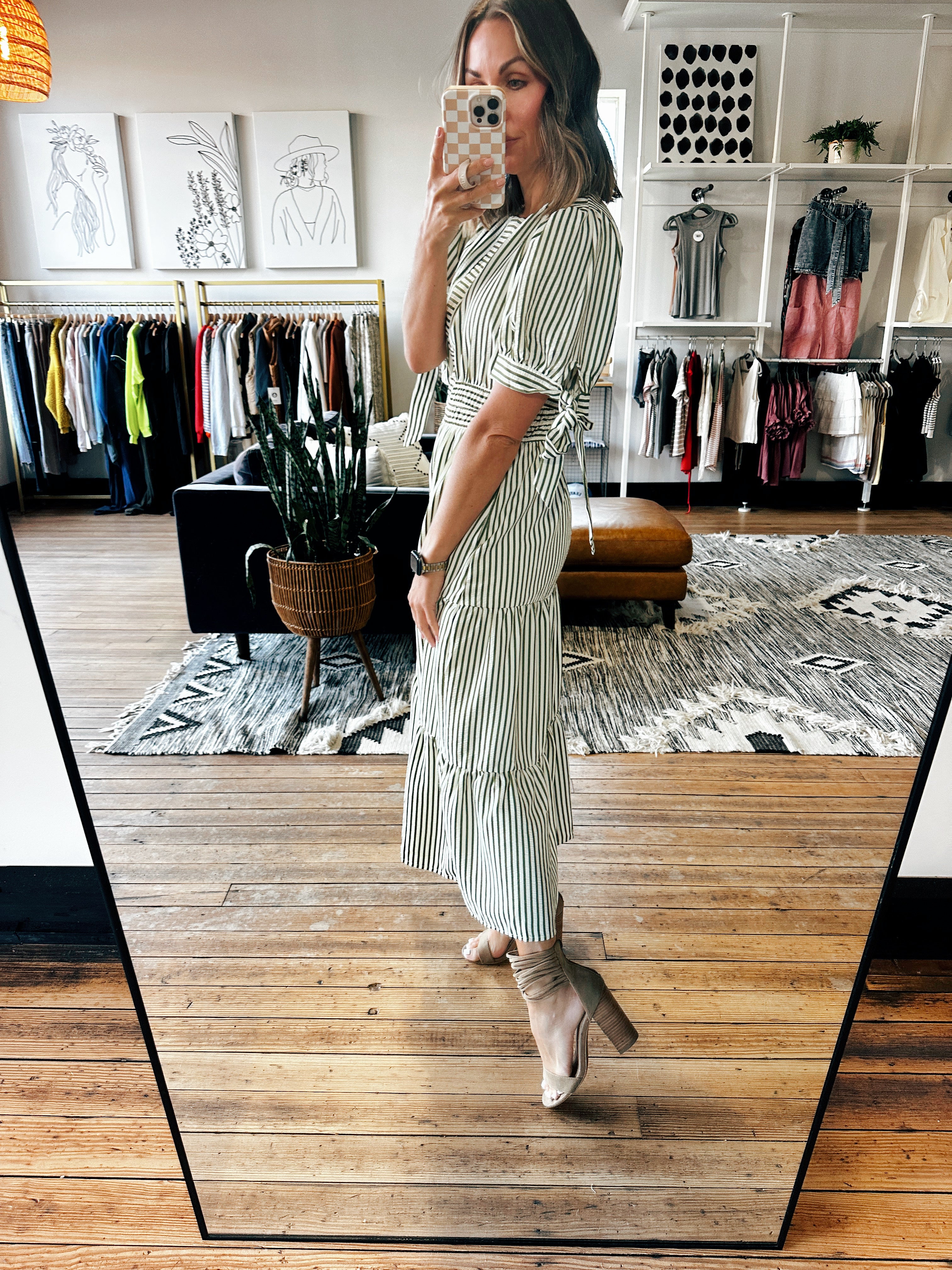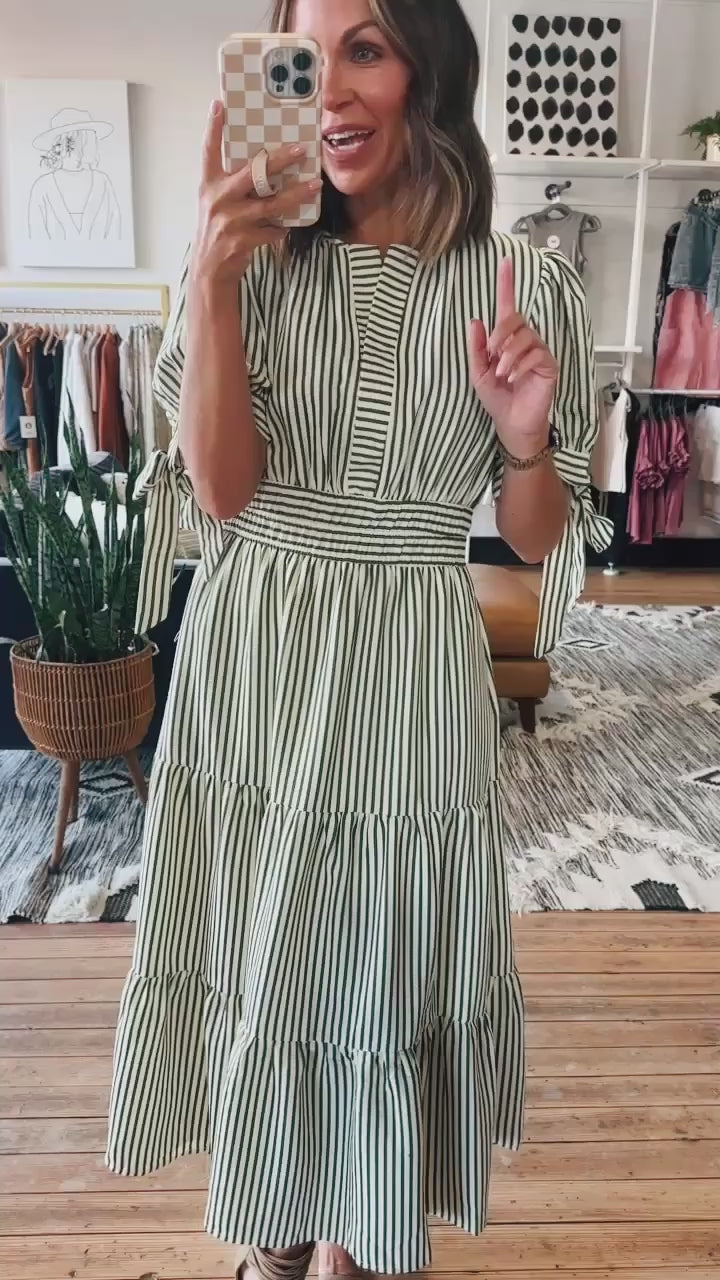 Breezy, flattering, and oh-so-functional—this olive striped maxi dress is a must-have for effortless everyday style. Featuring a tiered silhouette, tie-detail short sleeves, and a flattering smocked waistband, it blends casual charm with a polished finish. The lightweight fabric drapes beautifully, while side pockets add the perfect touch of practicality.