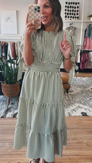 Olive Striped Tie-Sleeve Maxi Dress with Pockets