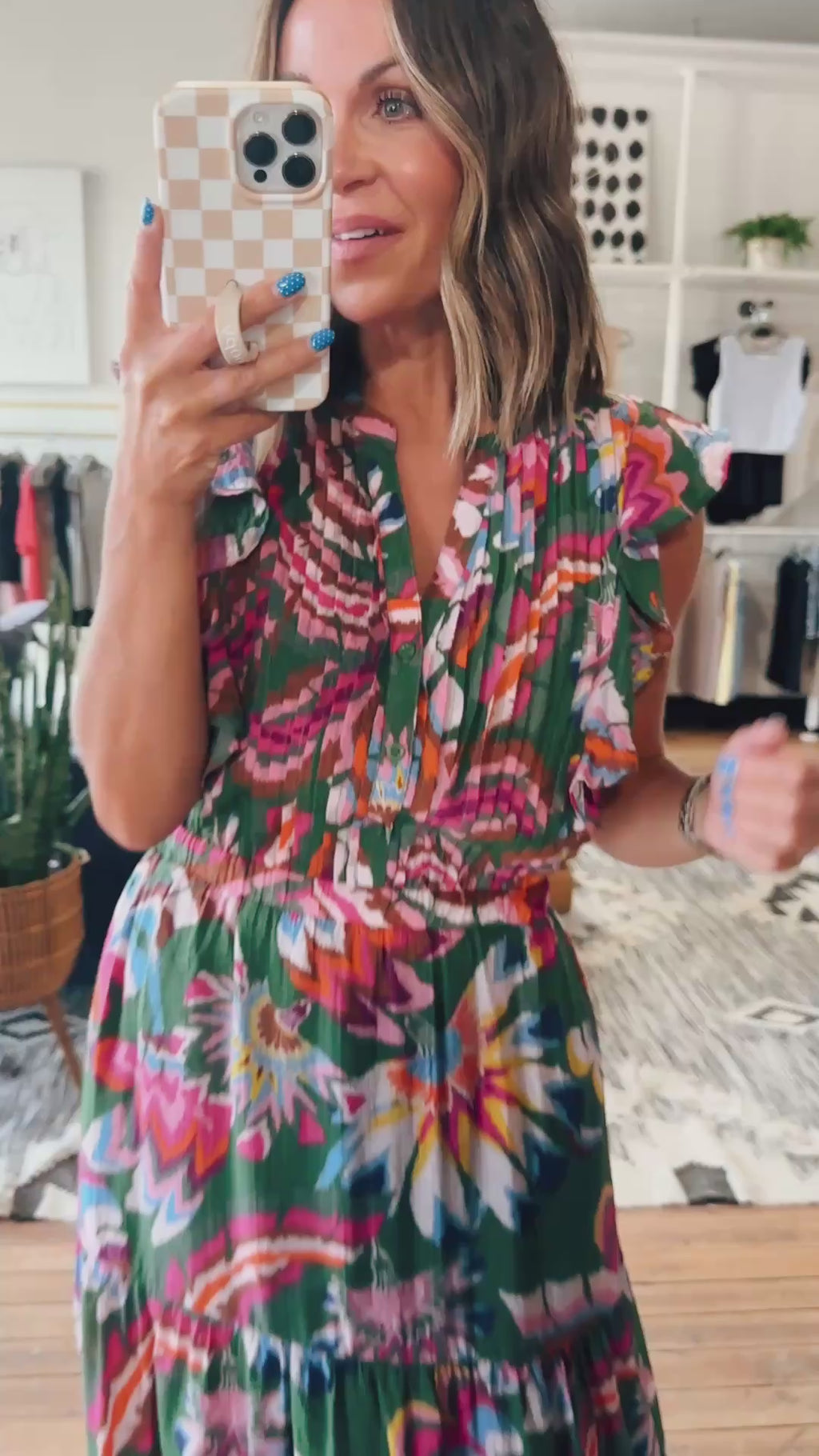 We are loving the floral print on this dress! This fits true to size with elastic at the waistline to accentuate your figure. We love the tiered bottom because it gives a flowy style to the look. Pair with sandals, heels or boots as we head towards fall!