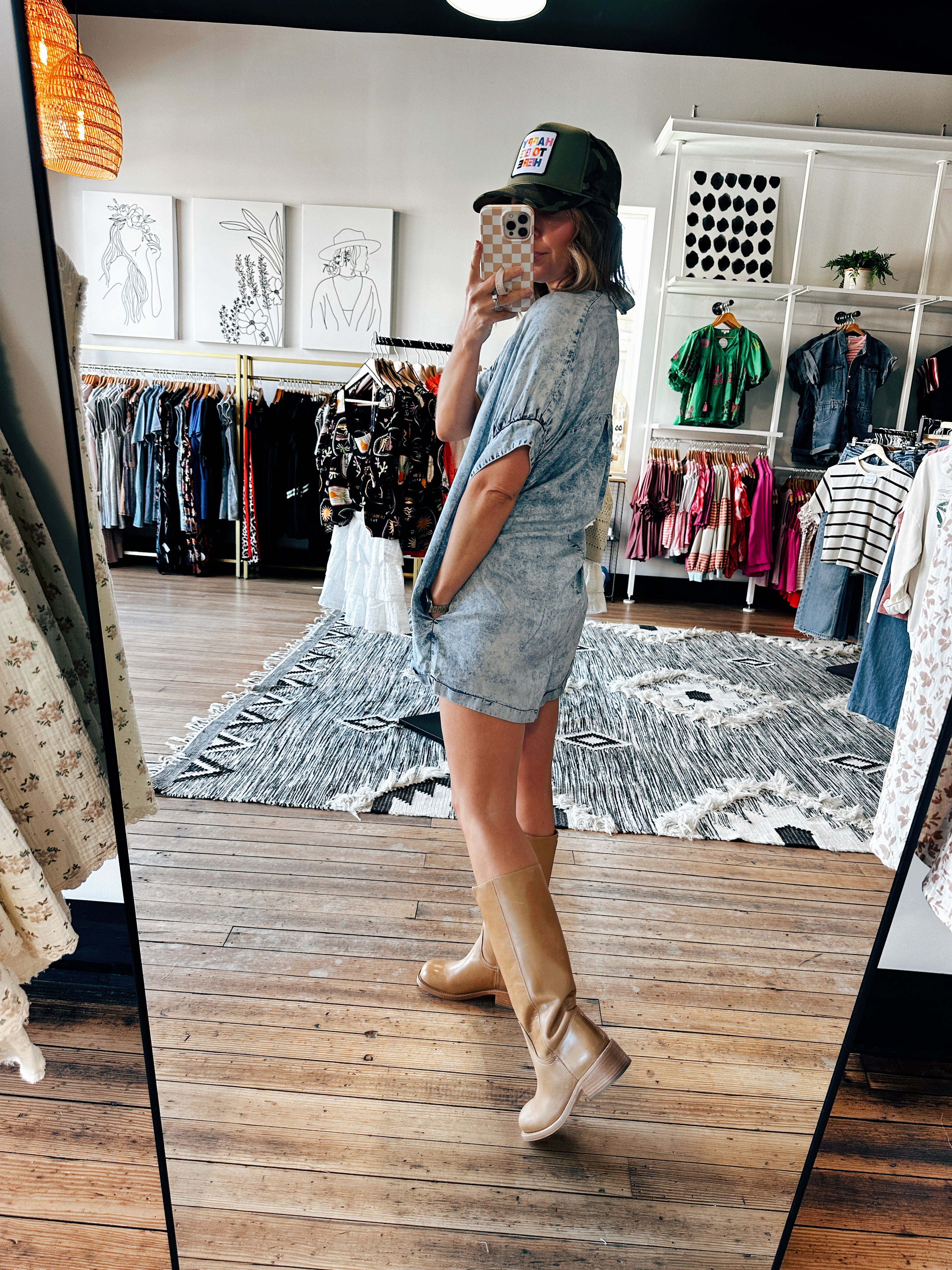 Slip into this Post Script Washed Denim Romper for an effortlessly comfy and stylish summer look. Lightweight for warm days and perfect with tennis shoes. Get ready to romp around in this must-have piece! True to size, relaxed style.