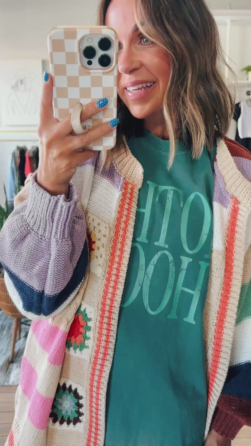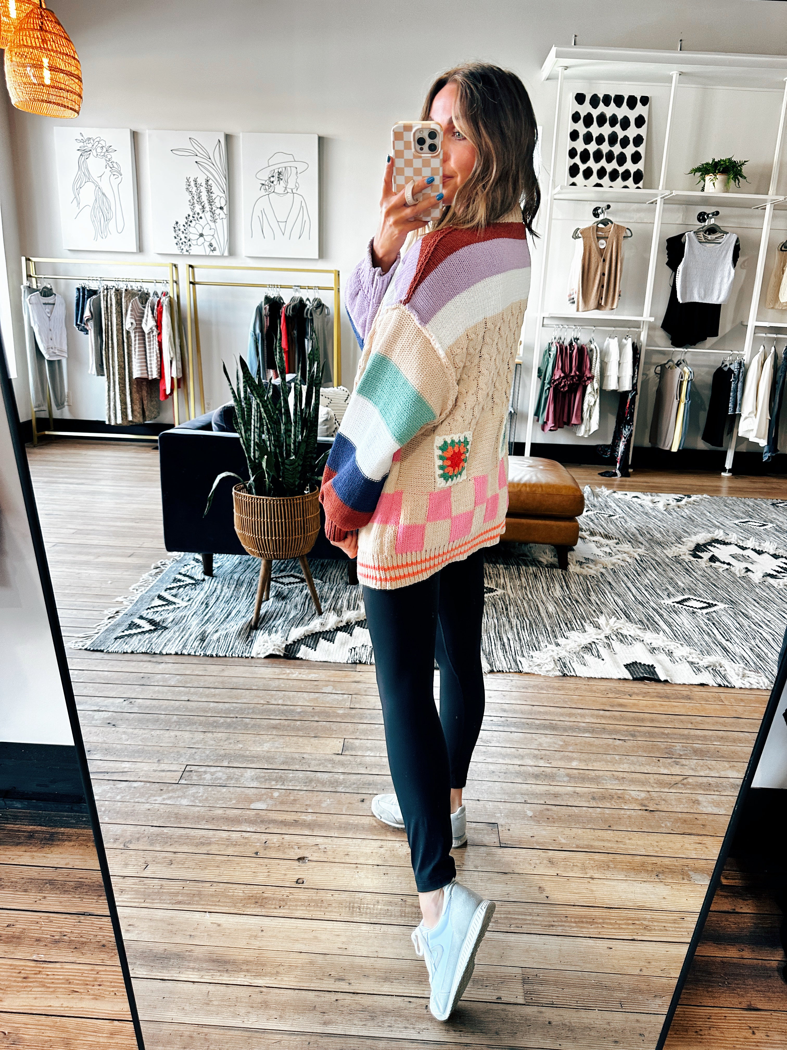 Patchwork print has been so cute and trendy this year so we had to grab this sweater in two color options! This fits true to size, but relaxed, with stripes and a crochet patch detail. This is a fun option to throw over a tank or graphic tee with leggings or denim!