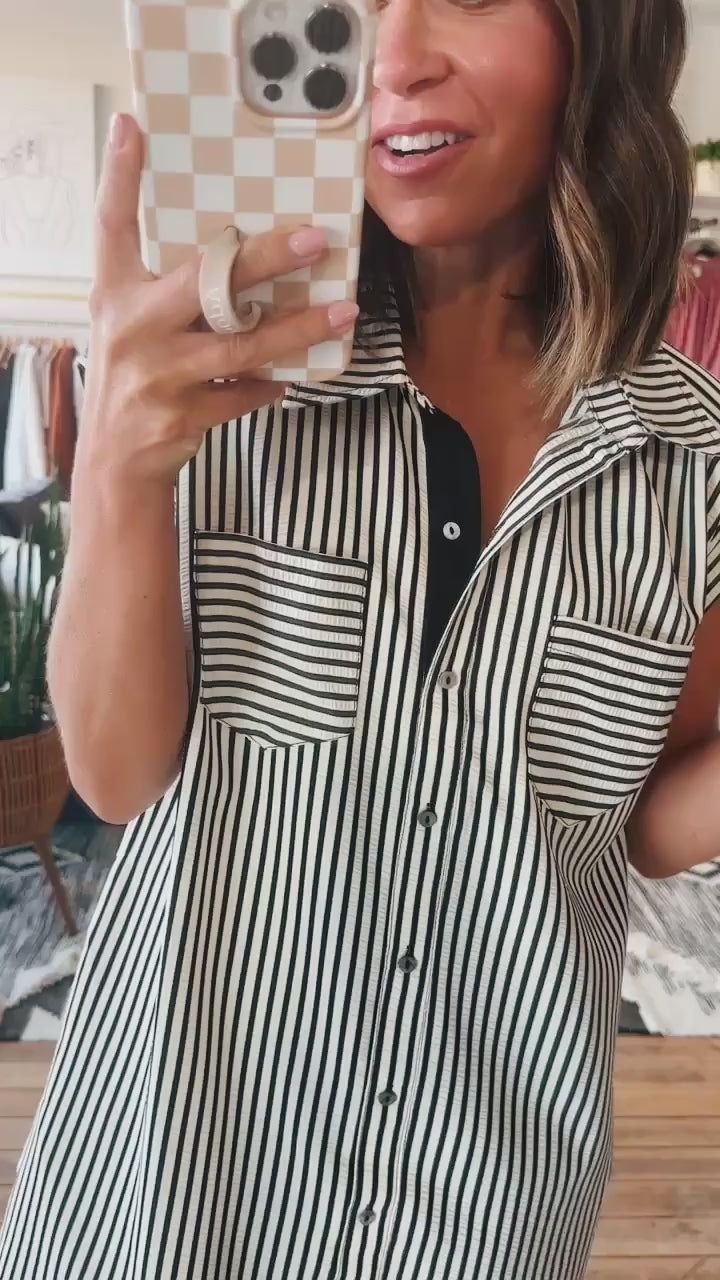 Elevate your wardrobe with this sophisticated black and white striped button-down shirt dress. Designed for effortless style, it features crisp vertical stripes and a classic button-down front for a tailored look. The versatile silhouette balances comfort and refinement, perfect for both professional settings and chic weekend outings.