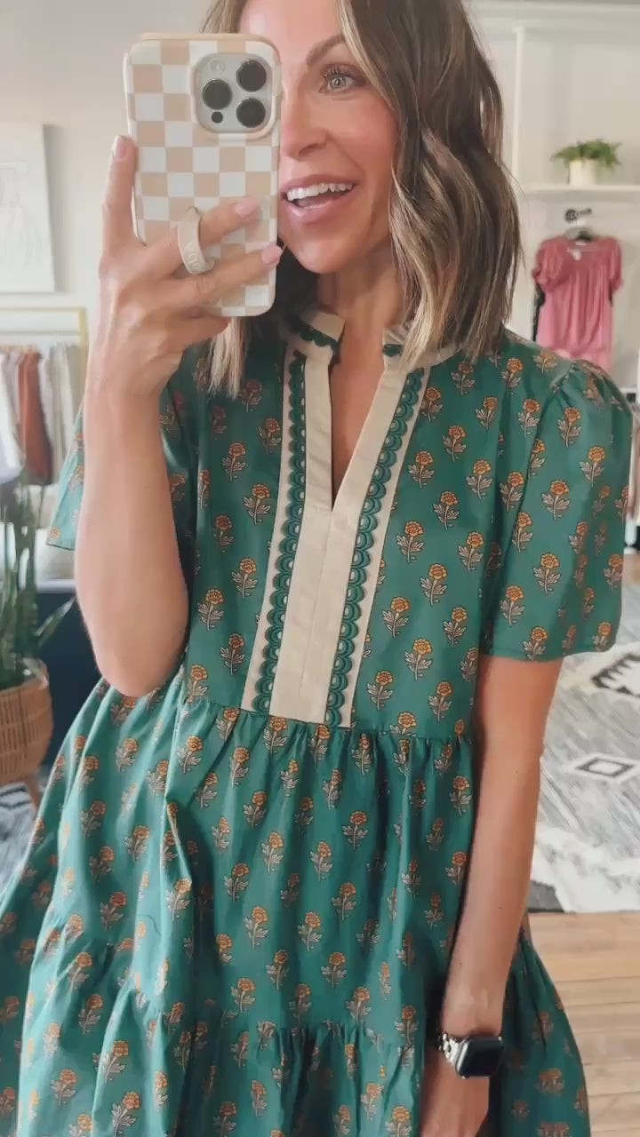 Chic and playful, this teal green mini dress is the perfect blend of casual comfort and feminine charm. Designed with a flattering V-cut neckline framed by contrasting trim, flowy half sleeves, and a relaxed tiered skirt, it offers an easy, breezy silhouette. The subtle floral print adds a touch of elegance, while the hidden side pockets make it as practical as it is stylish.