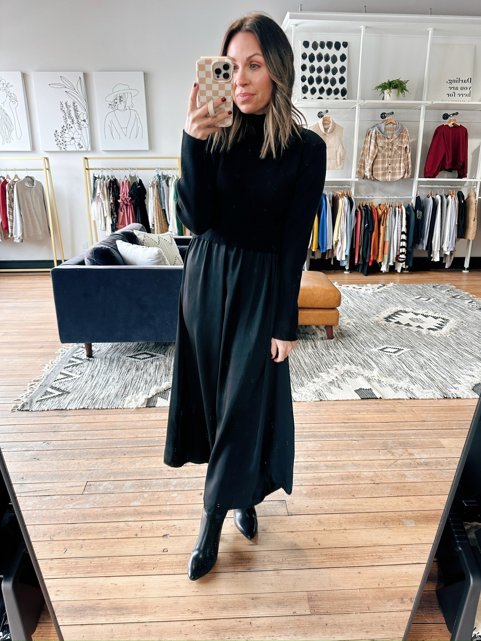 Elevate your wardrobe with our Black Satin & Sweater Knit Maxi Dress, a stunning fusion of cozy texture and silky elegance. This women’s boutique favorite features a fitted ribbed sweater top in a warm rust hue, offering both comfort and a flattering fit, while the flowing satin skirt drapes effortlessly for a graceful, feminine silhouette.