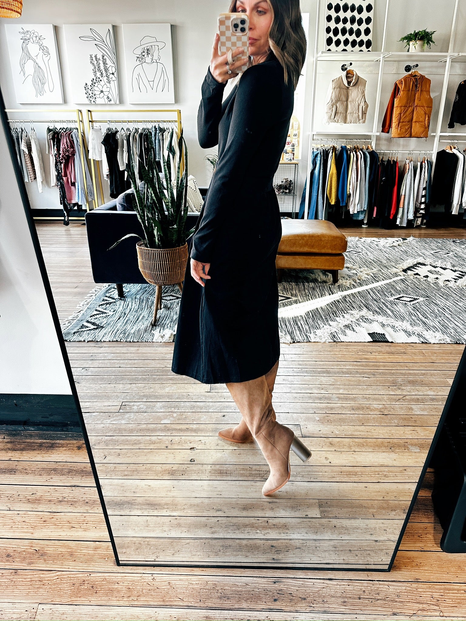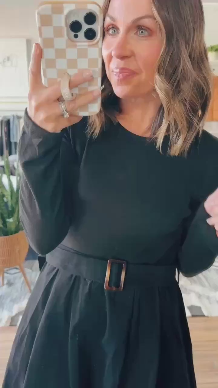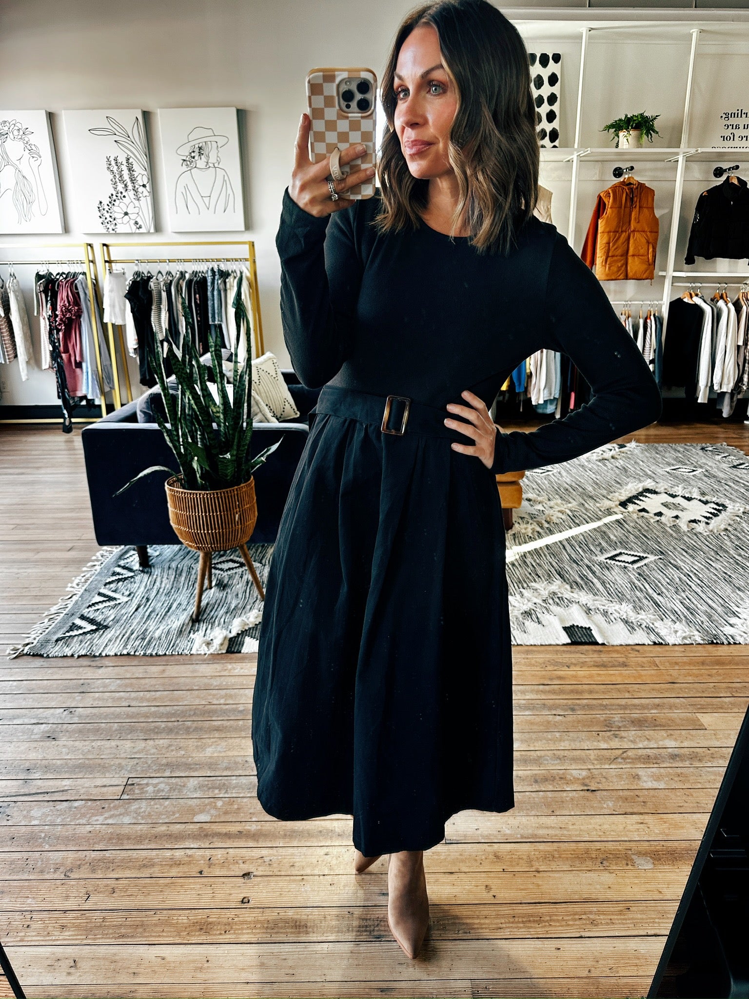 Turn heads with our Meyra Knit Combo Dress! This pretty black dress style is a midi length with a belted waist and side zip closure. It fits true to size and has a soft, almost velvety material through the skirt. You can pair this with boots or heels, and you can always swap out the belt to change up your style too!