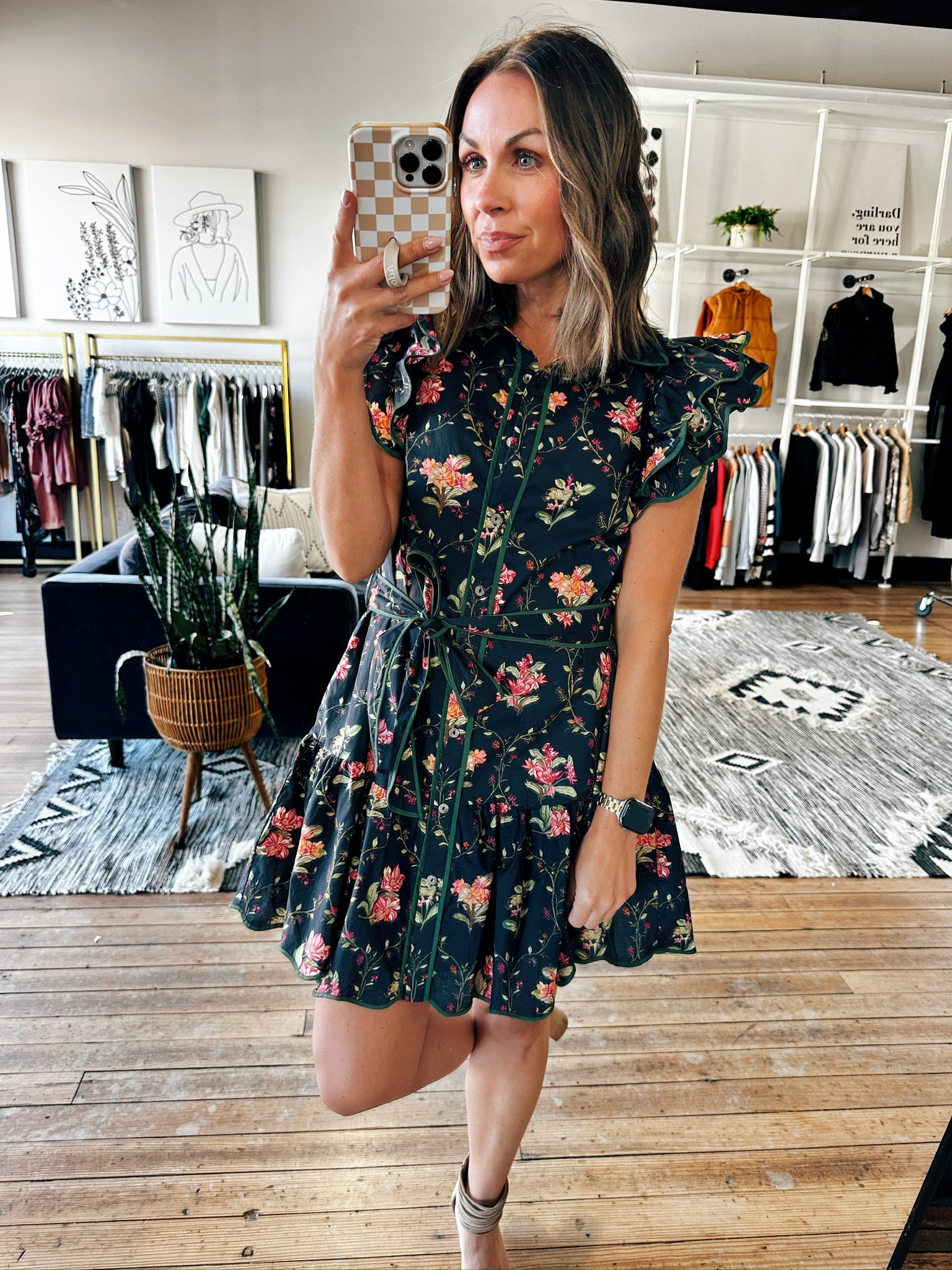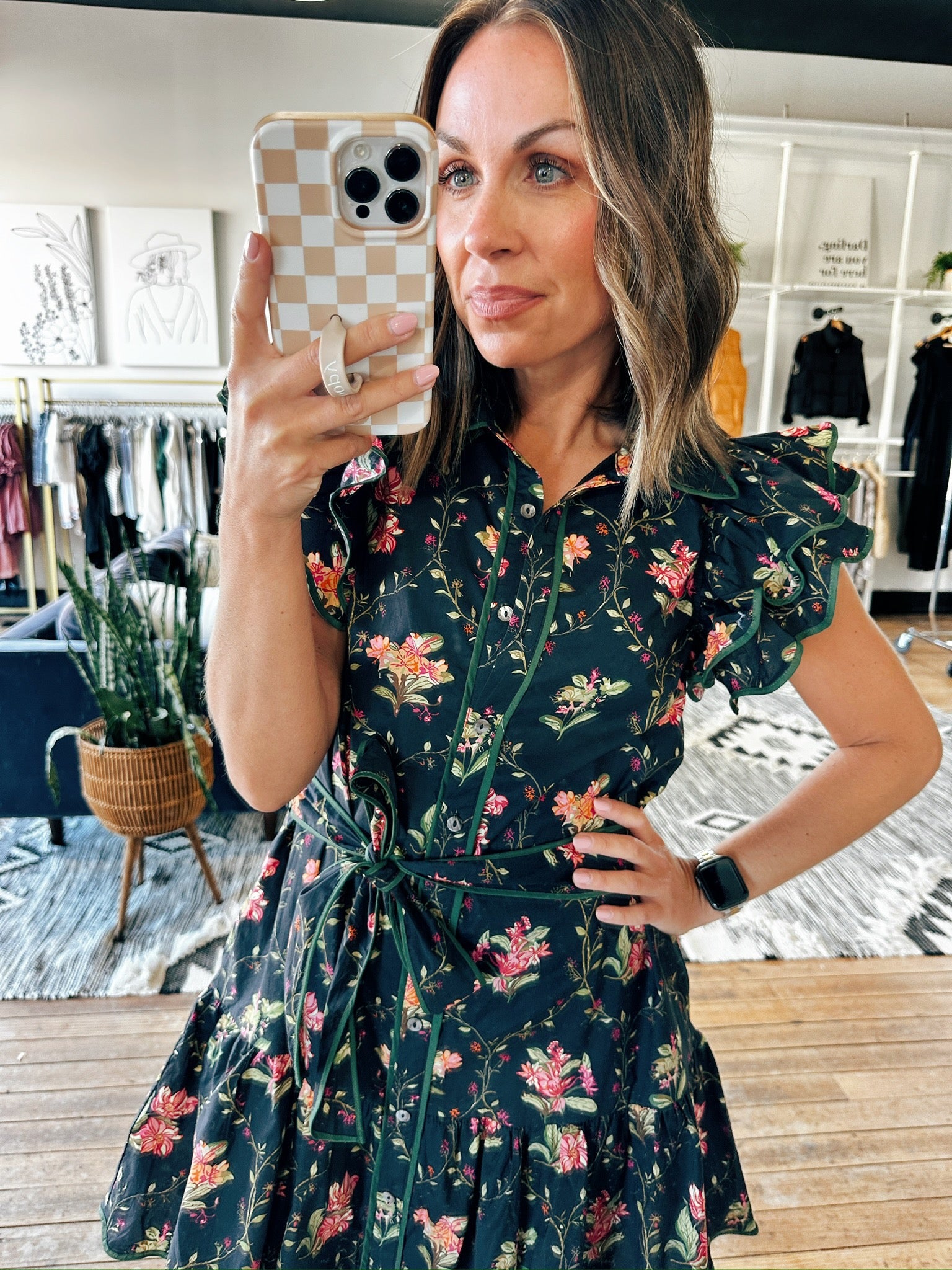 Romantic and playful, the Cafferty Floral Dress is made for women who love standout style with feminine details. Featuring a deep green base with vibrant pink and golden floral prints, this dress brings an elegant pop of color to your wardrobe. The ruffled sleeves, button-front bodice, and belted waist create a flattering silhouette, while the tiered skirt adds effortless movement.