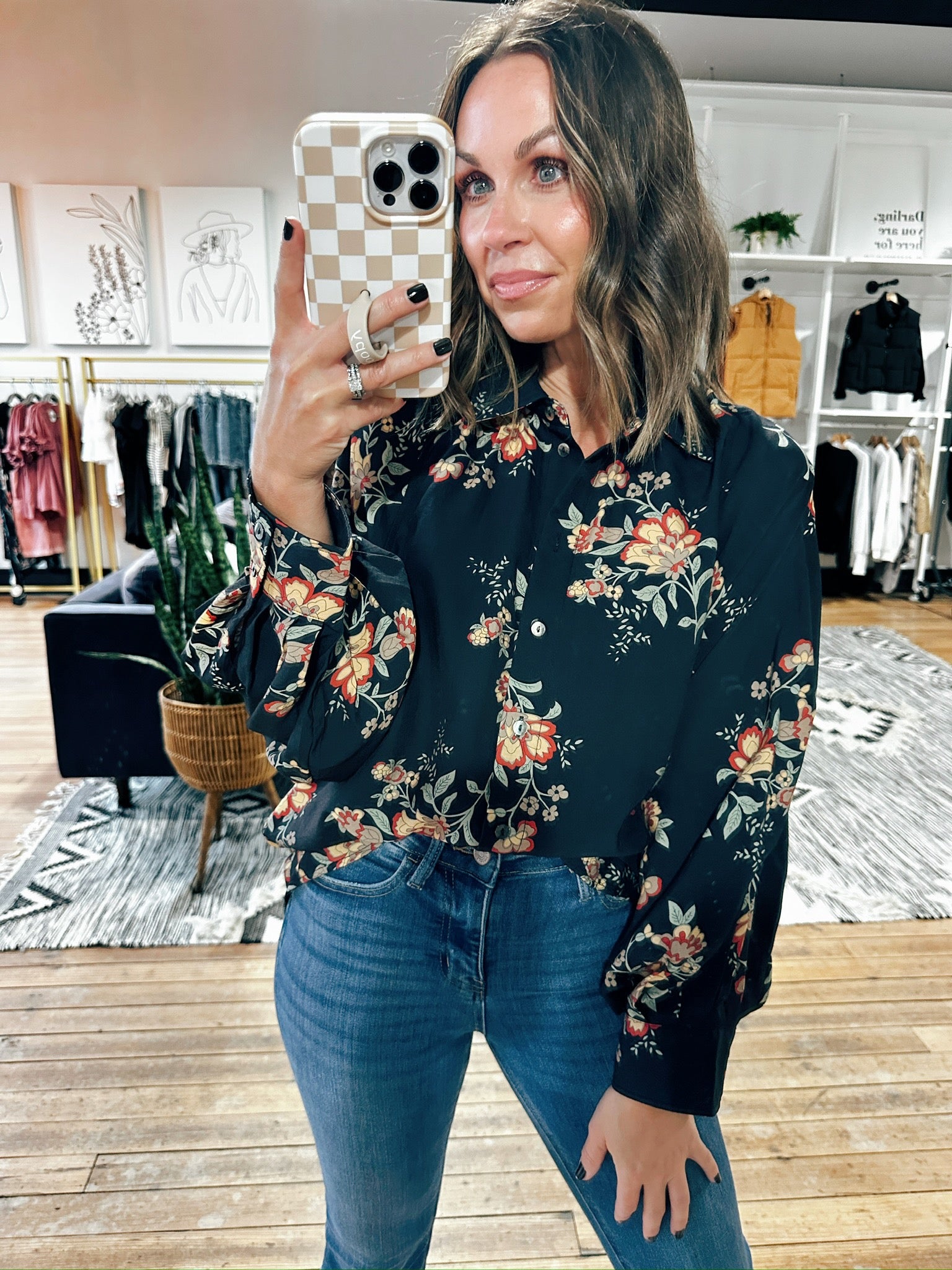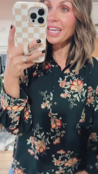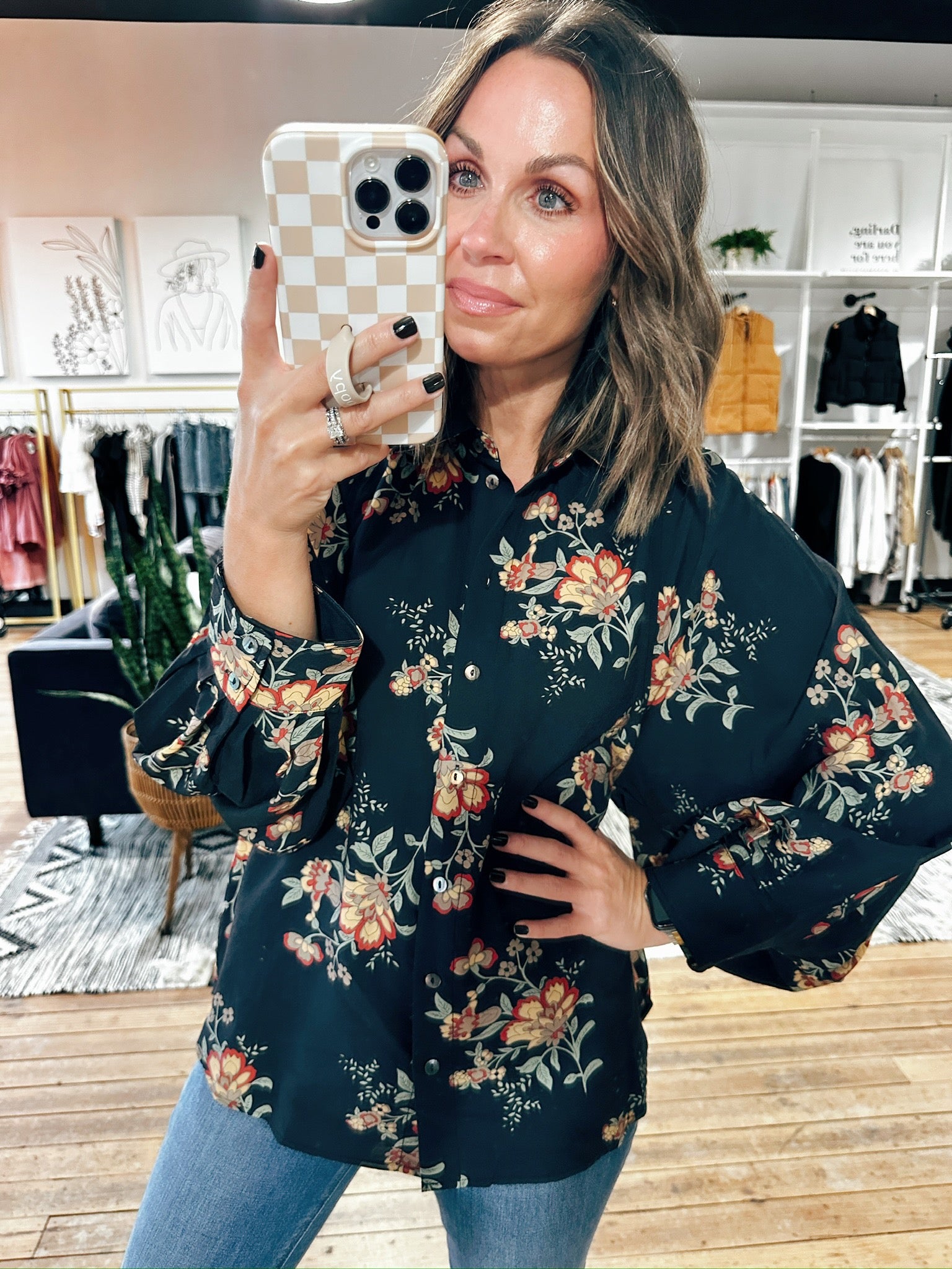 Bring boho charm to your wardrobe with this floral print button-down top! This fits true to size with buttons down the front and slight balloon sleeves. It is a nice length for wearing as is or tucking with denim or dress pants!