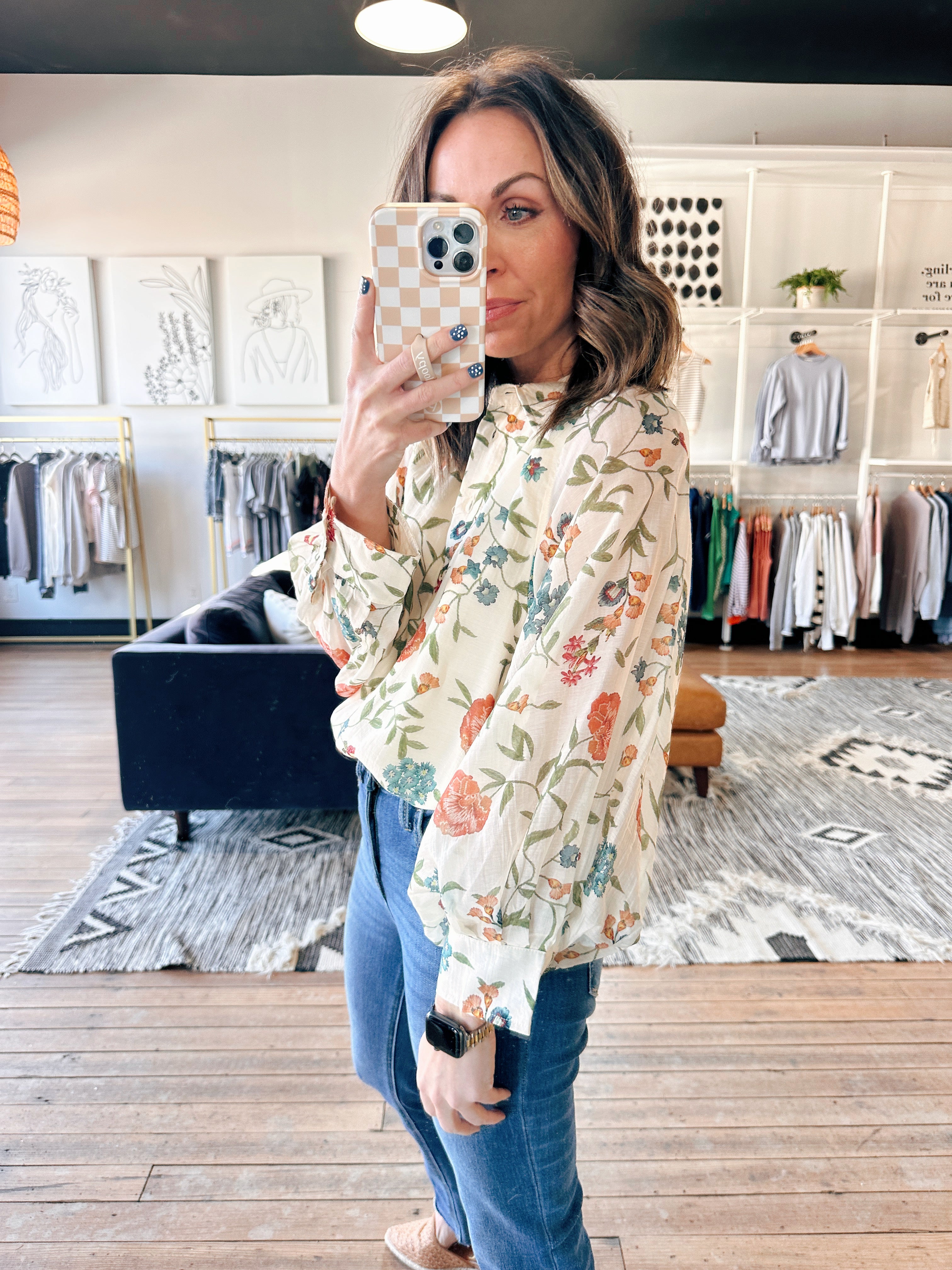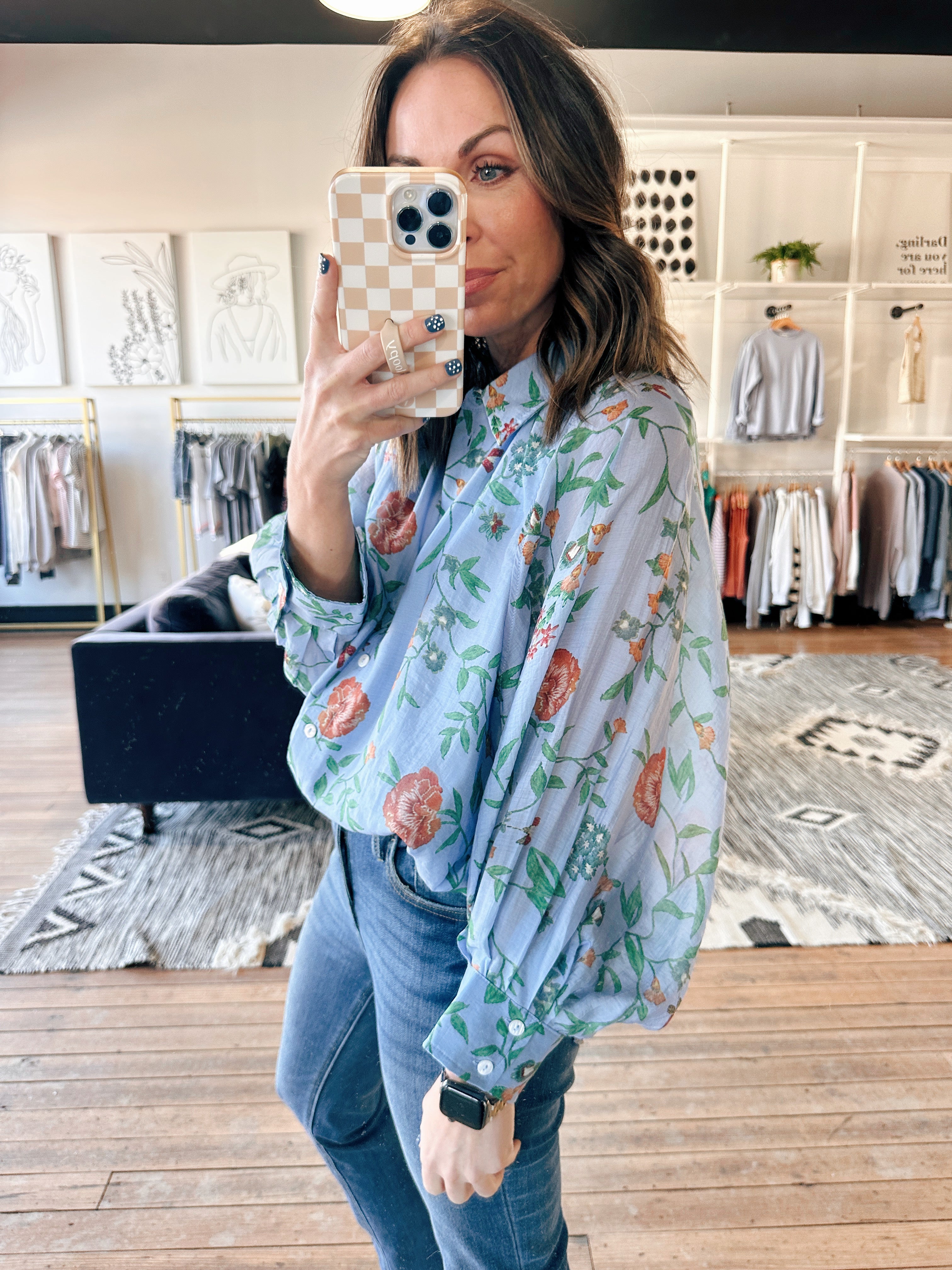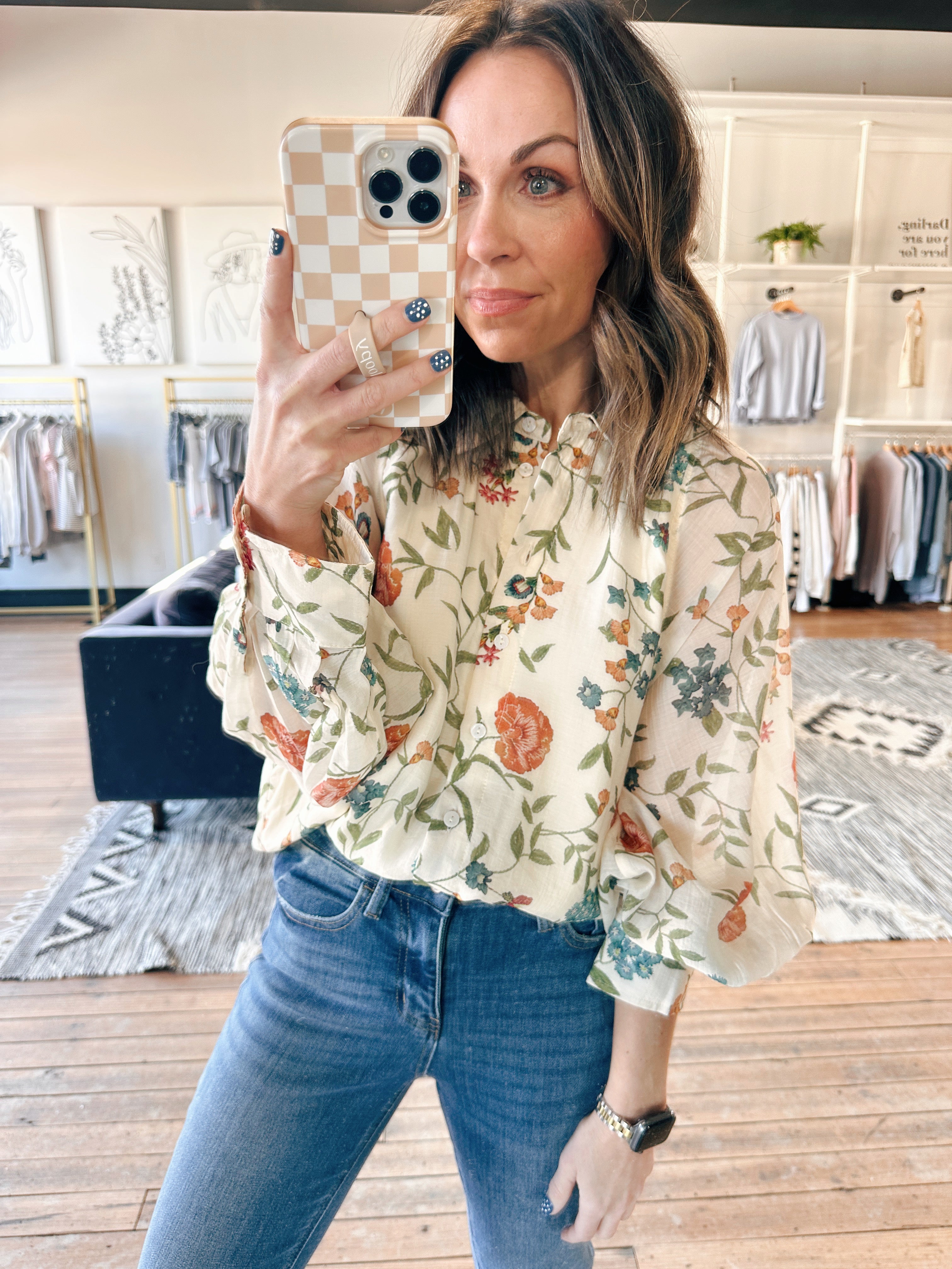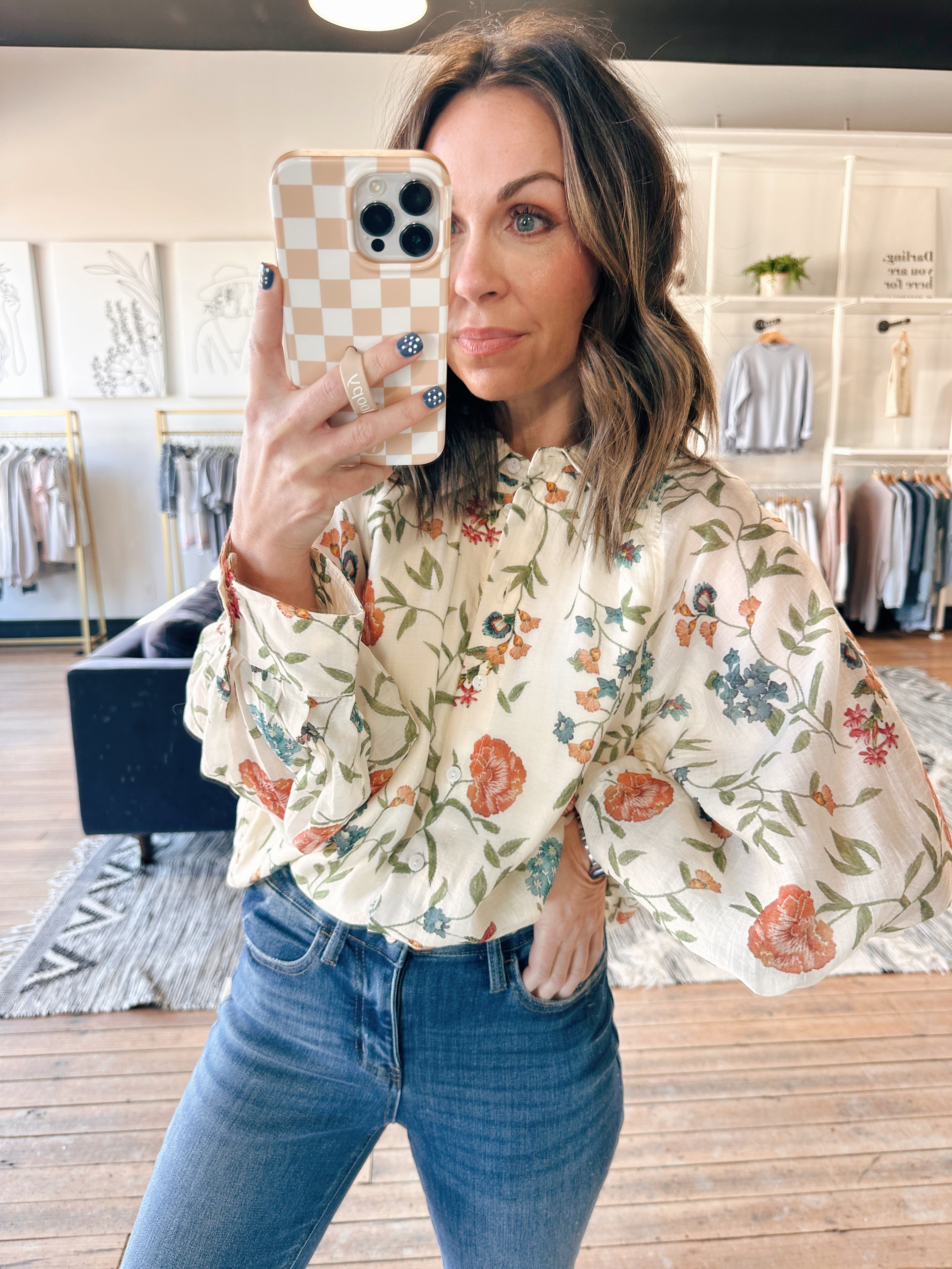 The Entro Melissa Floral Long Sleeve Blouse is a beautiful lightweight woven long-sleeve blouse featuring a delicate floral print, a classic shirt collar, and a button-front closure. It fits true to size with a polished, flowy silhouette — perfect for workdays, brunch, or elevated everyday wear. Made from a lightweight, semi-sheer fabric with lining, this piece adds an effortless yet refined touch to denim or tailored bottoms.