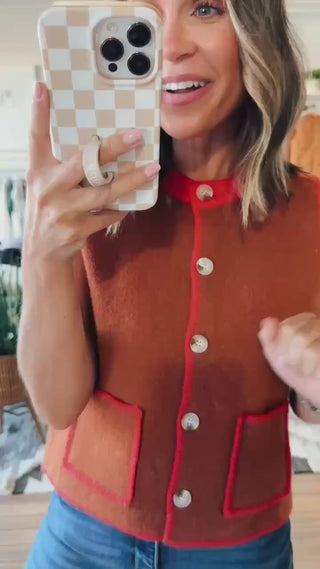 Add a bold pop of personality to your wardrobe with the Monroe Sweater Vest. Designed for women who love effortless style with a playful edge, this sleeveless knit comes in a warm burnt orange color with striking red trim that makes it stand out. The button-front design and roomy front pockets add both charm and functionality, making it perfect for layering or wearing on its own.