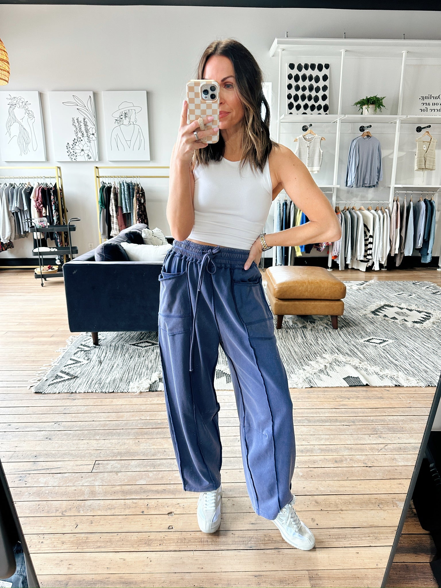 The AnnieWear Alessia Barrel Fit Utility Pants are a beautiful soft French terry knit barrel-fit utility pant featuring a mineral wash finish, double pocket detailing, and a relaxed, slouchy silhouette.