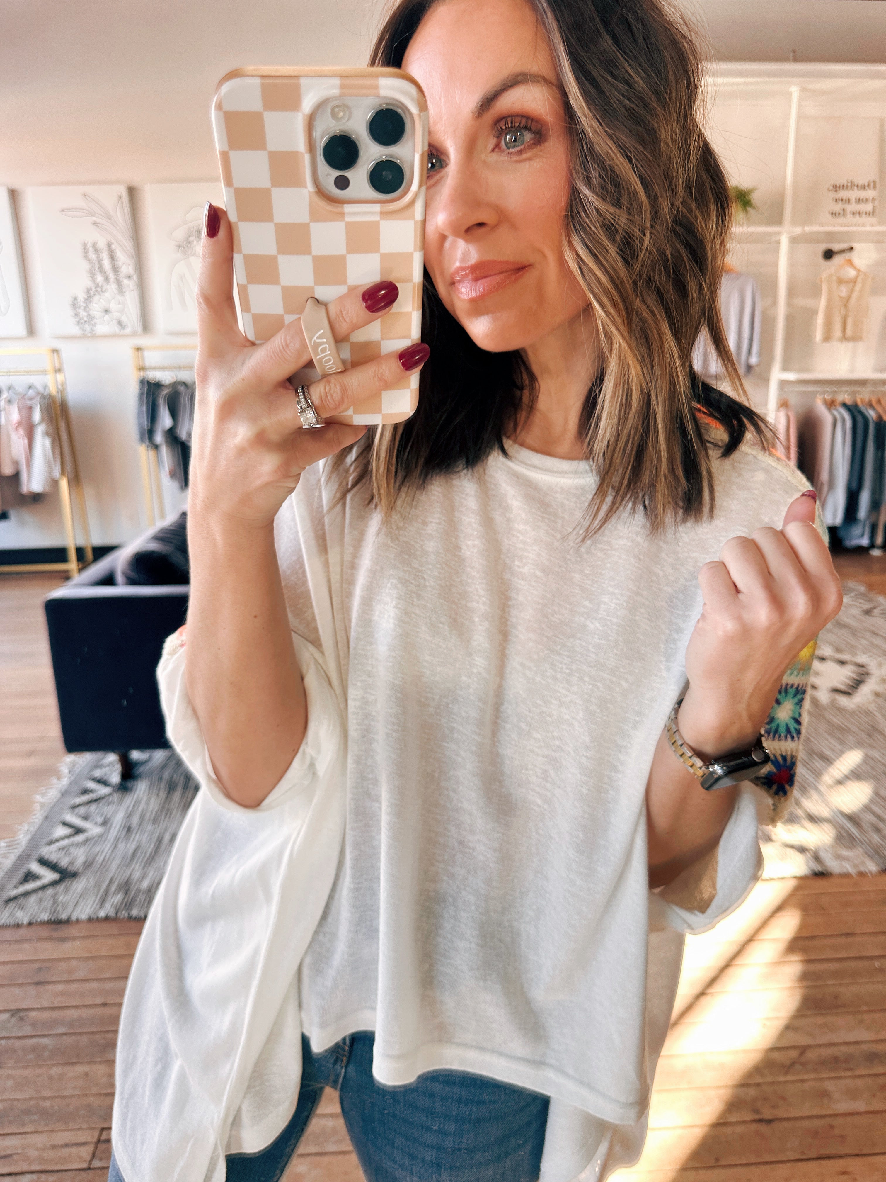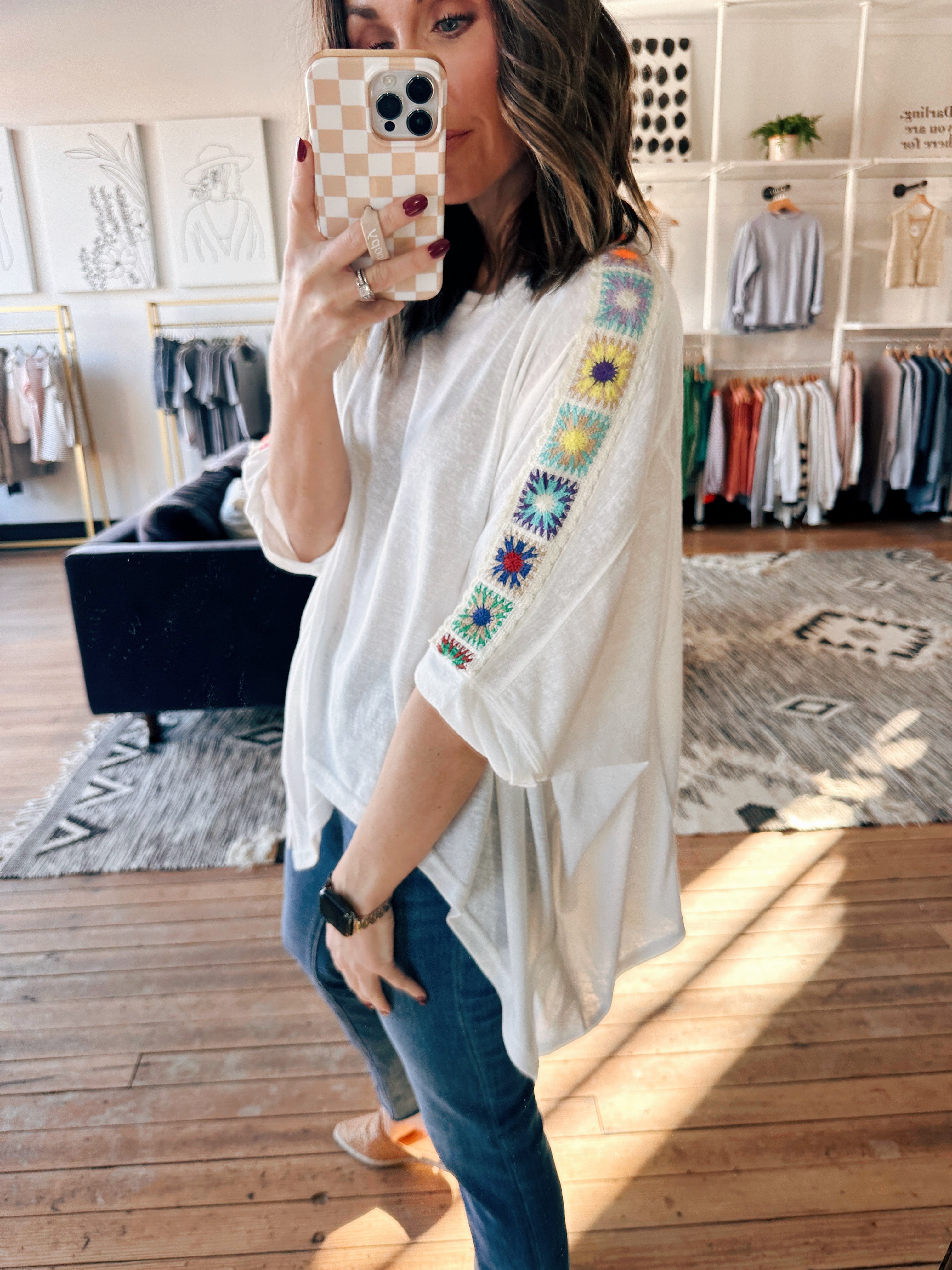 This cute little top comes in two colors, both with fun colorful crochet detailing down the sleeves! This fits relaxed, but true to size, with a longer length and 3/4 sleeves.