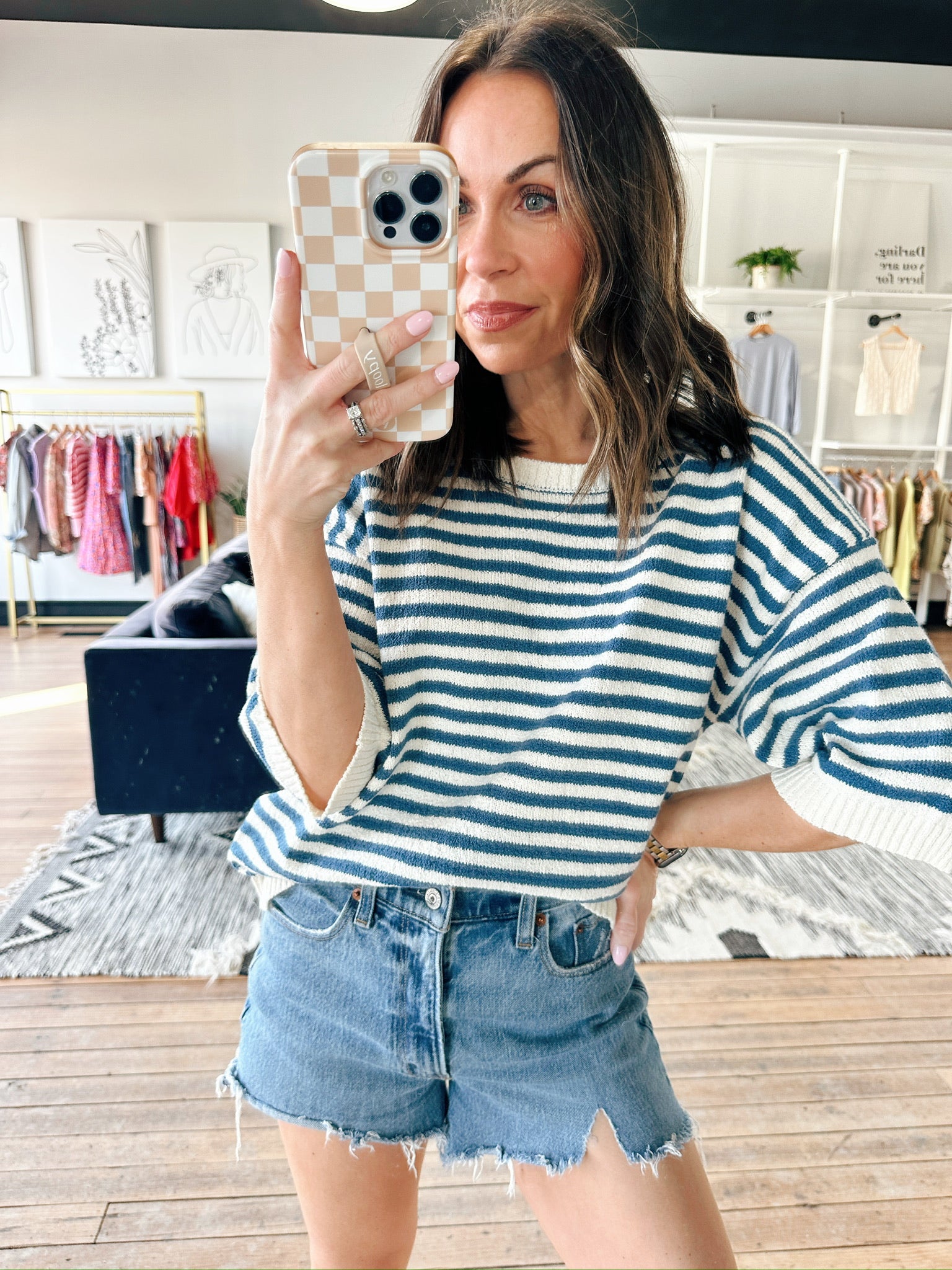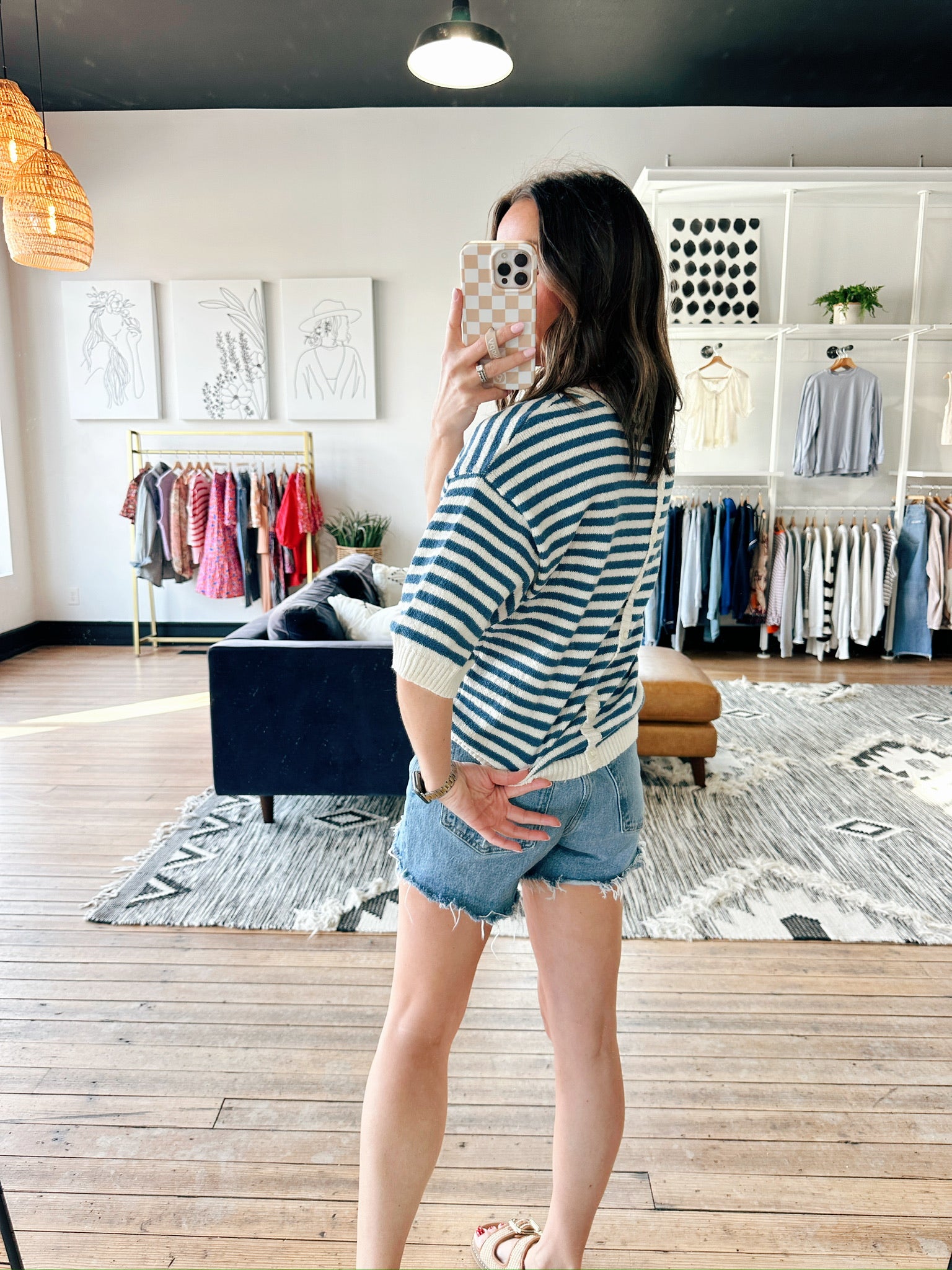 The The Workshop Amara Stripe Trim Sweater is a beautiful soft cotton-blend knit short-sleeve sweater featuring contrast stripe trim, a classic round neckline, and an easy, polished silhouette. It fits true to size with a flattering, comfortable shape — perfect for casual workdays, brunch, errands, or everyday wear. Made from a lightweight, breathable sweater knit, this piece adds an effortless yet elevated touch to denim or tailored bottoms.