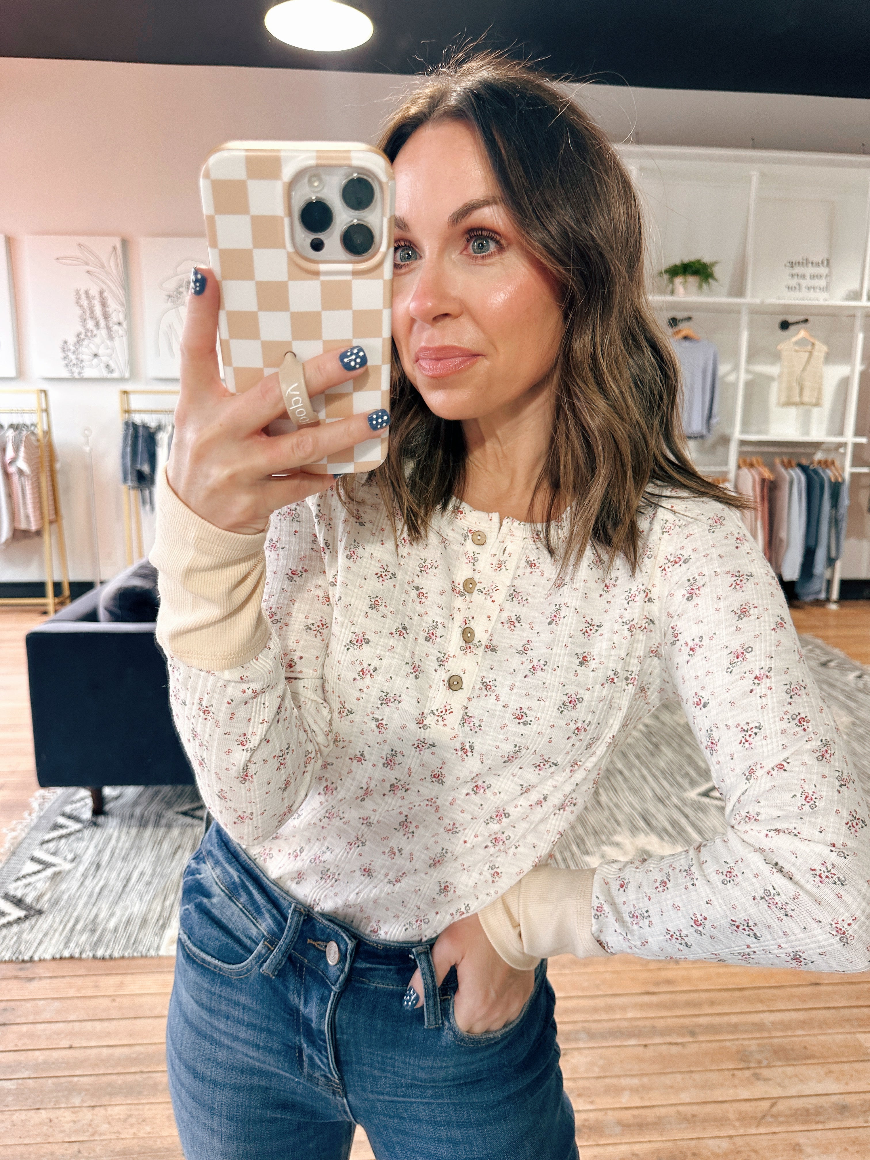 The Anniewear Ava Floral Variegated Top is a beautiful floral print ribbed knit top featuring a henley neckline, button-down front, and contrast detailed sleeves.