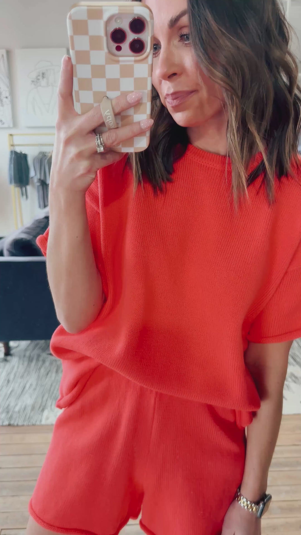• Features: Raw edge sweater knit, drop shoulder top, elastic waistband shorts, soft and breathable feel
