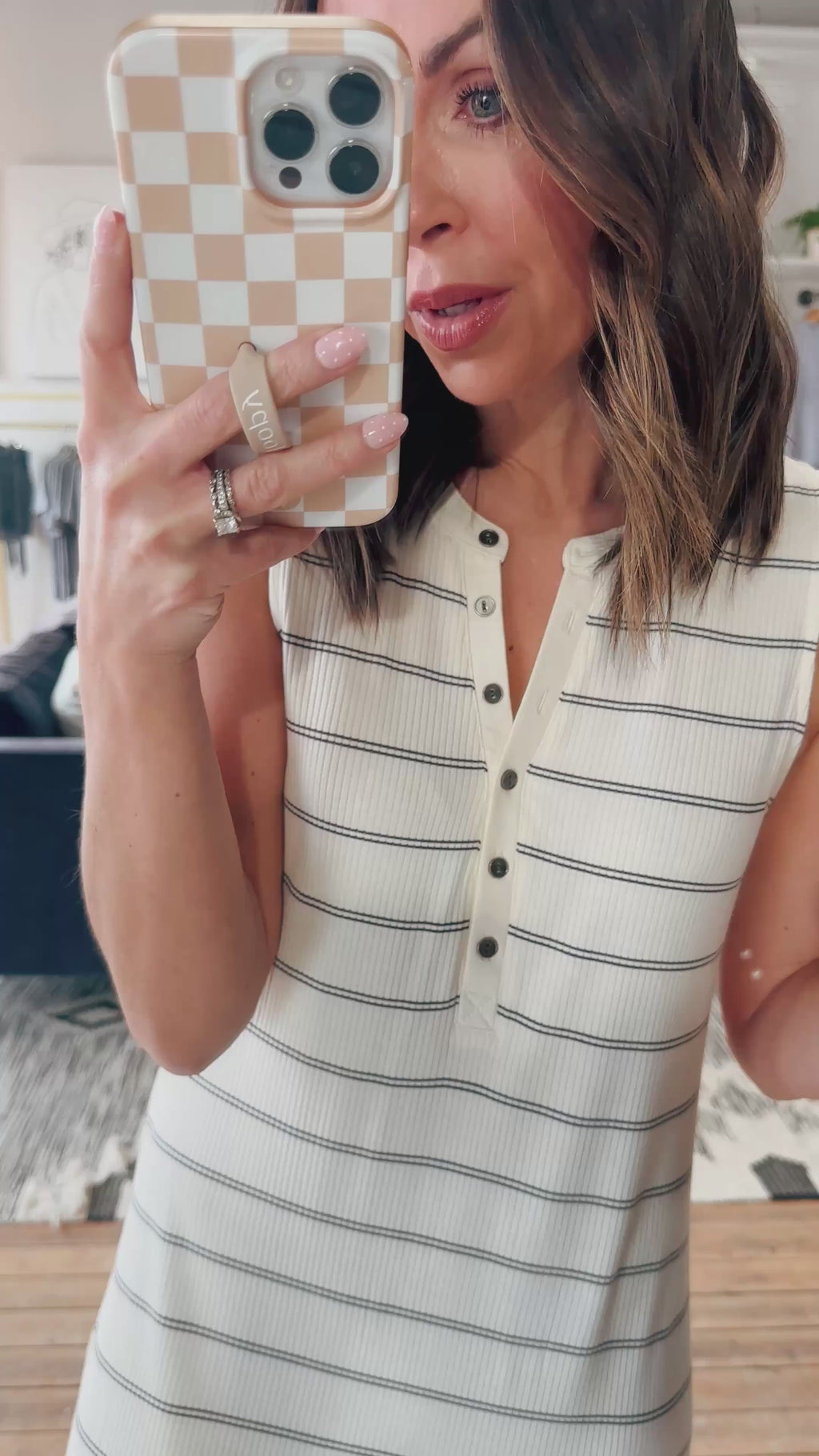 • Features: Sleeveless design, V-neckline, half button-front closure, side slits, soft and stretchy knit feel