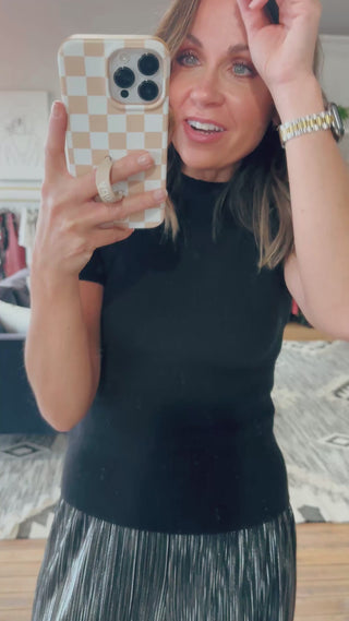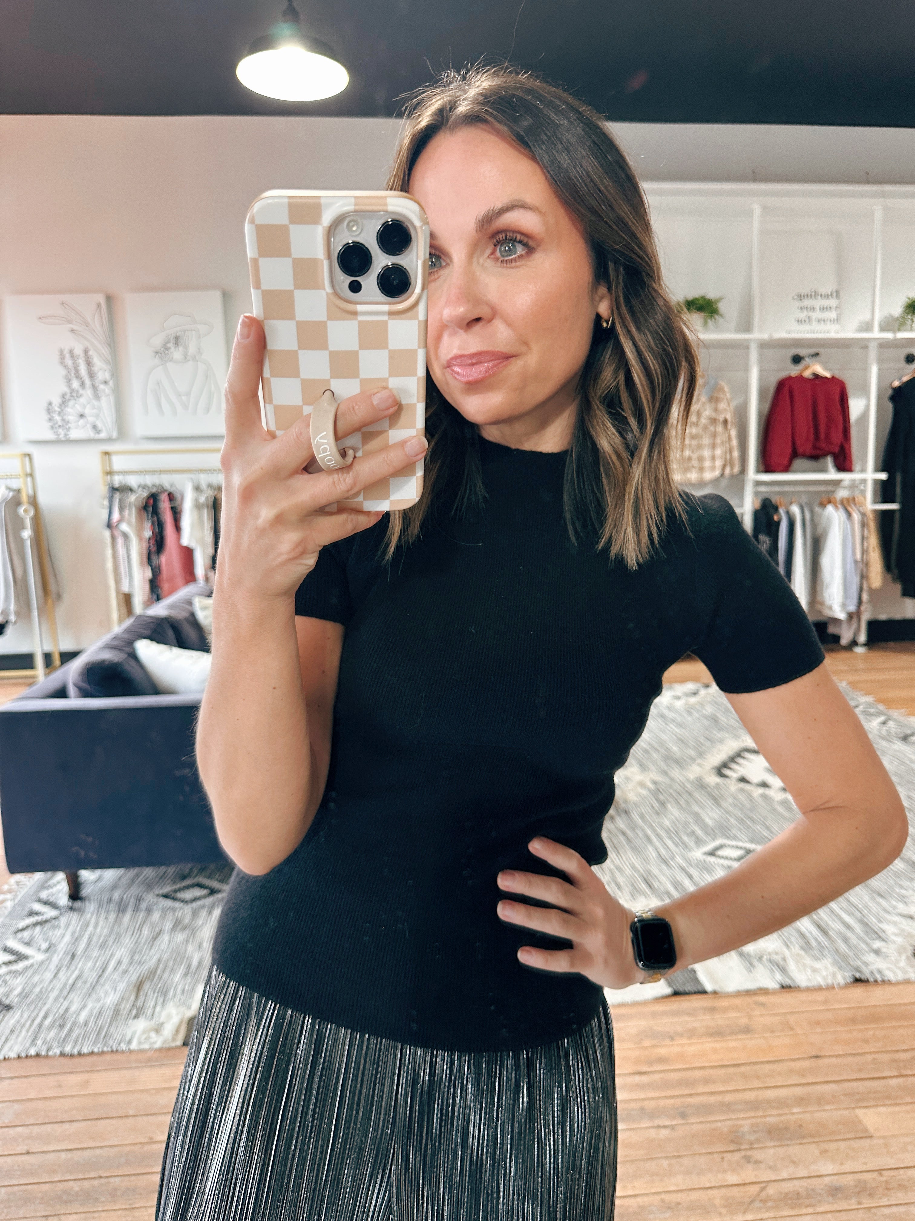 This is a great classic rib knit top to have for tons of outfits year round! This fits true to size with a mock neck, short sleeves and is a black color. This top is a fitted style that will look great tucked with fun flowy pants, skirts and even simply with denim!