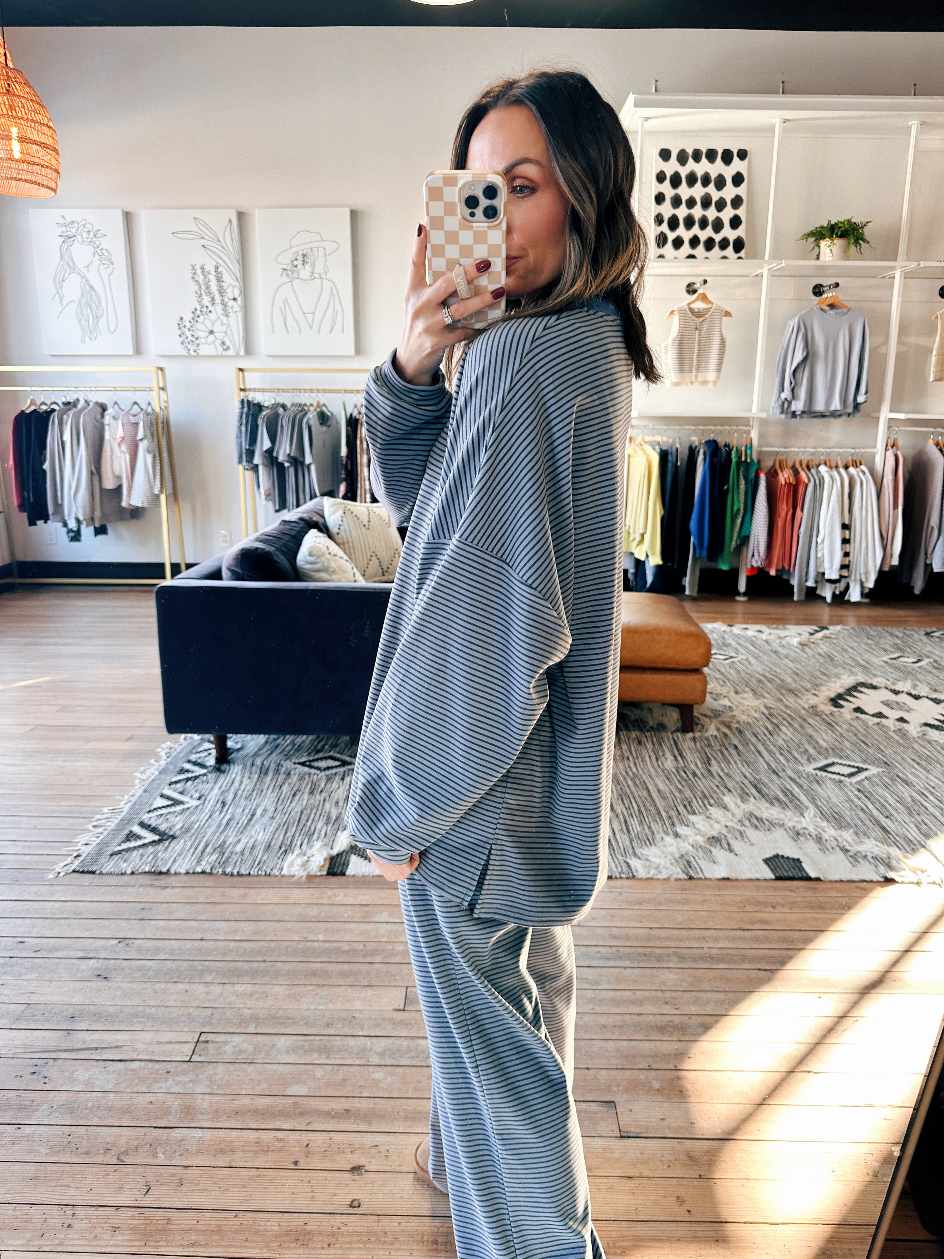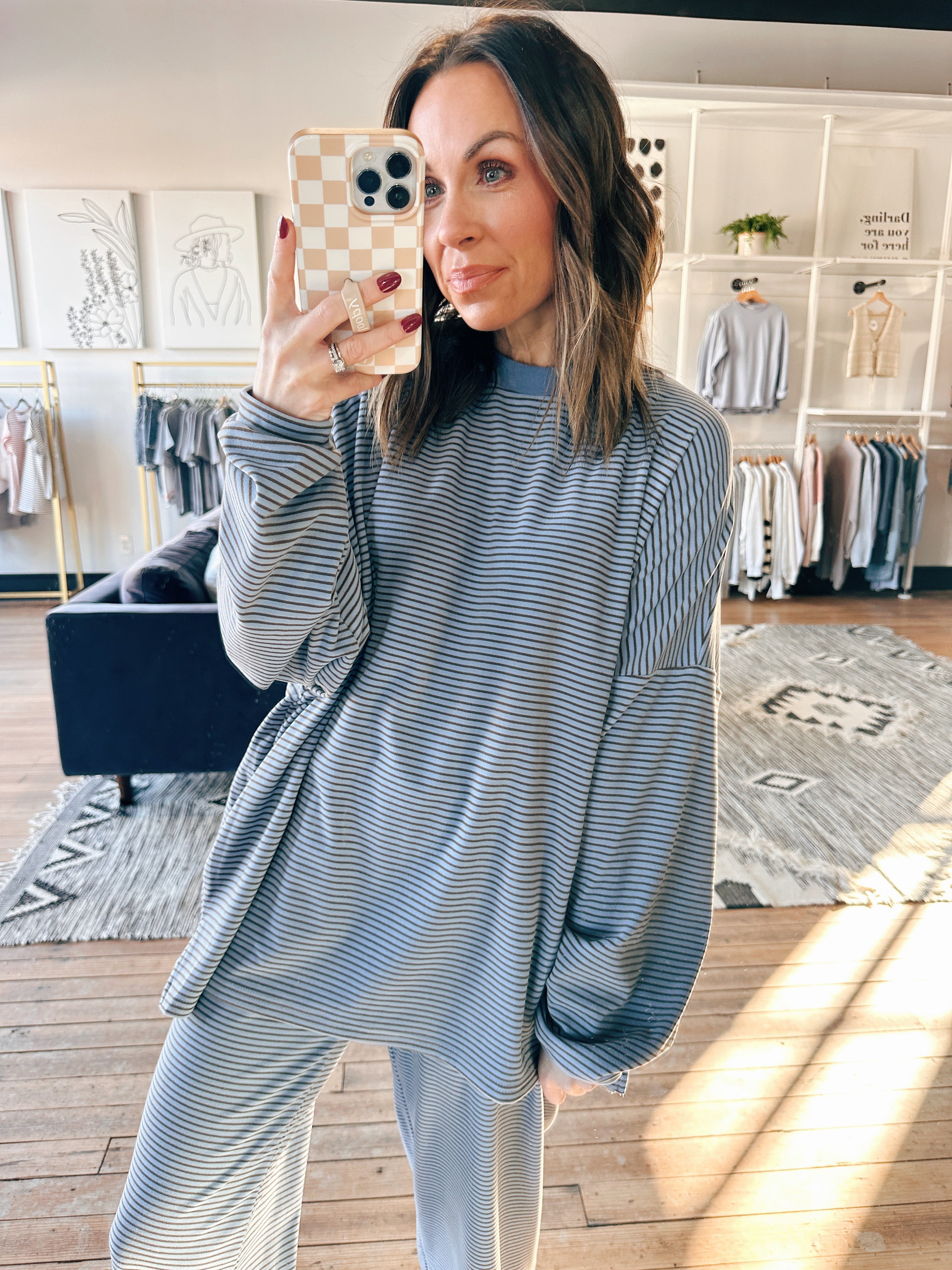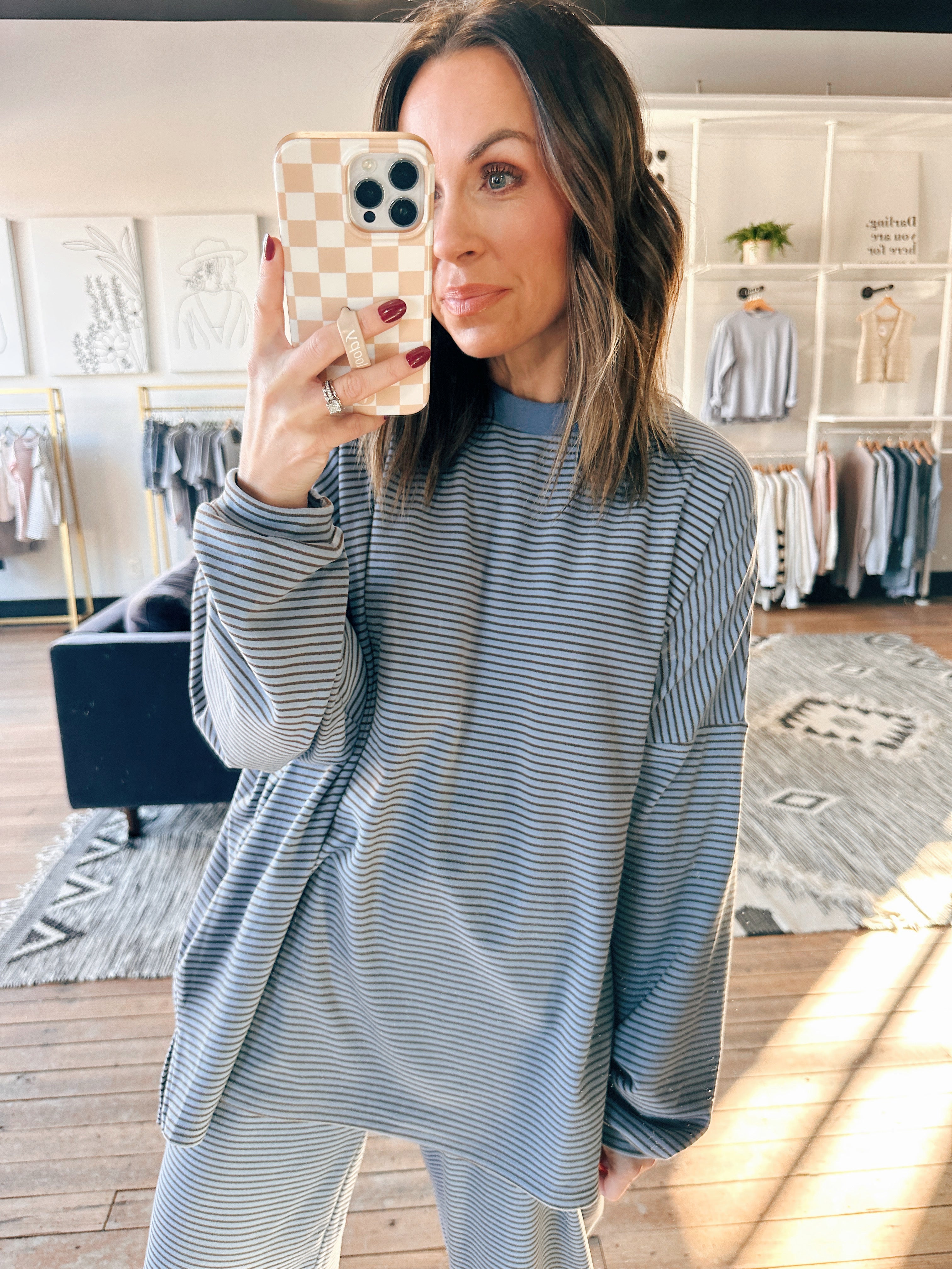 • Features: Striped design, oversized fit, soft and cozy feel, easy everyday silhouette