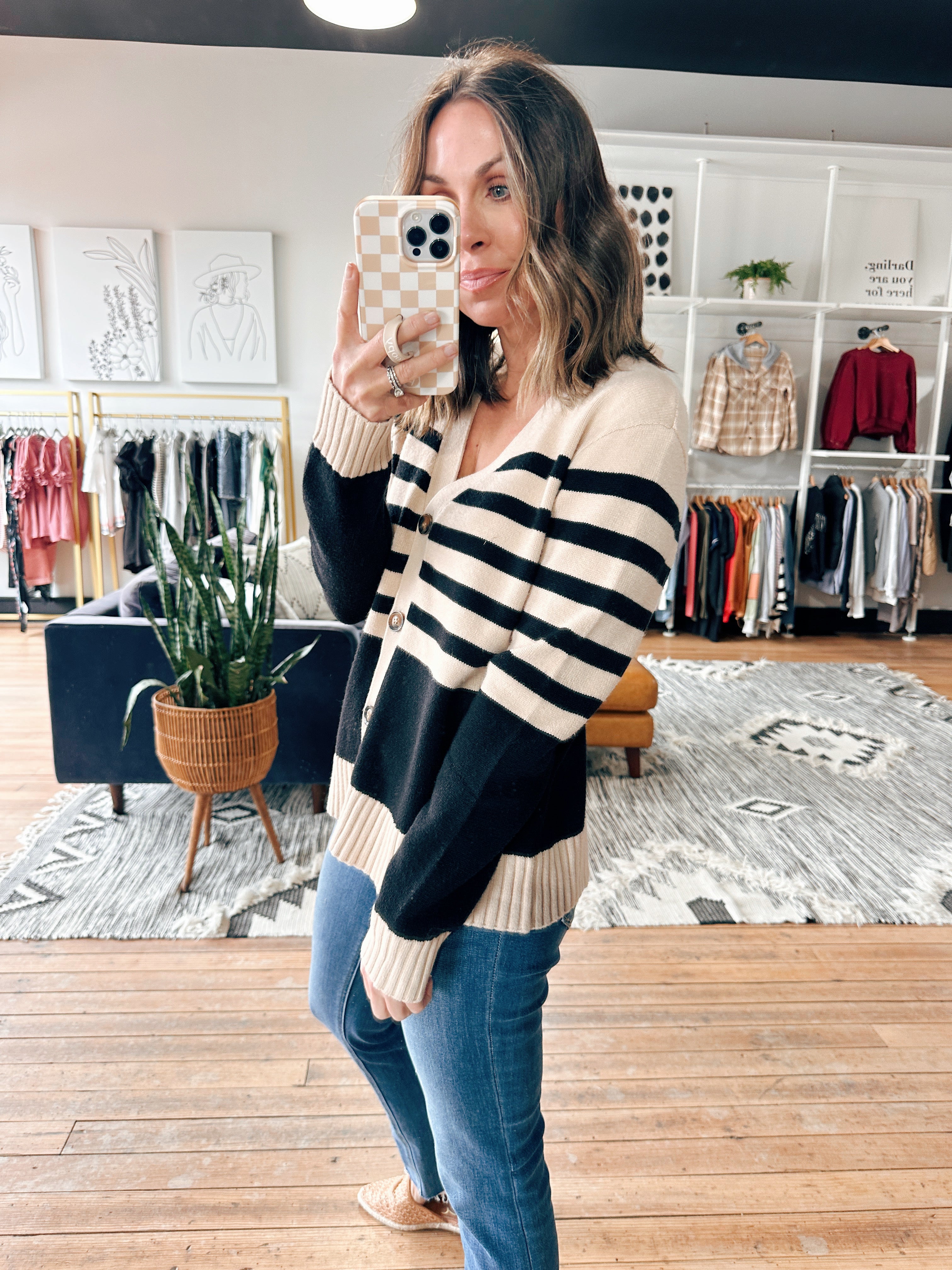 The Maren Button Down Striped Sweater Cardigan is a cozy-chic essential for women’s fall and winter fashion. Crafted from soft knit fabric, this long sleeve cardigan features a classic button-down front and timeless stripe pattern for a polished, versatile look. Perfect for layering, or wearing buttoned up, it delivers a comfortable yet stylish outfit ideal for casual, office, or weekend wear.