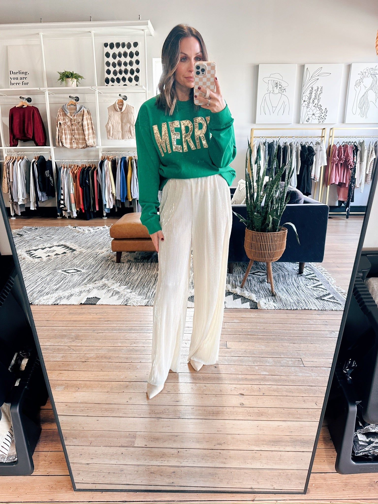 Shine bright this season in our “Merry” Sequin Sweatshirt — the perfect mix of cozy and festive chic! Designed in a relaxed fit, this soft knit sweatshirt features sparkling sequin lettering that adds a touch of holiday glam. Effortlessly pairs with jeans or skirts for that casual yet stylish winter look. True to size.