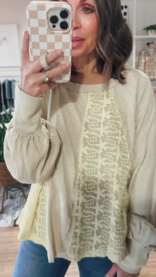 The Mikayla Contrast Pullover is a chic and cozy addition to your wardrobe. Crafted from soft cotton jersey knit, this long sleeve pullover features a round neckline and delicate lace contrast detailing for a subtle, boho-inspired feminine touch. Perfect for fall and winter, it pairs effortlessly with jeans, skirts, or leggings for a casual yet stylish everyday look.