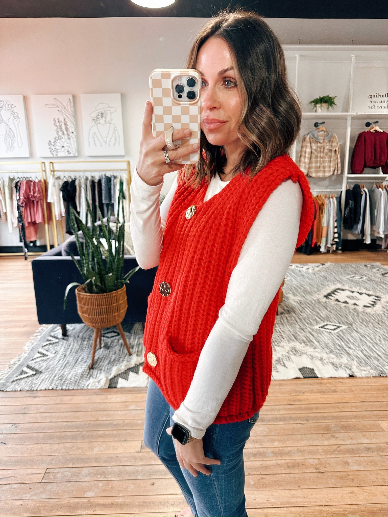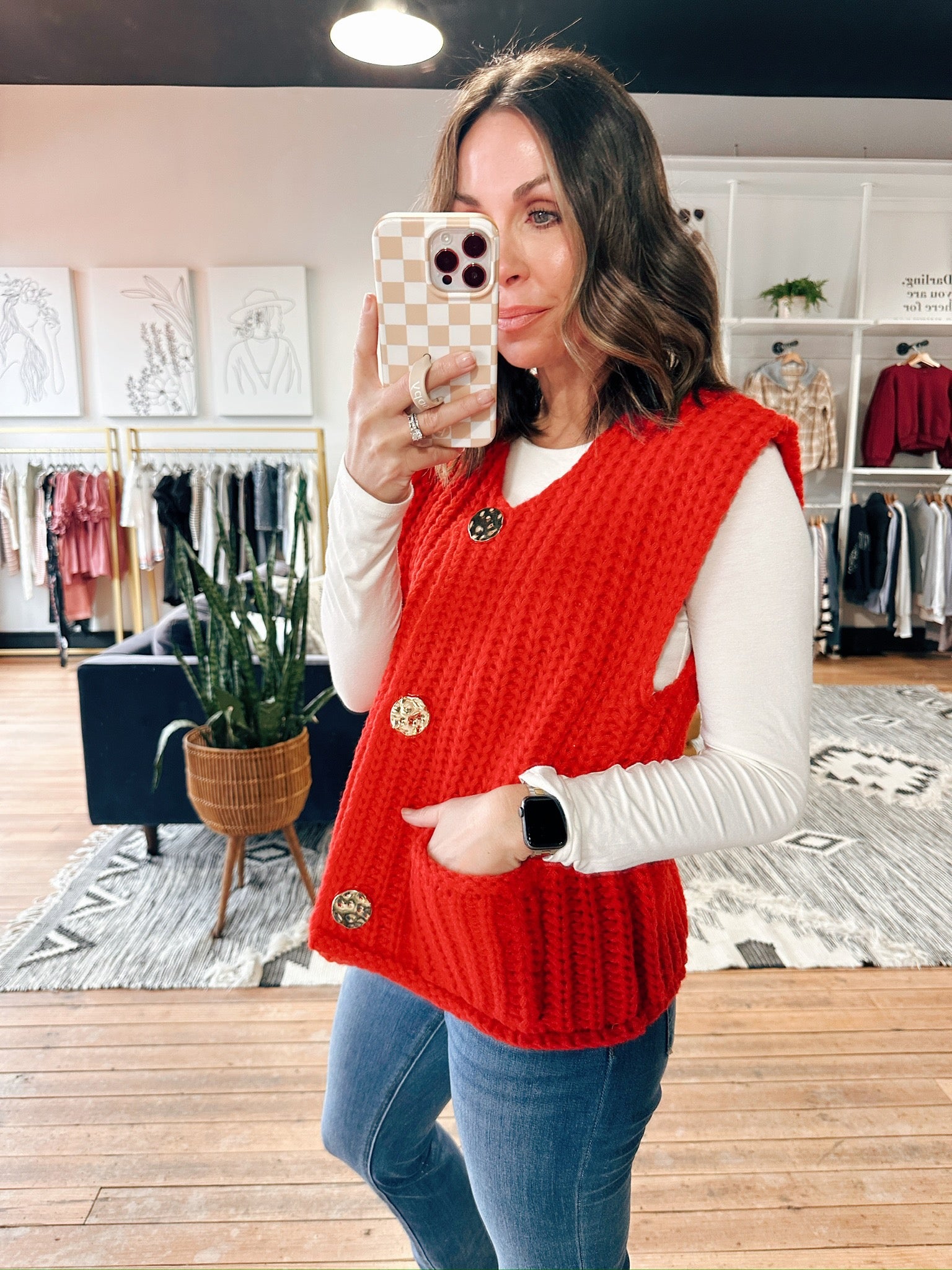 The Red Sleeveless Chunky Sweater Vest is a must-have for women’s cozy fall fashion. Designed with a chunky knit texture and a relaxed, sleeveless style, this vest layers perfectly over shirts or turtlenecks for a casual yet polished look!